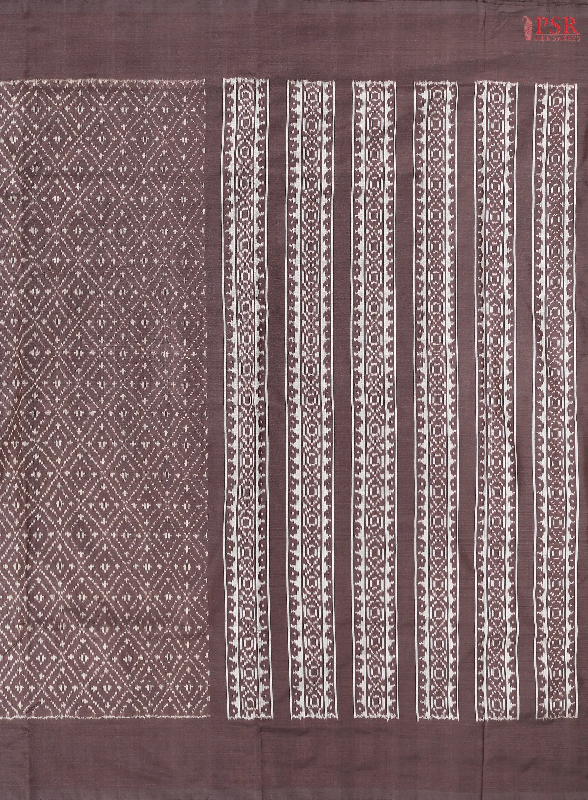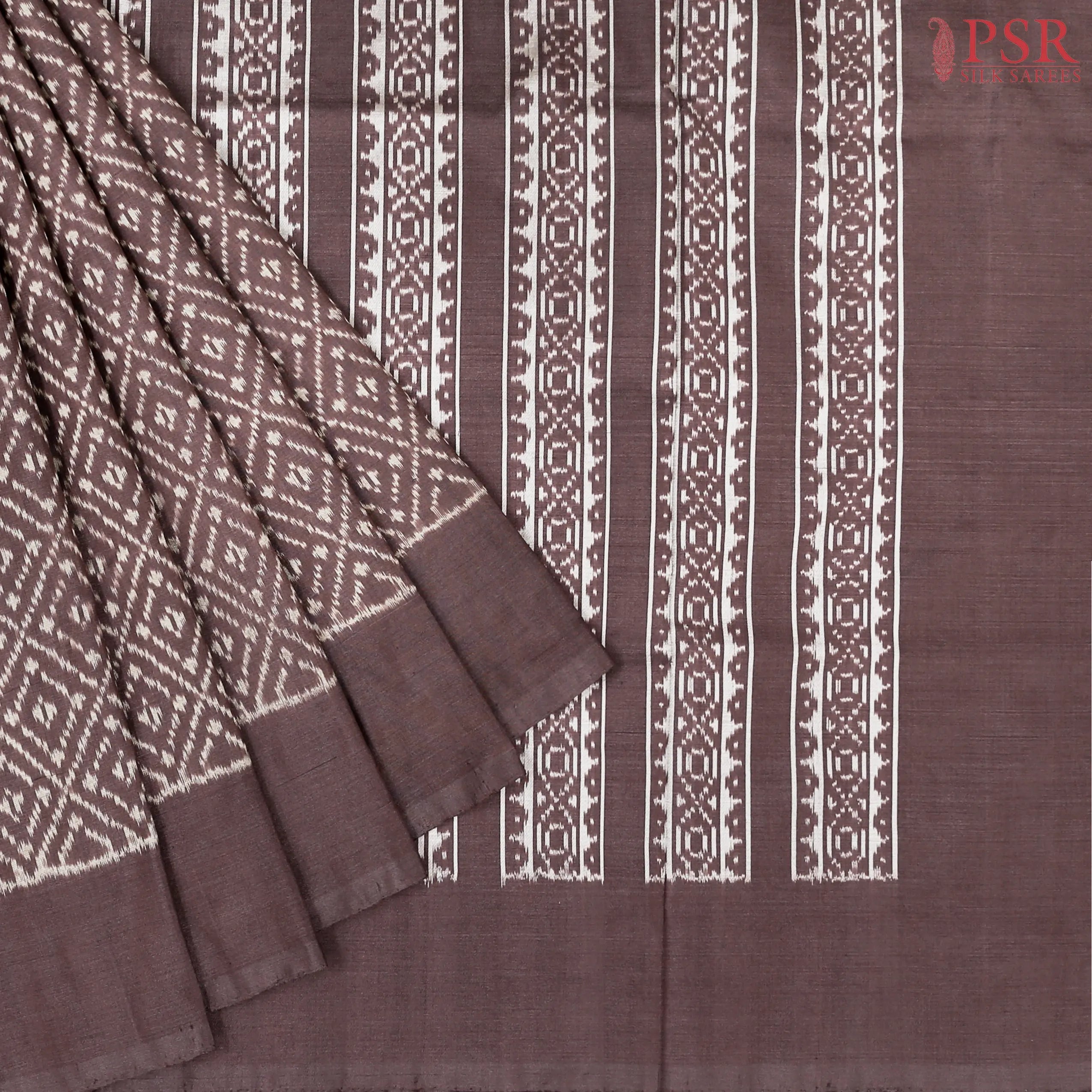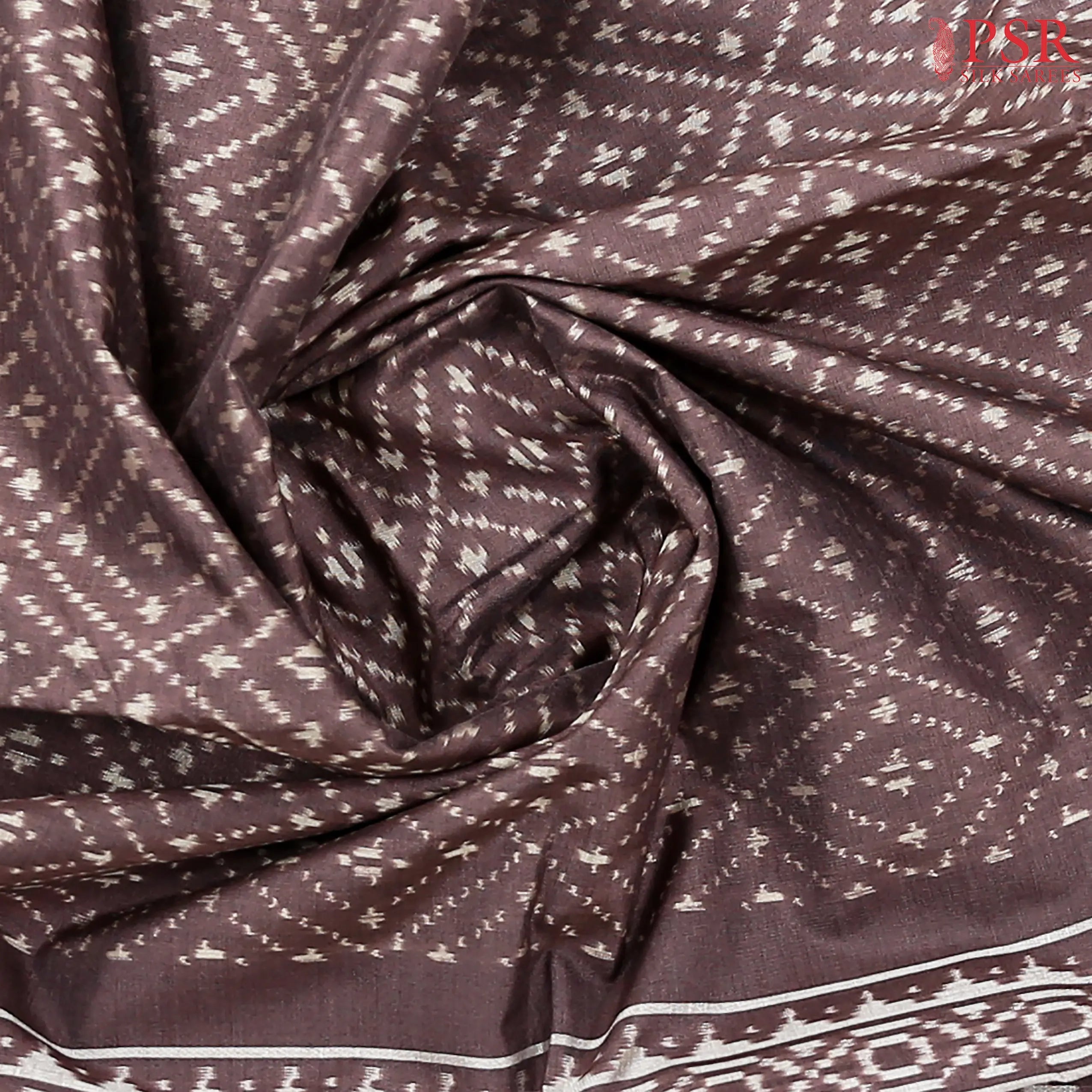 Discover timeless grace with this Brown Pochampally Silk Saree from PSR Silk Sarees. This elegant drape showcases a striking lettice pattern in traditional Ikkat weaves, adding a touch of ethnic charm to contemporary styling.