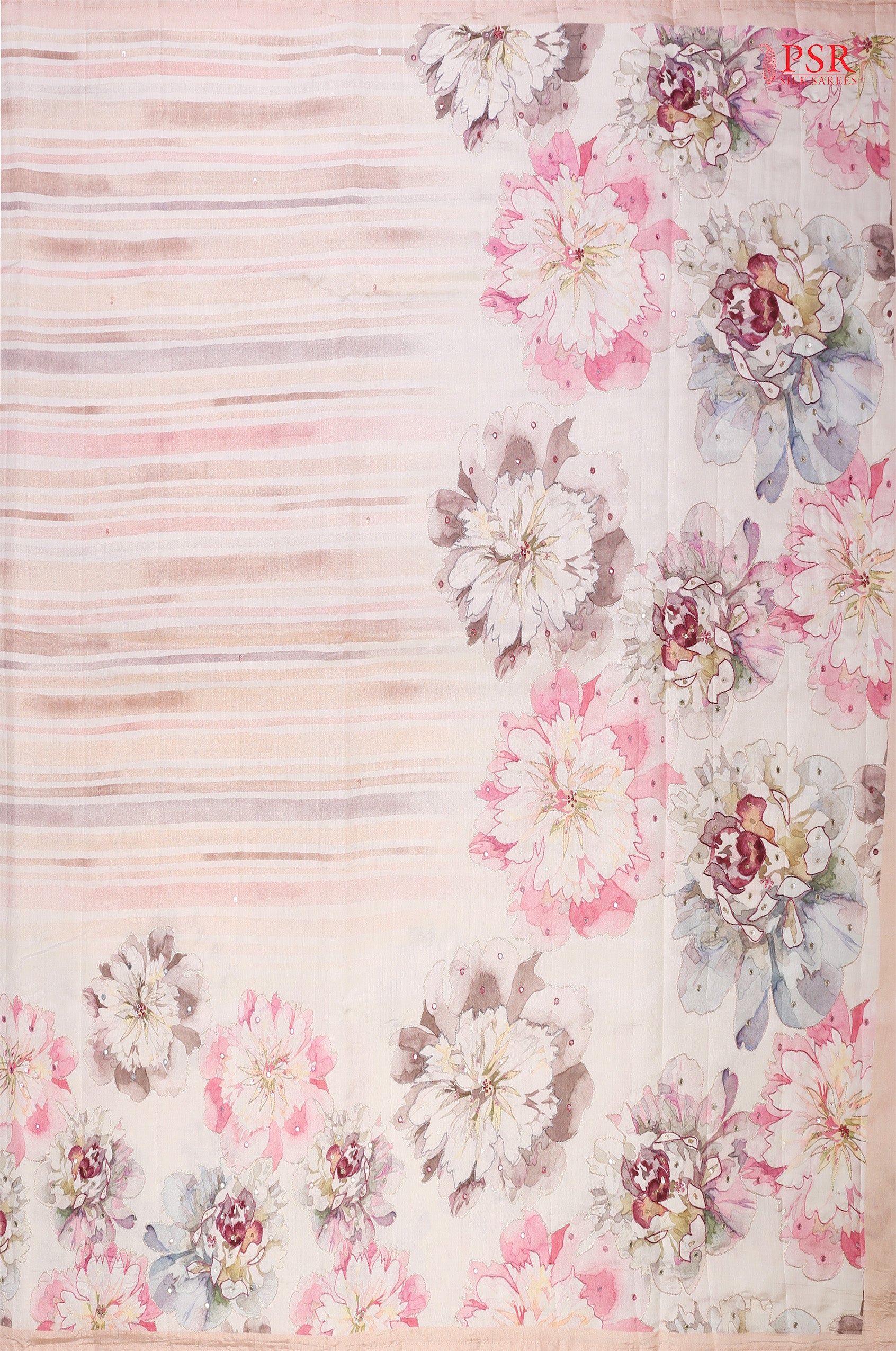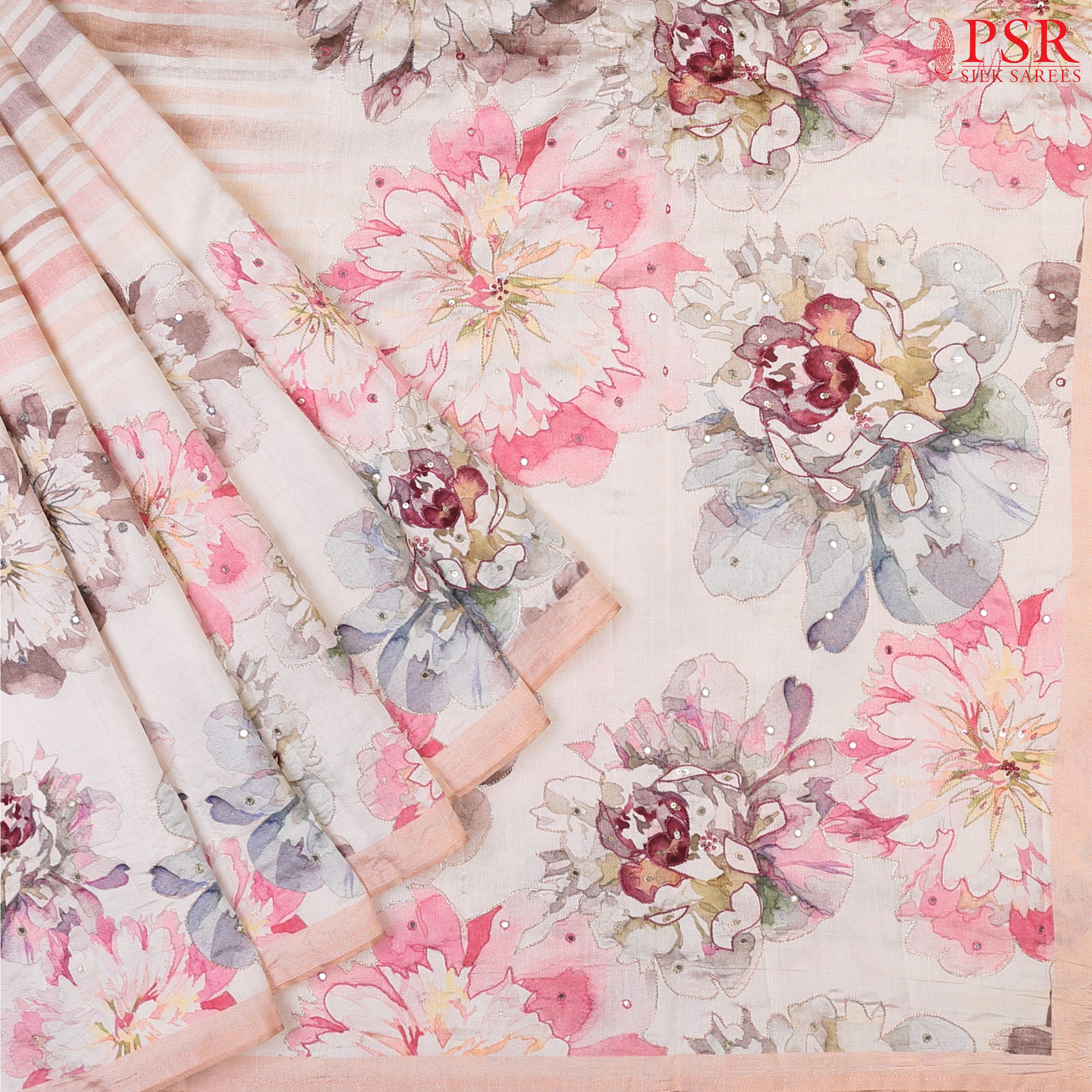 Radiate elegance with PSR Silks' Floral White & Pastel Peach Chiniya Silk Saree!