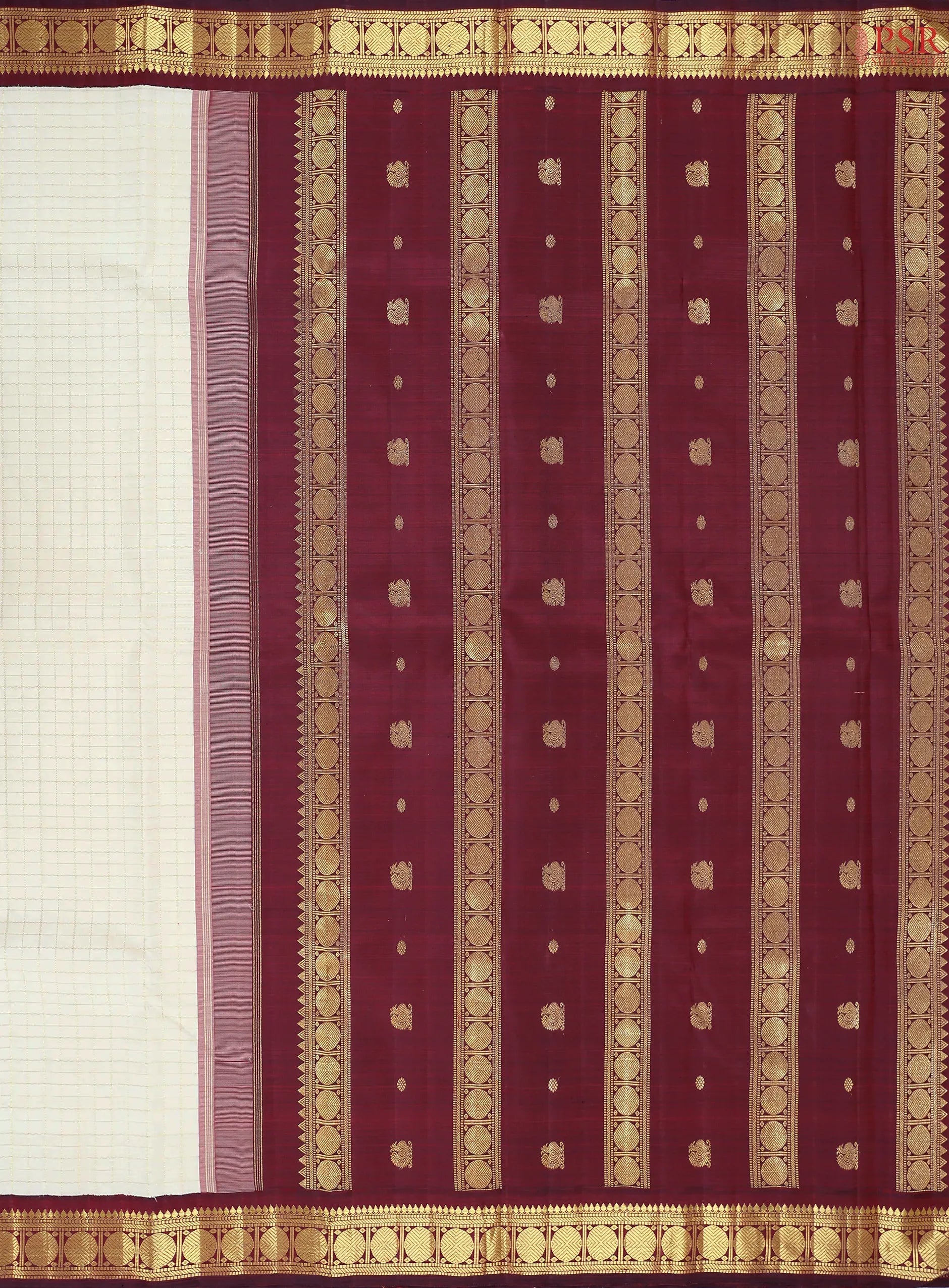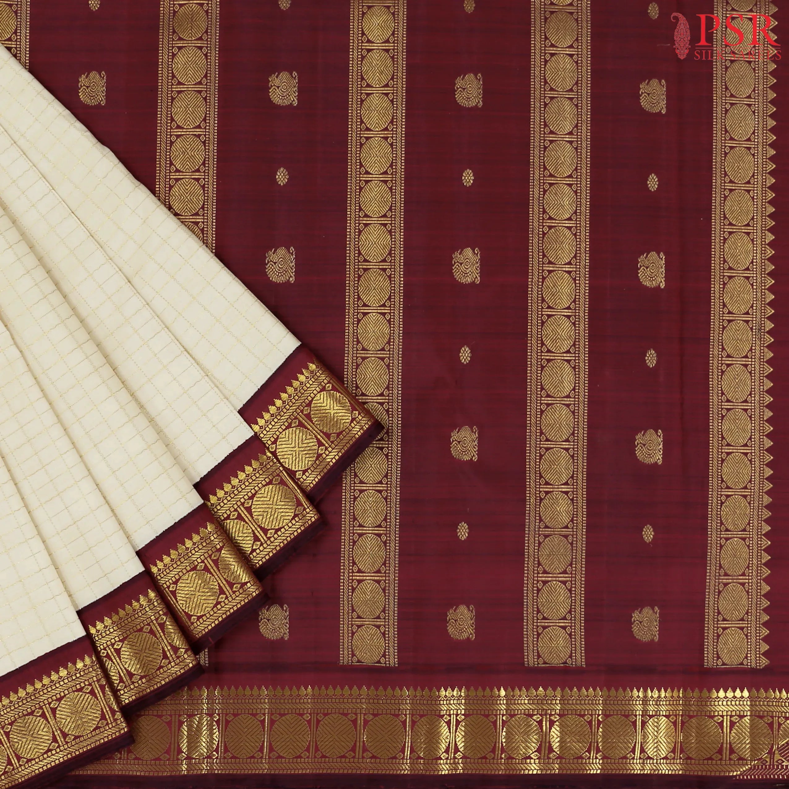PSR Silk Sarees presents an exquisite Cream Beige Pure Kanchipuram Silk Saree paired with a rich Maroon combination, radiating regal charm and traditional allure.