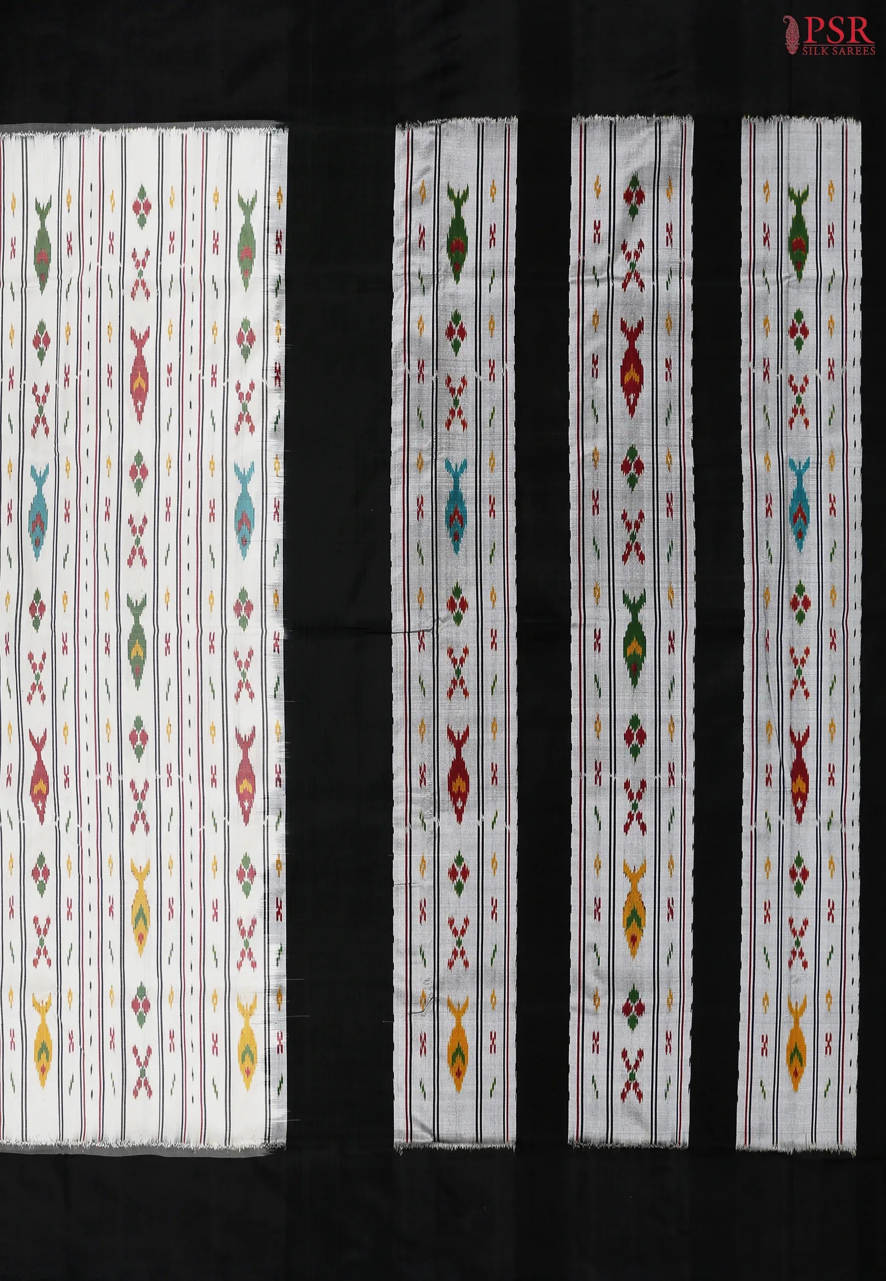 PSR Silk Sarees presents a vibrant Daisy White Pochampally Silk Saree, elegantly paired with a subtle Black contrast, celebrating the timeless charm of traditional weaving artistry.