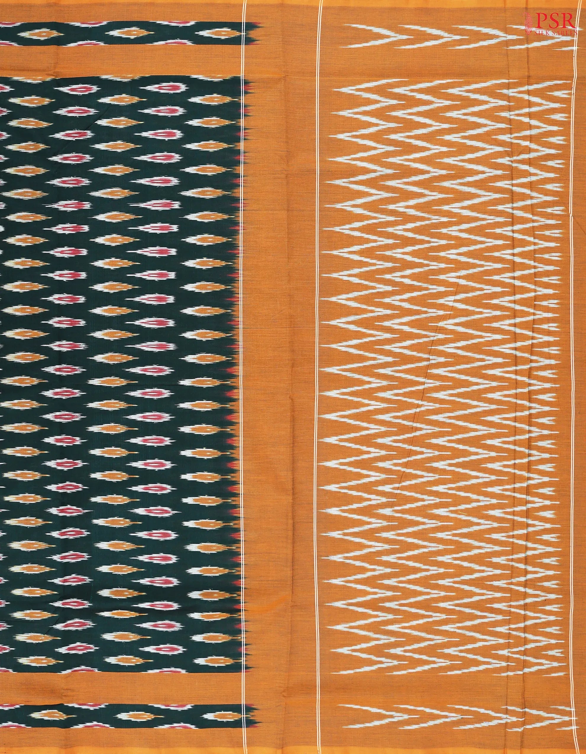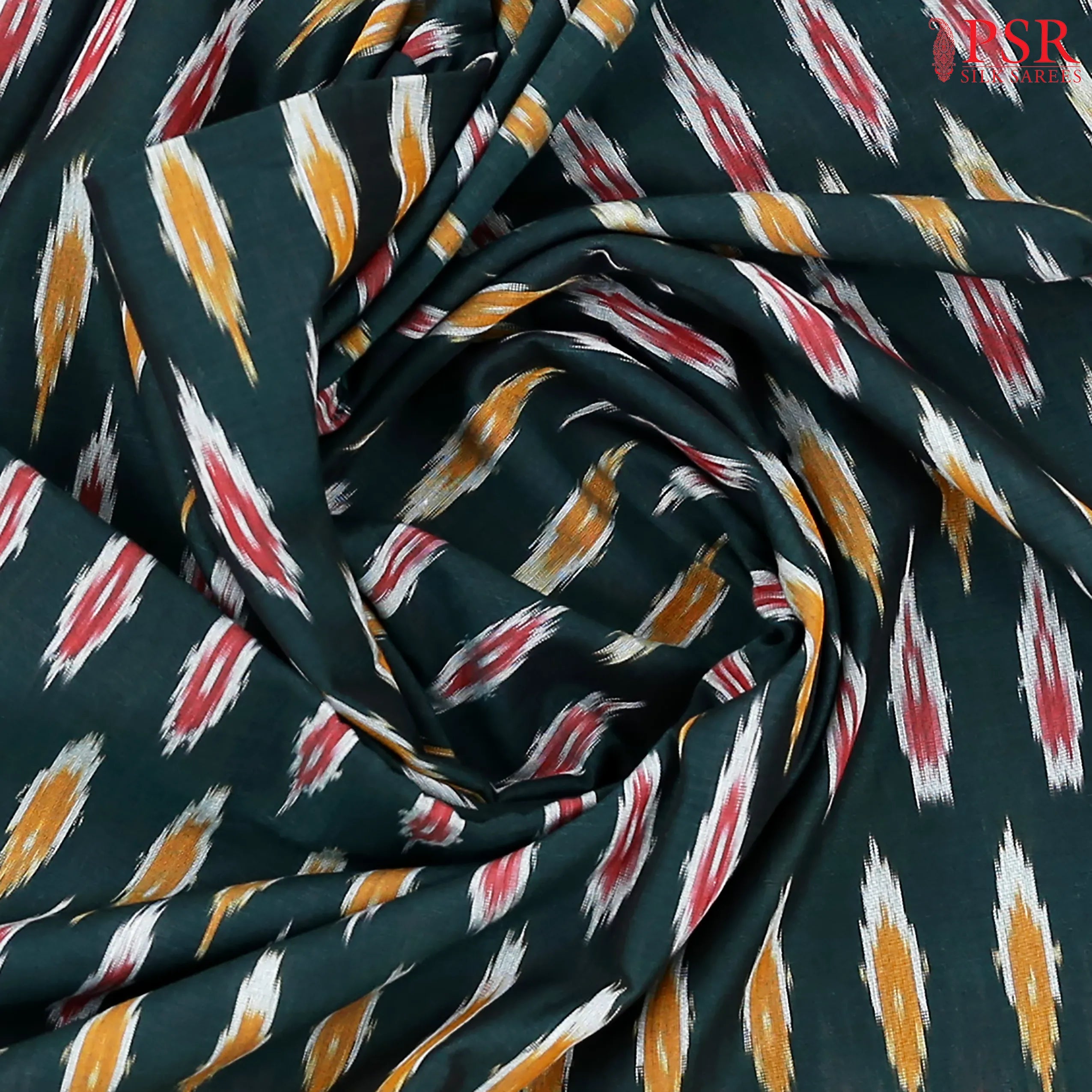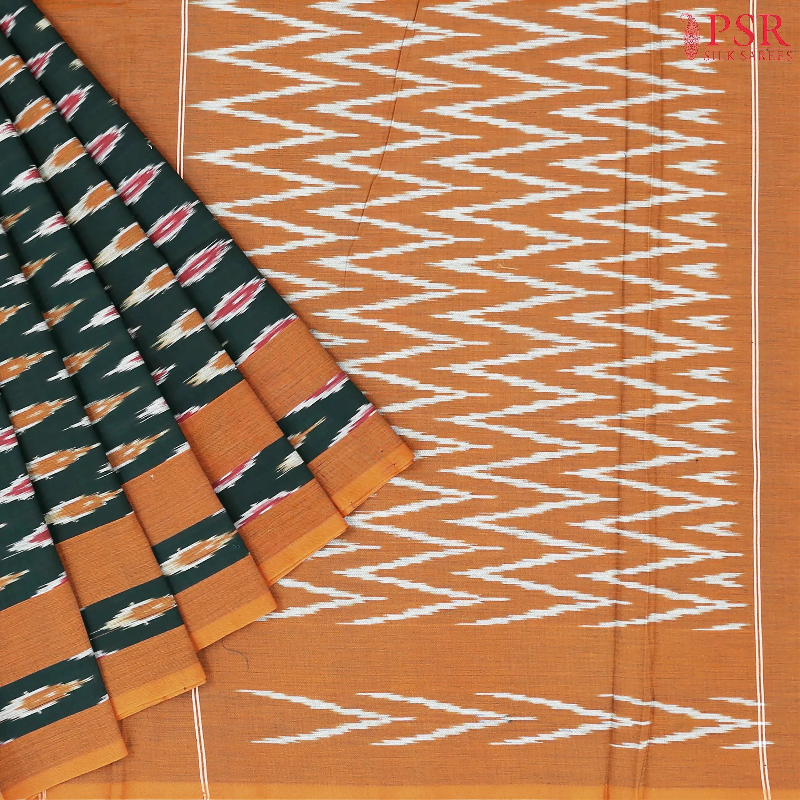 PSR Silk Sarees presents a Dark Green colored Ikkat cotton saree with combination of Dark Mustard color.