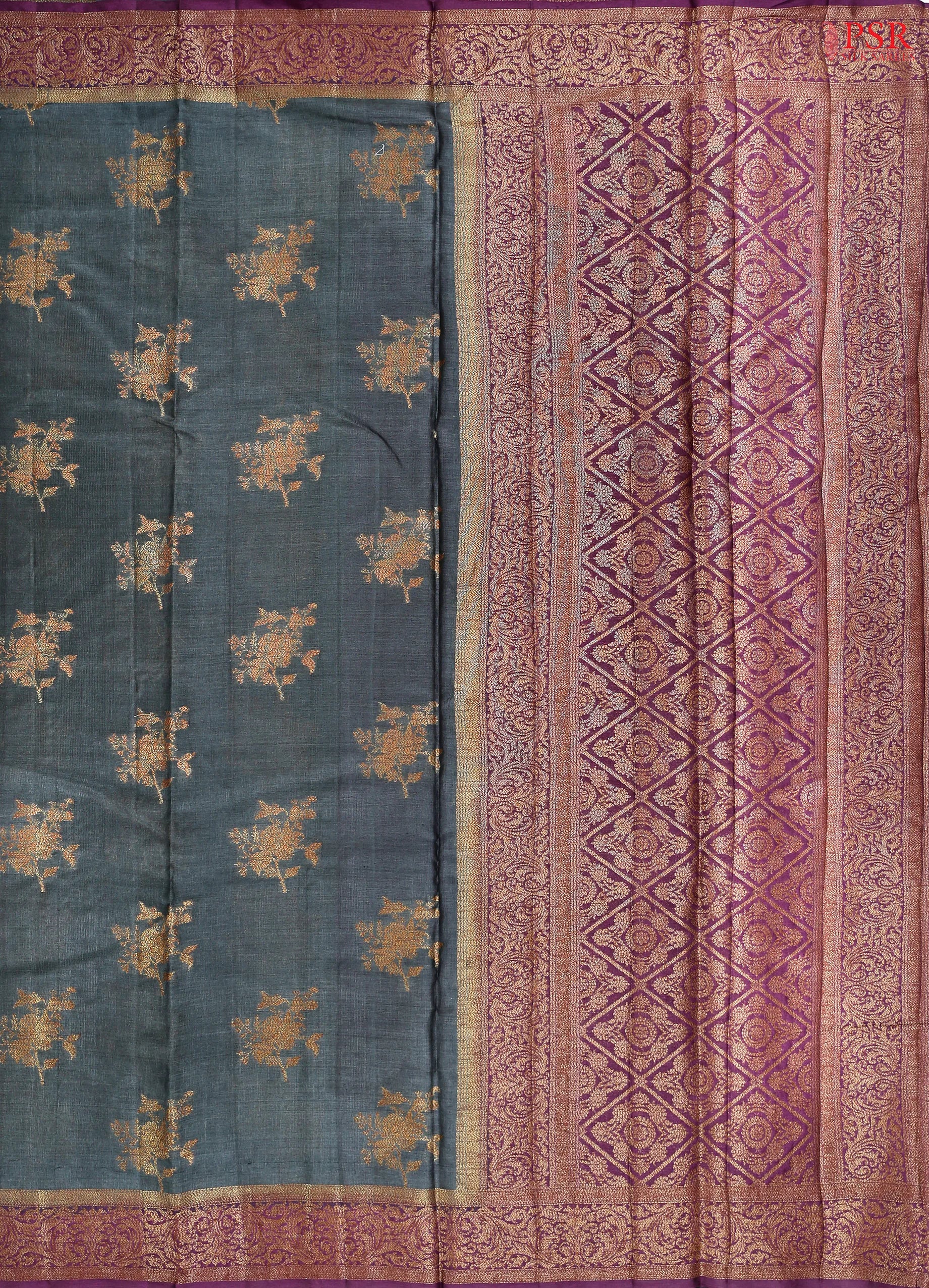 PSR Silk Sarees presents a Dark Grey delicate Banaras Tussar Silk saree, beautifully paired with an elegant Dark Purple combination.