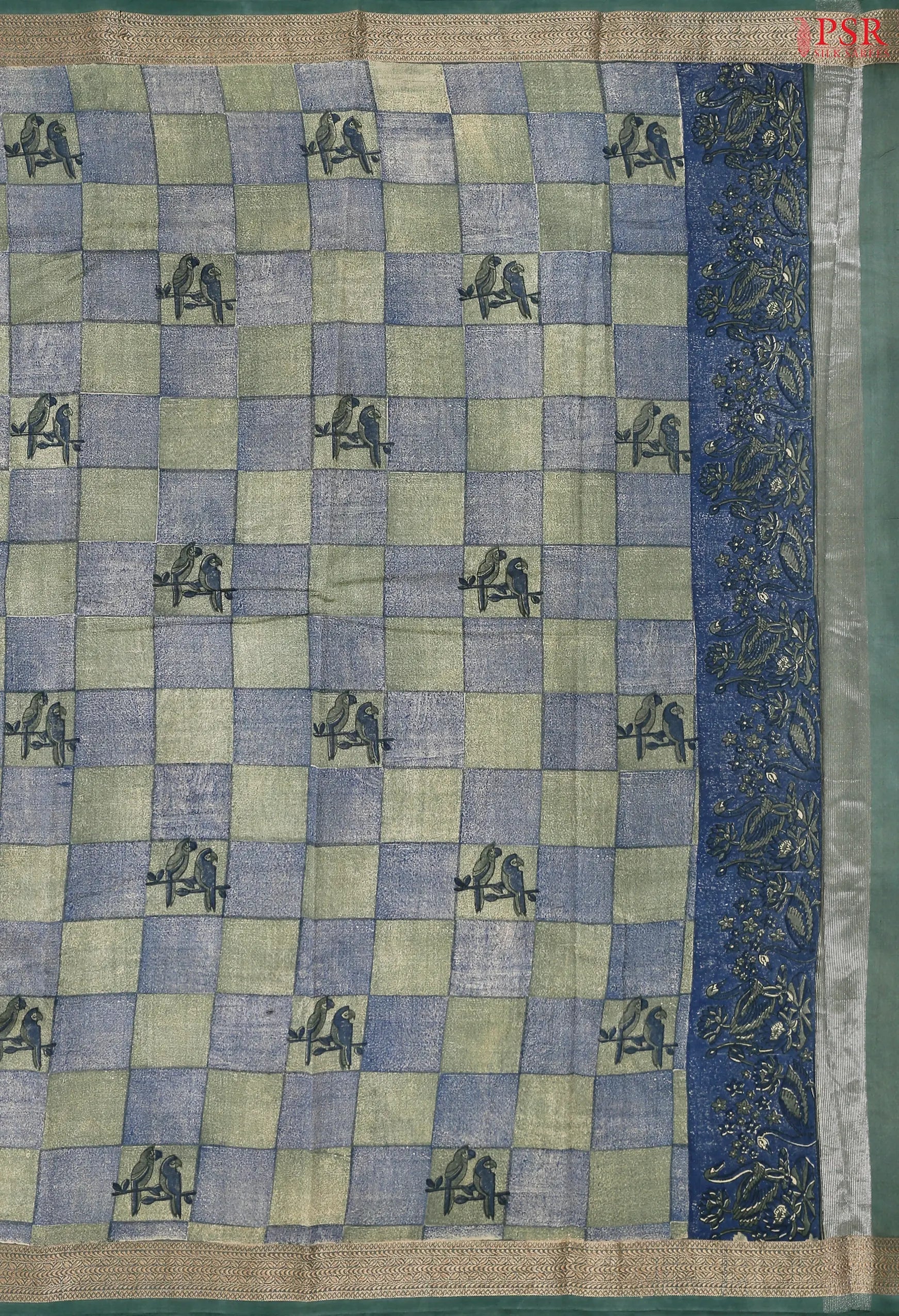 Dark Blue & Green Printed Pallu With Tissue Stripes |