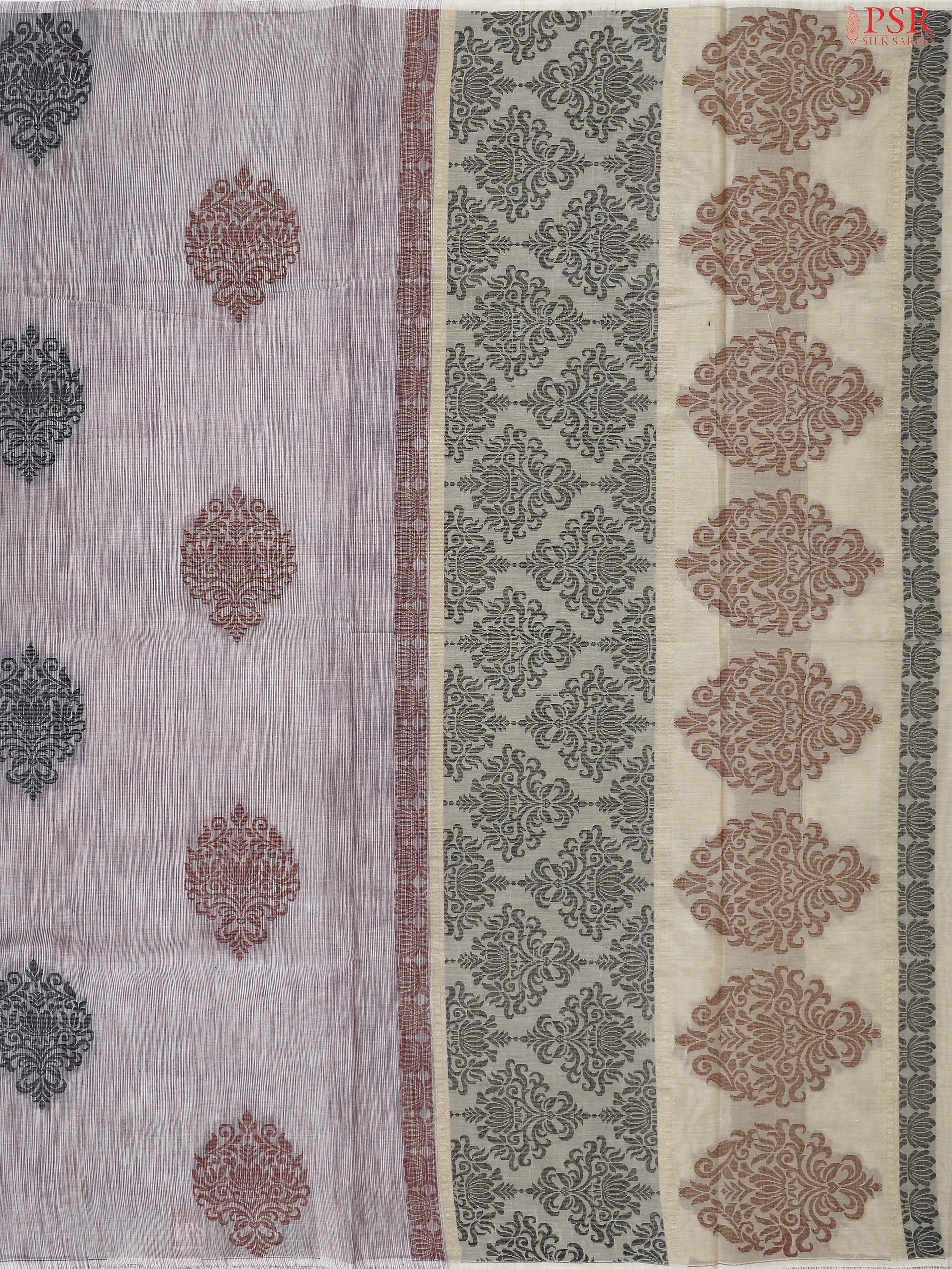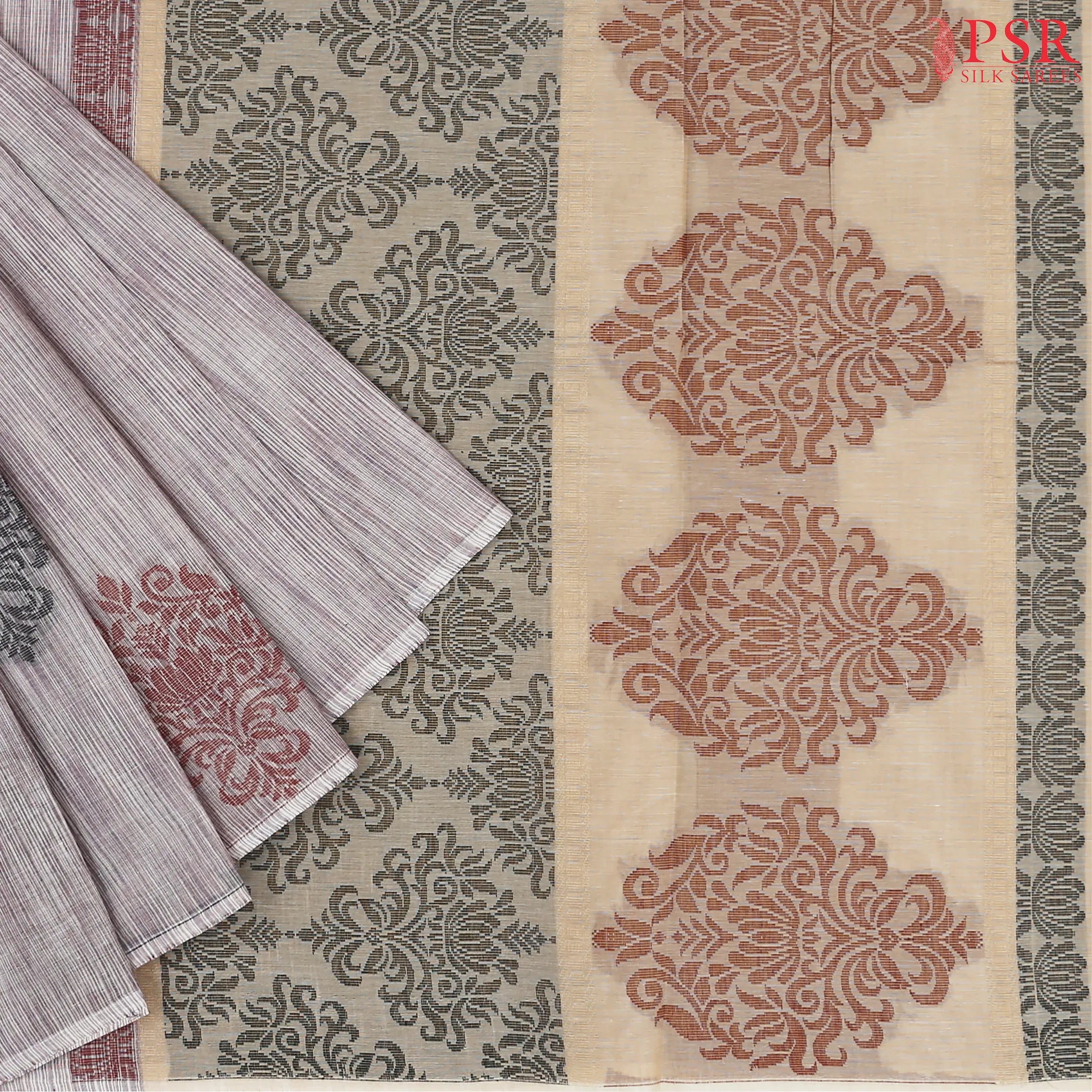 PSR Silks presents a traditional handloom Kovai Cotton saree in a captivating Dusty Mauve, beautifully weaved with Maroon & Black combination.
