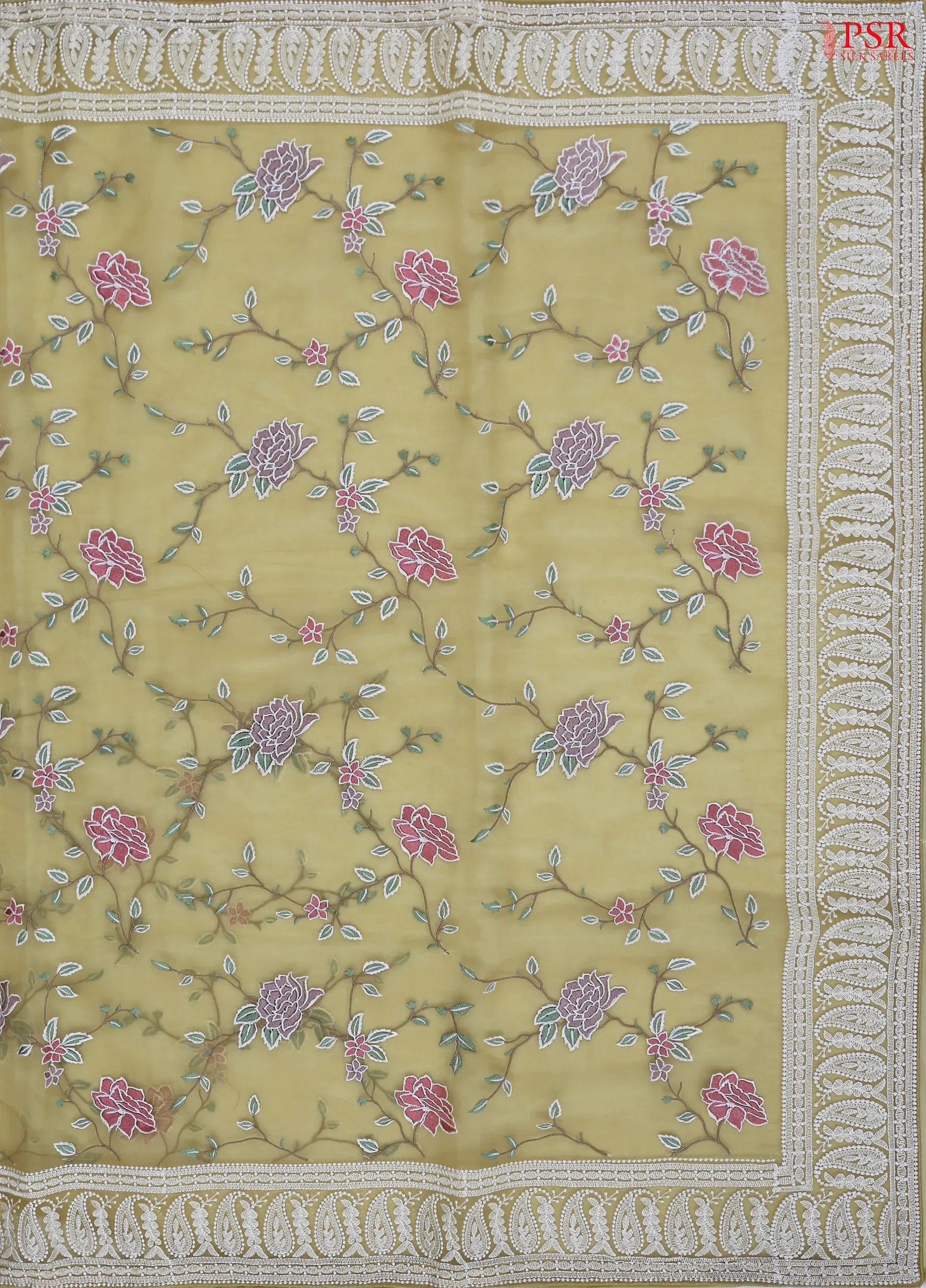 PSR Silk Sarees presents a Flax Yellow colored Organza embroidery saree.