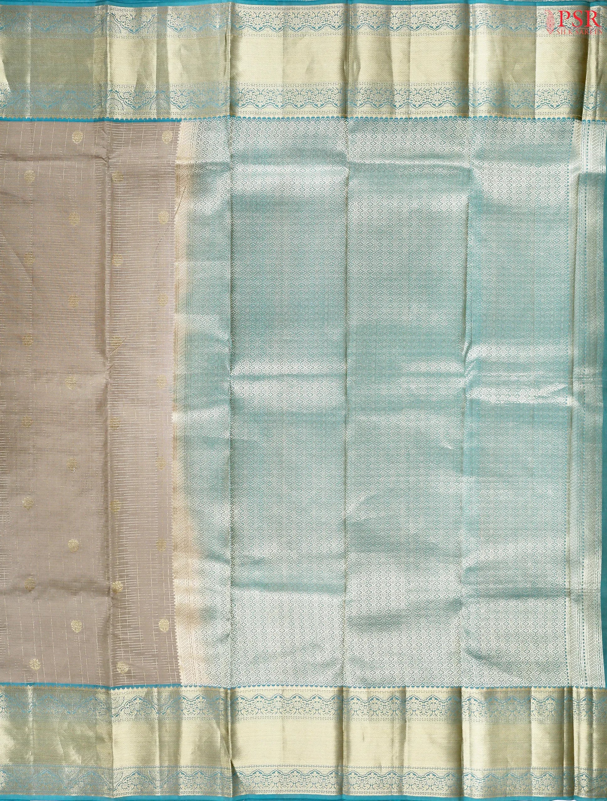 PSR Silk Sarees presents a Fossil Grey colored Fancy Kanchipuram Silk with combination of Turquoise Blue color.