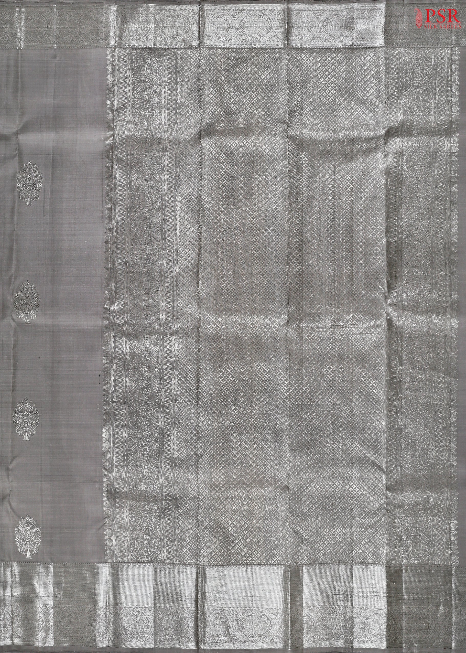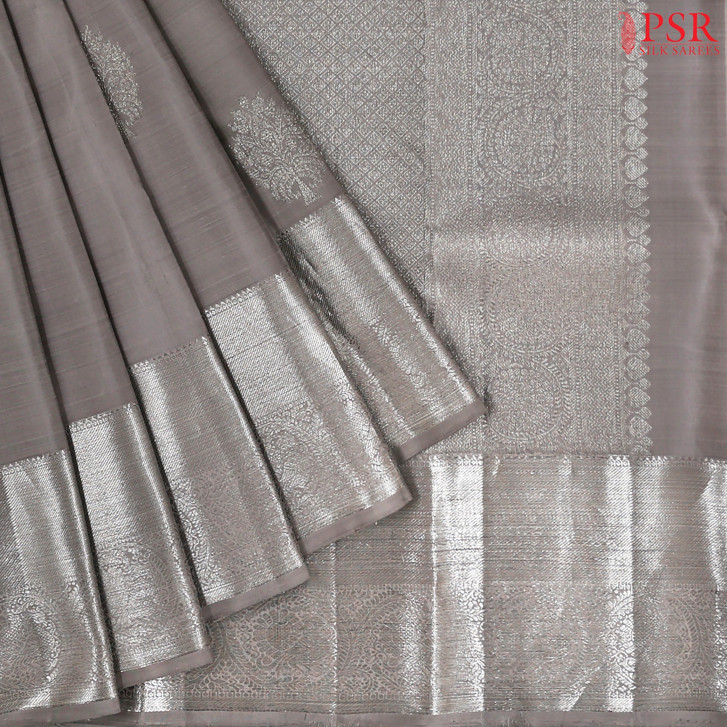 PSR Silk Sarees presents a luxurious Grey Kanchipuram Silk Saree , radiating grace and sophistication. The saree features exquisite silver zari floral brocade motifs, woven with precision to reflect the timeless artistry of Kanchipuram. A traditional zari work pallu and border add regal charm, while the plain matching blouse offers the perfect balance for versatile styling. Ideal for weddings, festive occasions, and grand celebrations, this saree embodies elegance in every detail.