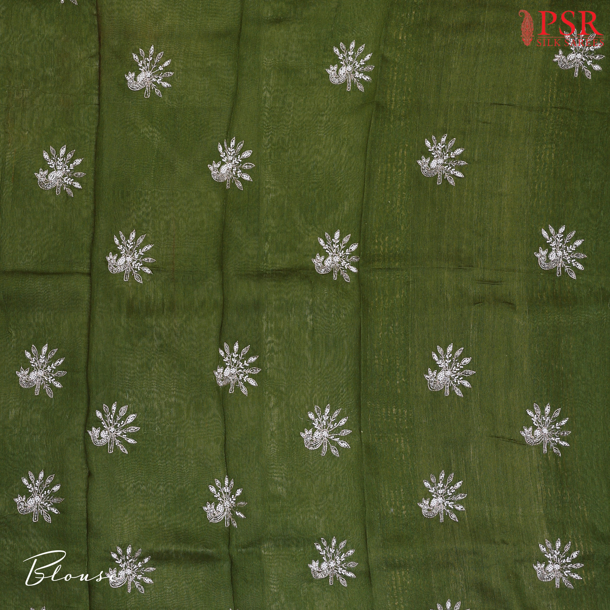 PSR Silks proudly introduces the Exquisite Sap Green Kadhi Tussar Silk Saree, a perfect blend of tradition and contemporary elegance. This luxurious saree showcases bold abstract prints and seamless geometrical patterm that add a modern touch to its timeless charm. The elegant pallu, adorned with a delicate zari border, enhances the sophistication of the ensemble. Paired with a matching blouse featuring intricate floral embroidery embellished with beads, this saree is ideal for special occasions, weddings, and festive celebrations. Step into style and make a statement with this beautifully handcrafted silk saree from PSR Silks.