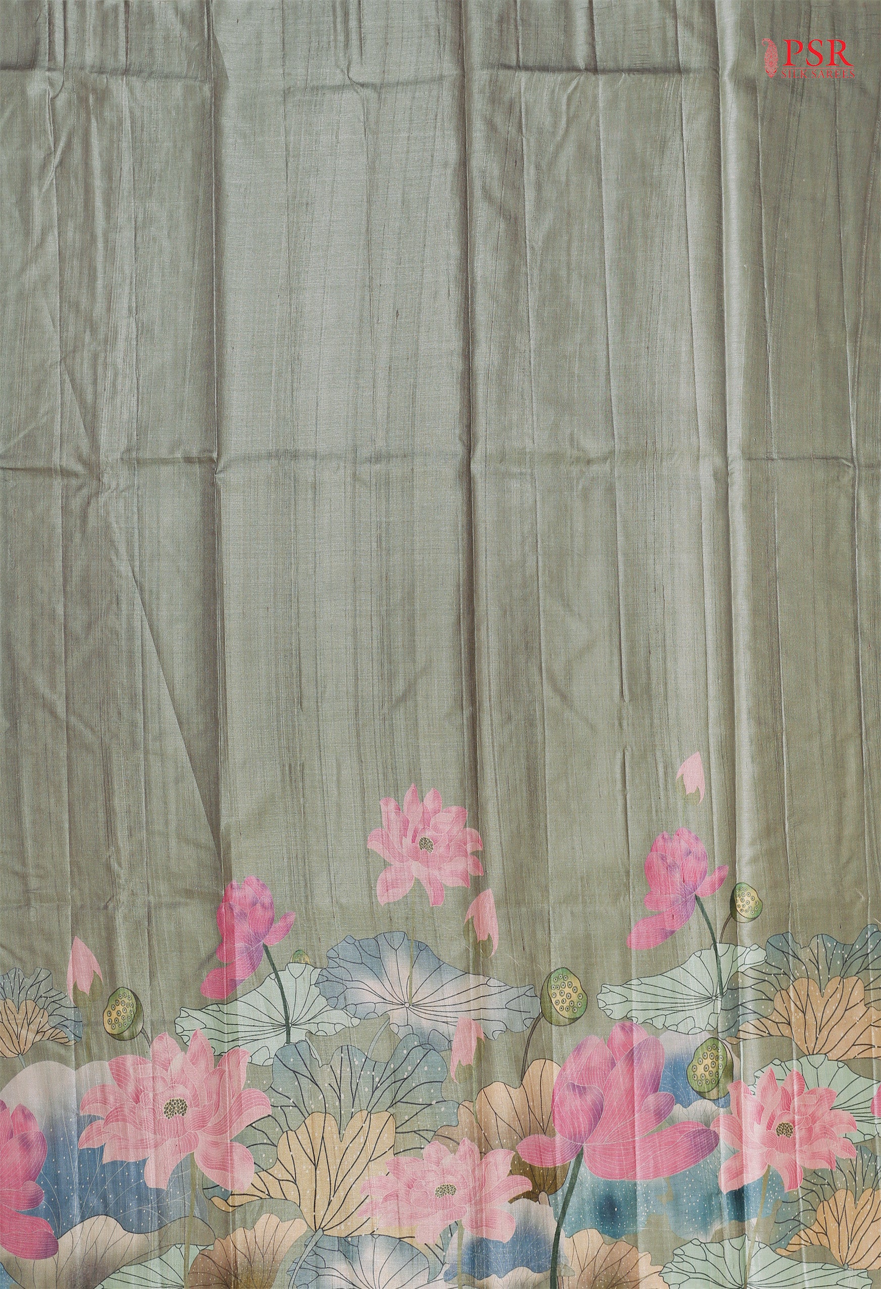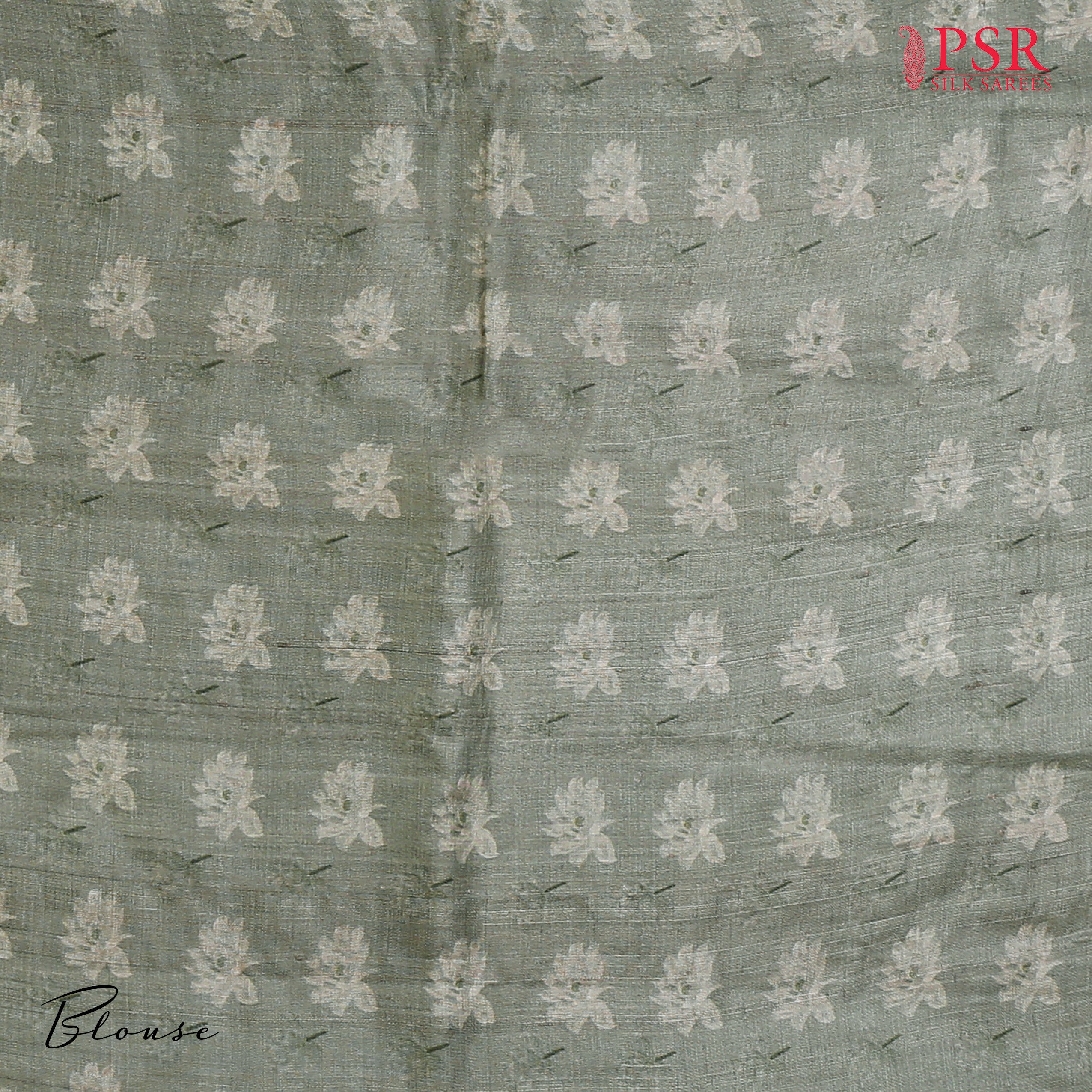 Elevate your style with this stunning Kadhi Tussar silk saree in a unique Antique Blue, where timeless elegance meets modern charm. Designed with a sleek, plain body, this saree is beautifully offset by a one-sided, vibrant floral-printed border that adds a touch of bold sophistication. Complete with a running pallu adorned with tassels and a coordinating printed blouse, this piece is a perfect blend of tradition and contemporary allure. Stand out with this extraordinary creation from PSR Silks!