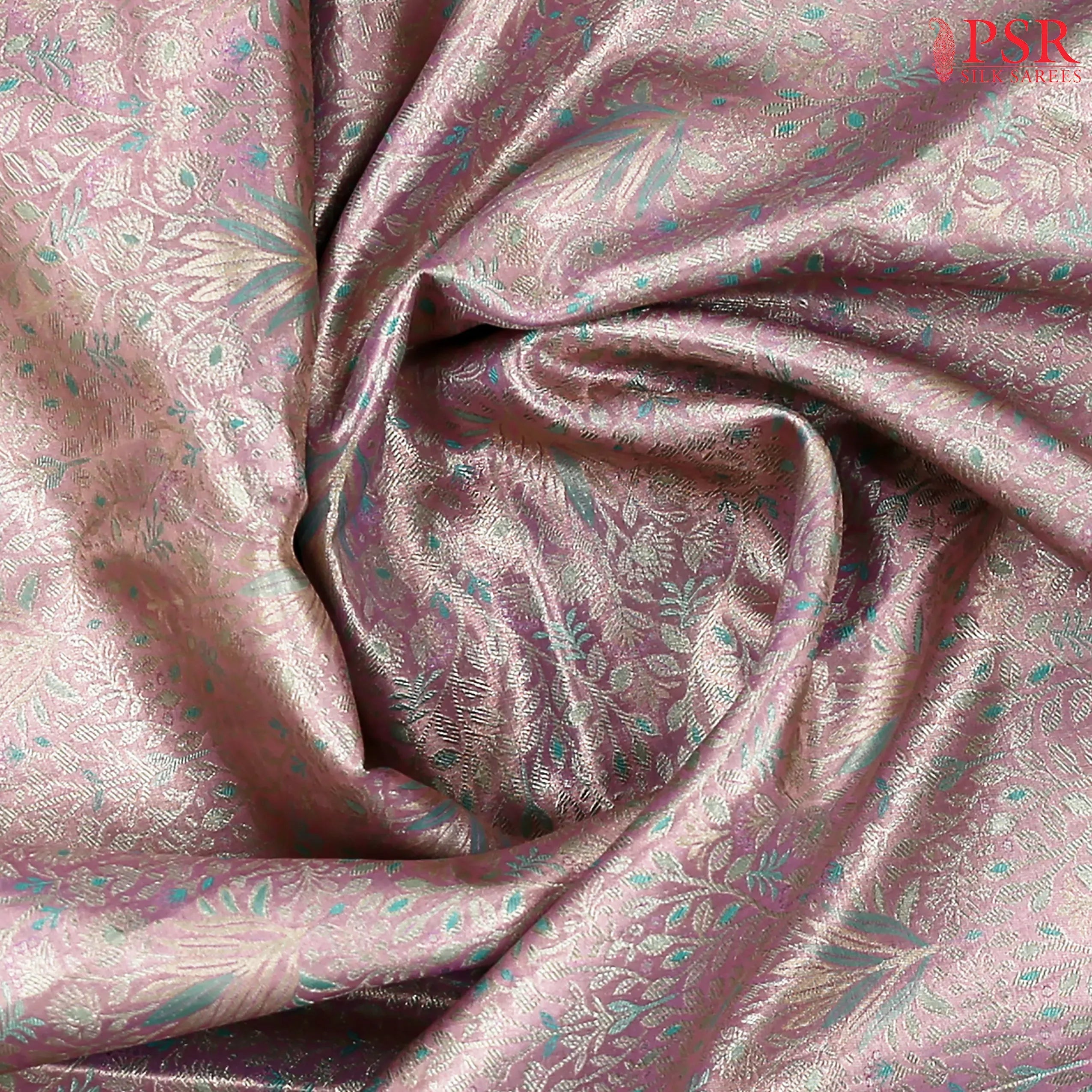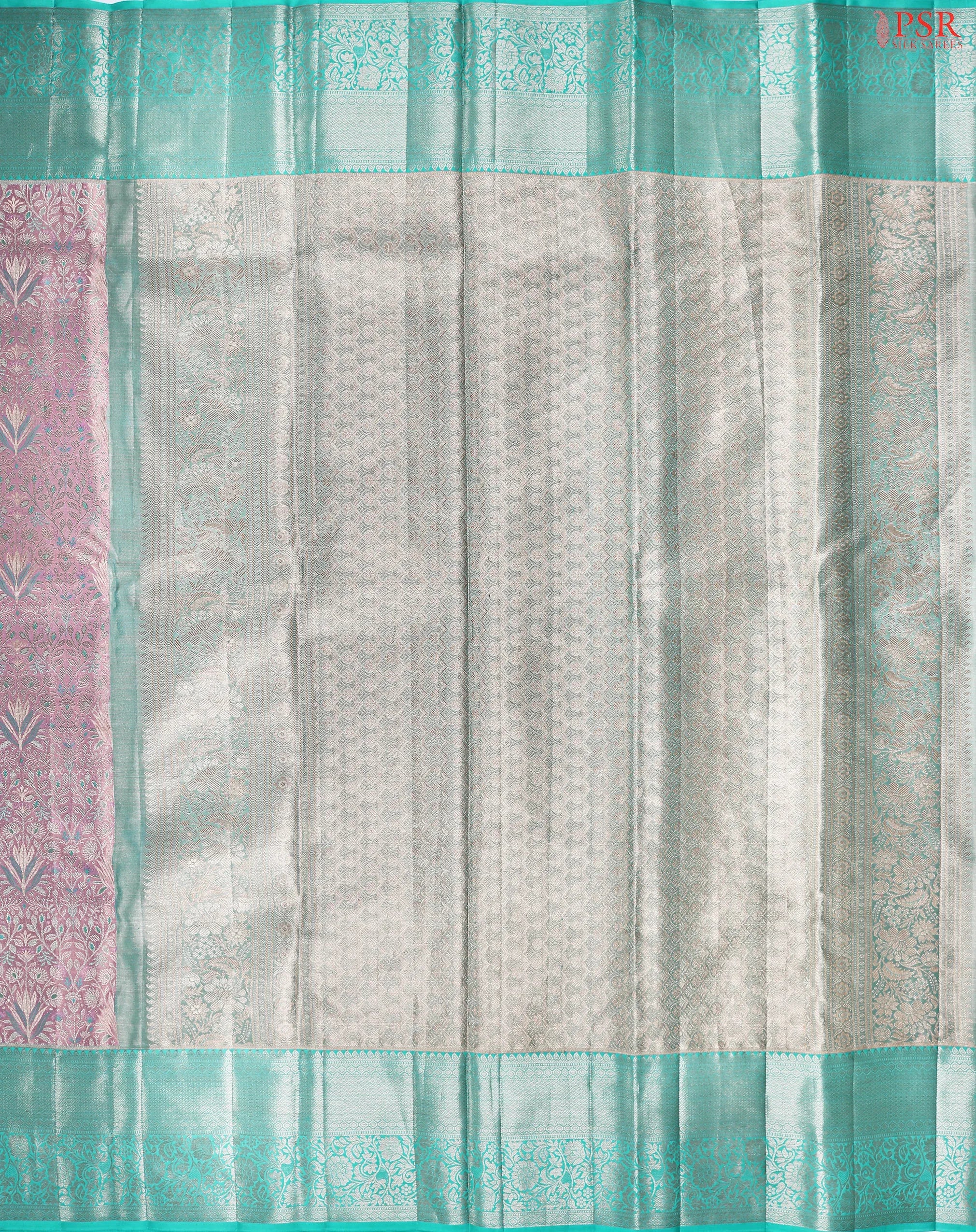 PSR Silk Sarees presents a dazzling Light Lilac Pink Kanchipuram Jacquard Tissue Silk Saree with a vibrant Turquoise contrast, crafted to radiate festive grandeur and timeless elegance.