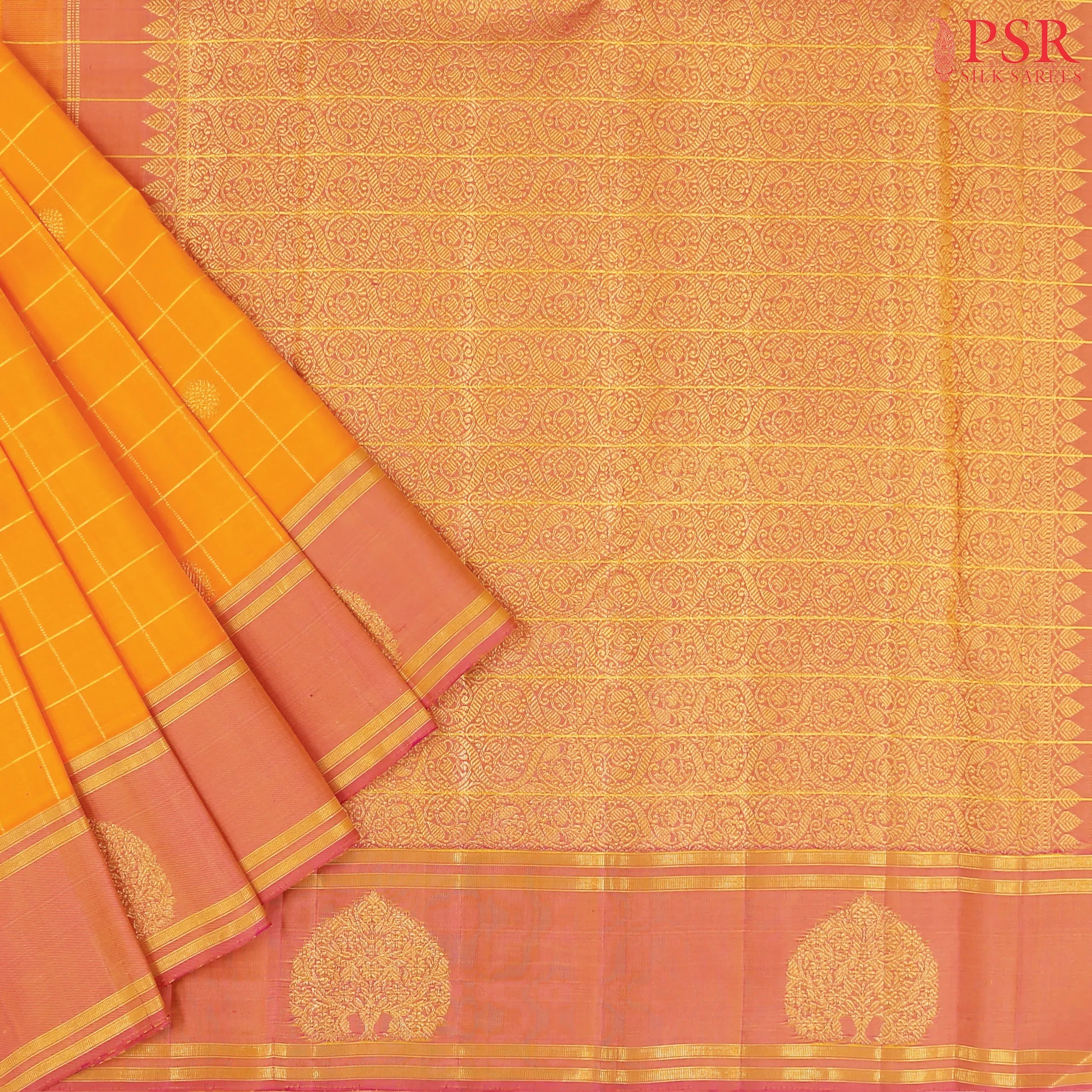 PSR Silk Sarees presents a charming Marigold Orange Kanchipuram Silk Saree paired with a delightful Pink combination, radiating youthful elegance and festive grace.