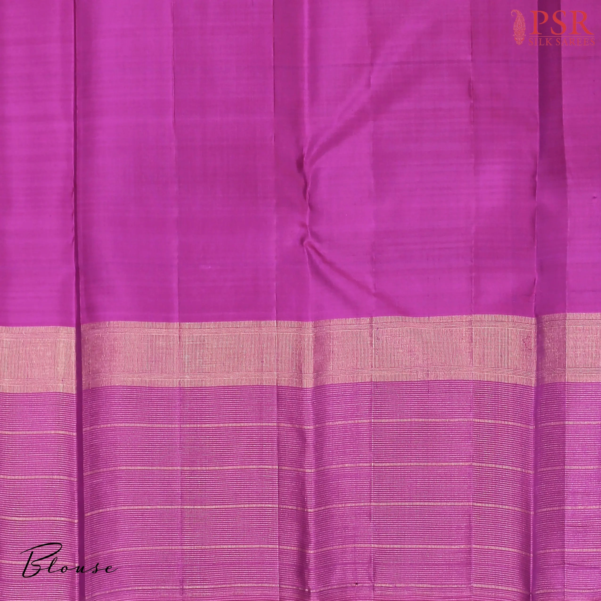 It is paired with a magenta rich zari chit pallu and finished with a classic vaira oosi (diamond needle) border, symbolizing traditional artistry. The ensemble includes a plain matching blouse, making it ideal for festive gatherings and traditional celebrations.