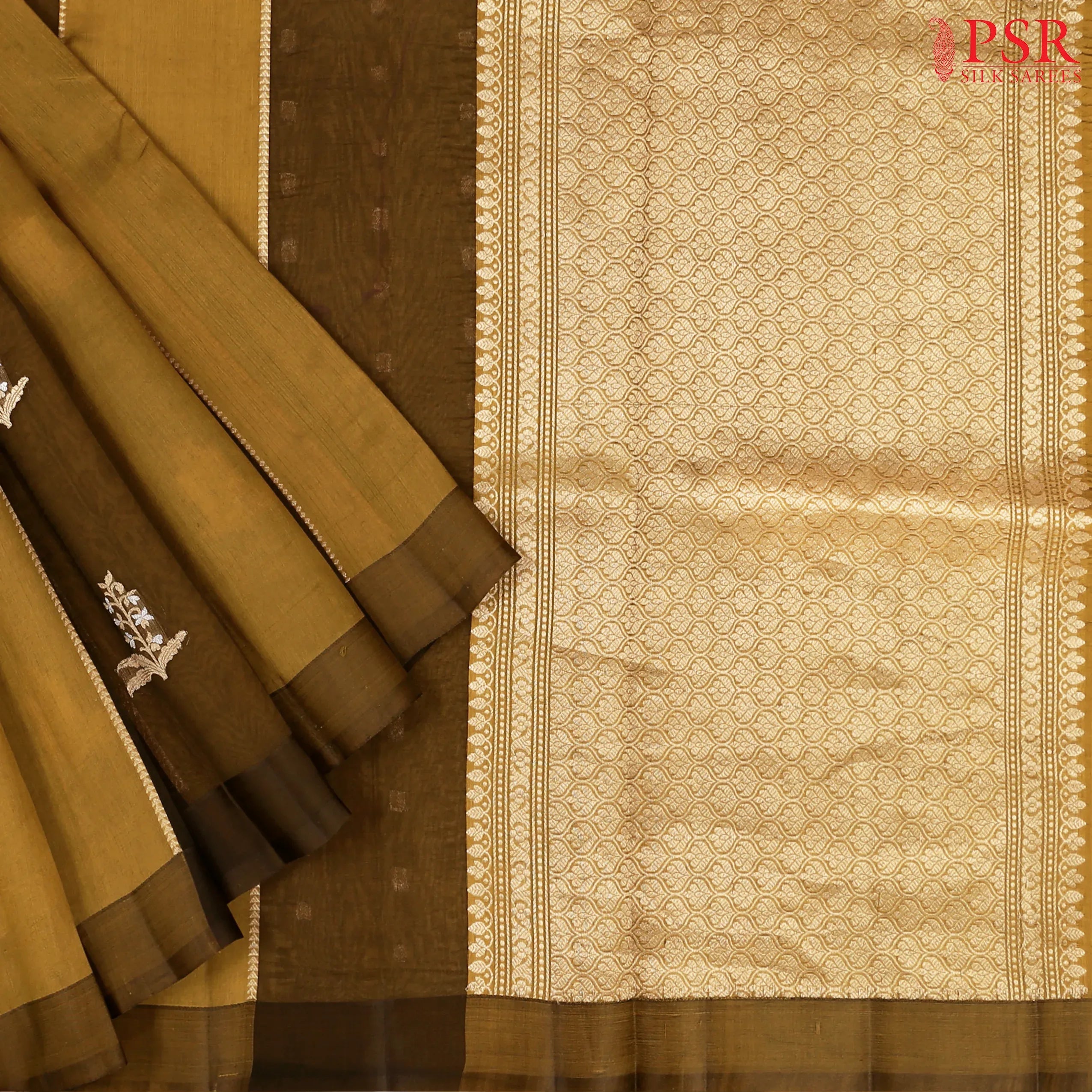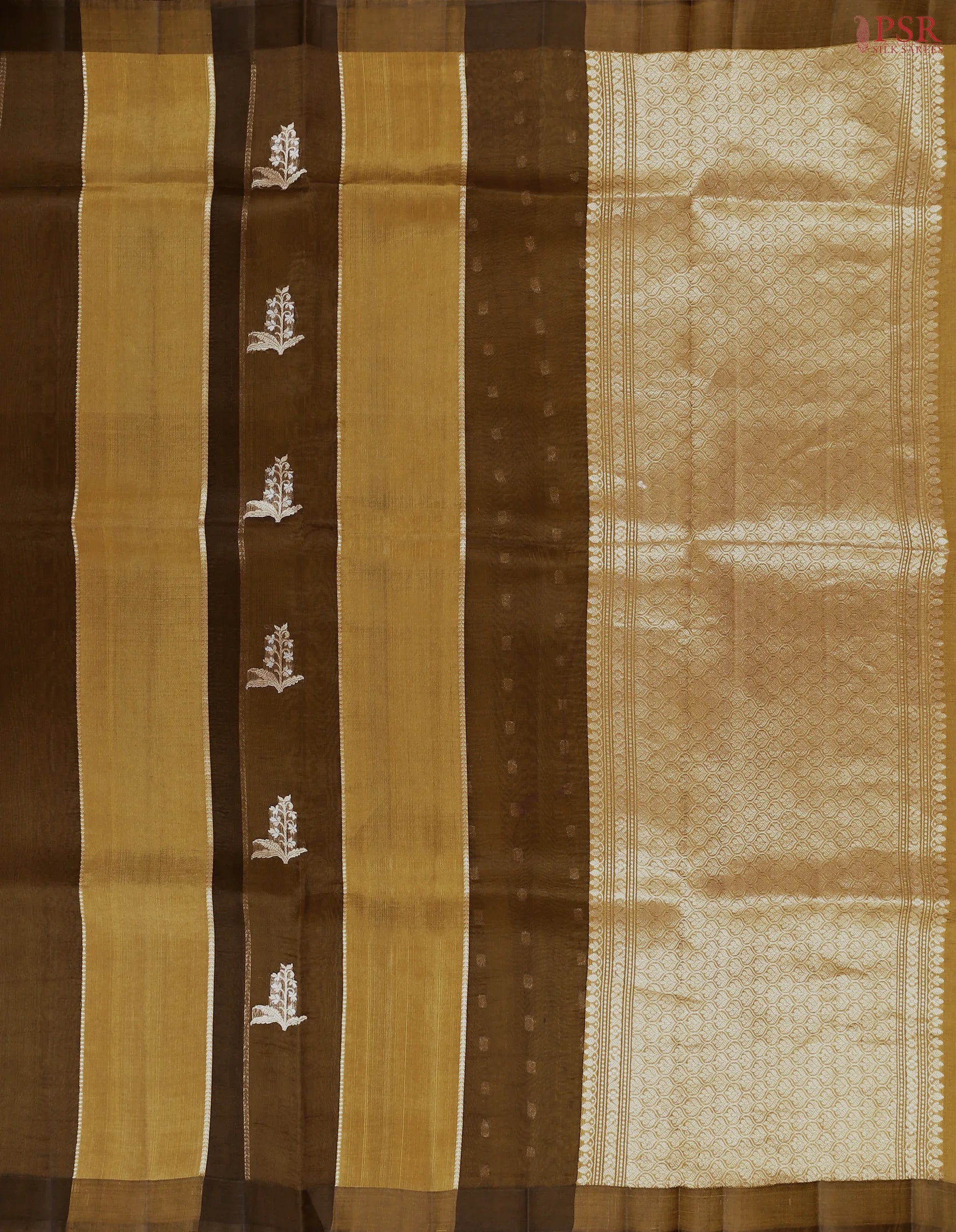 PSR Silk Sarees presents an elegant Mustard Brown Kora Banaras Silk Saree, a perfect blend of sheer sophistication and traditional craftsmanship. The lightweight Kora Banaras silk offers a delicate texture with a graceful, airy drape—ideal for refined festive styling.