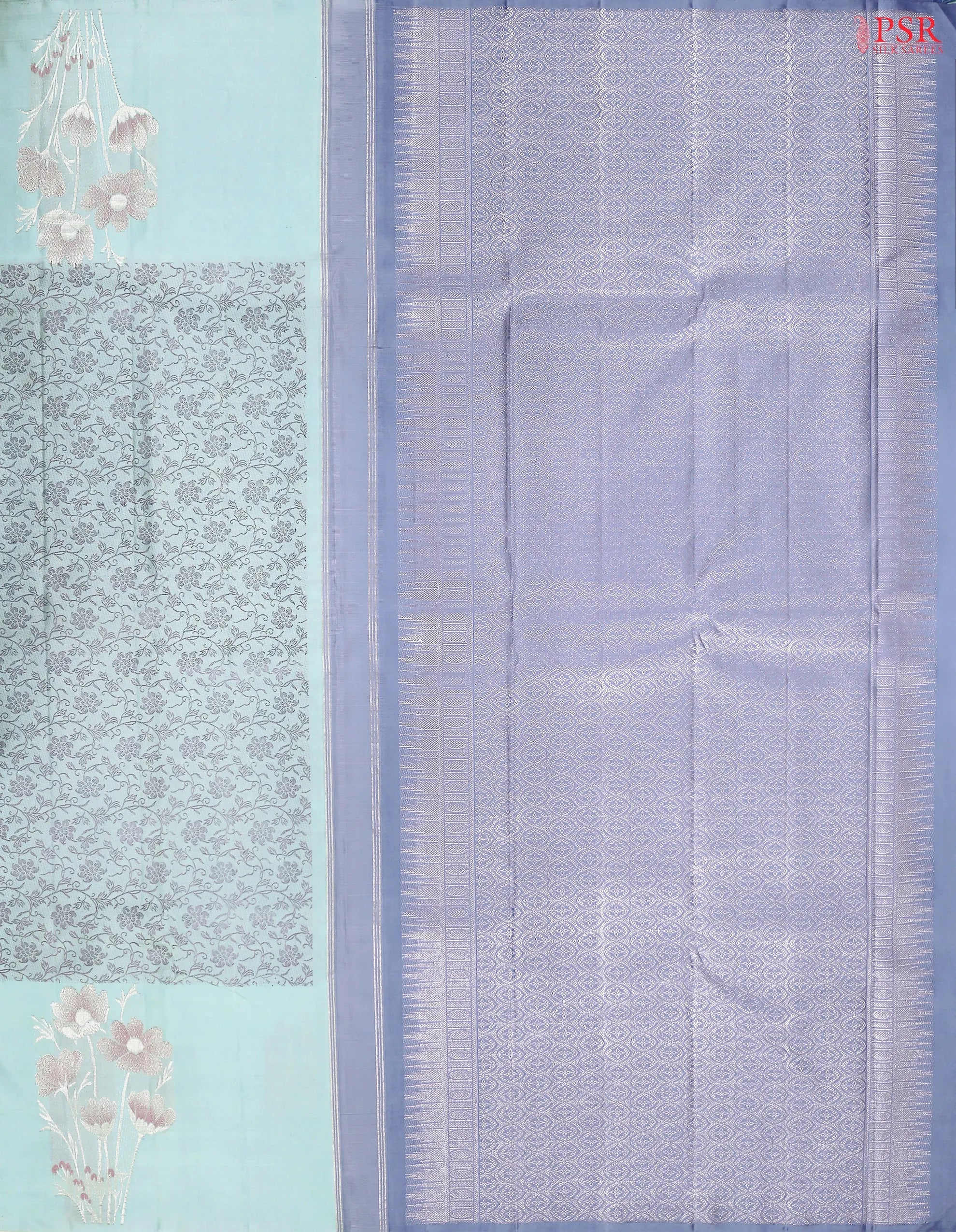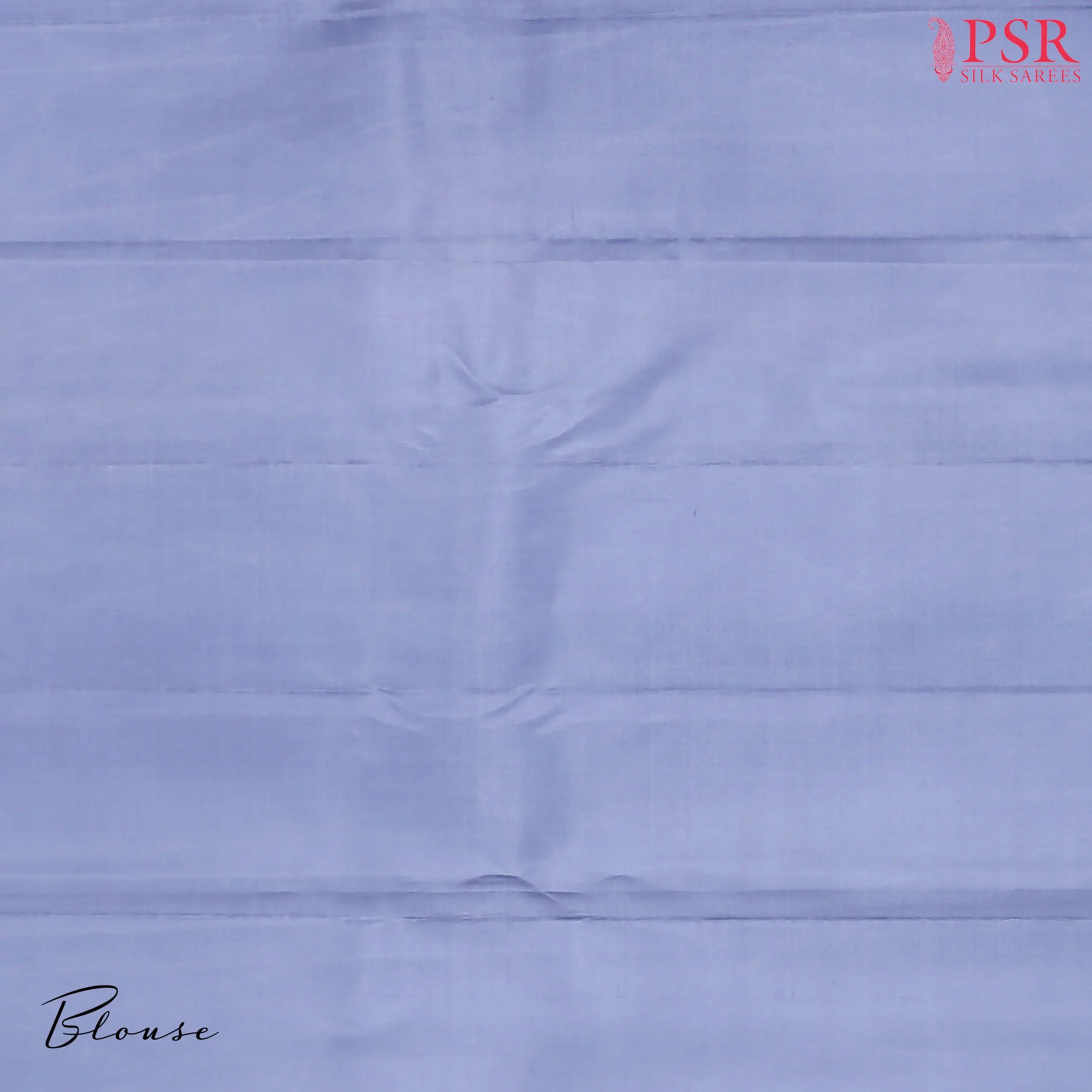 PSR Silk Sarees presents a graceful Pastel Blue Kanchipuram Silk Saree, categorized under "Shrestha Kanjivaram", paired with a charming Cornflower Blue combination.