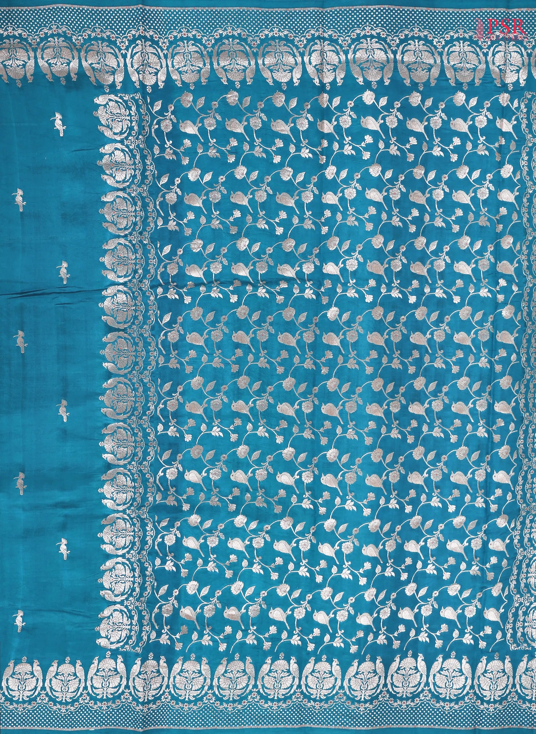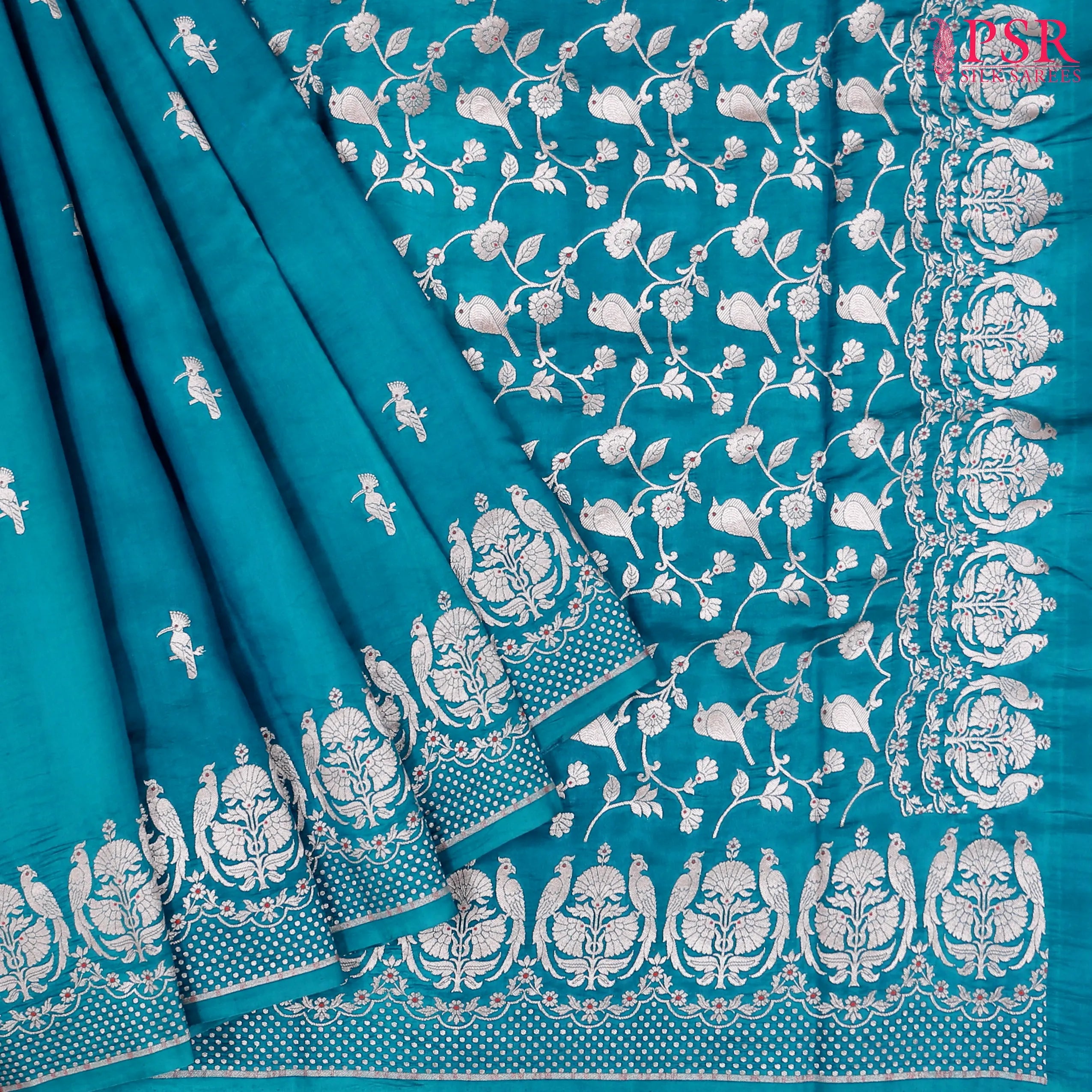 Indulge in subtle sophistication with PSR Silk Sarees’ Peacock Blue Chiniya Silk Saree. The saree is beautifully adorned with vibrant bird zari motifs, adding a touch of color and festivity to its refined charm.