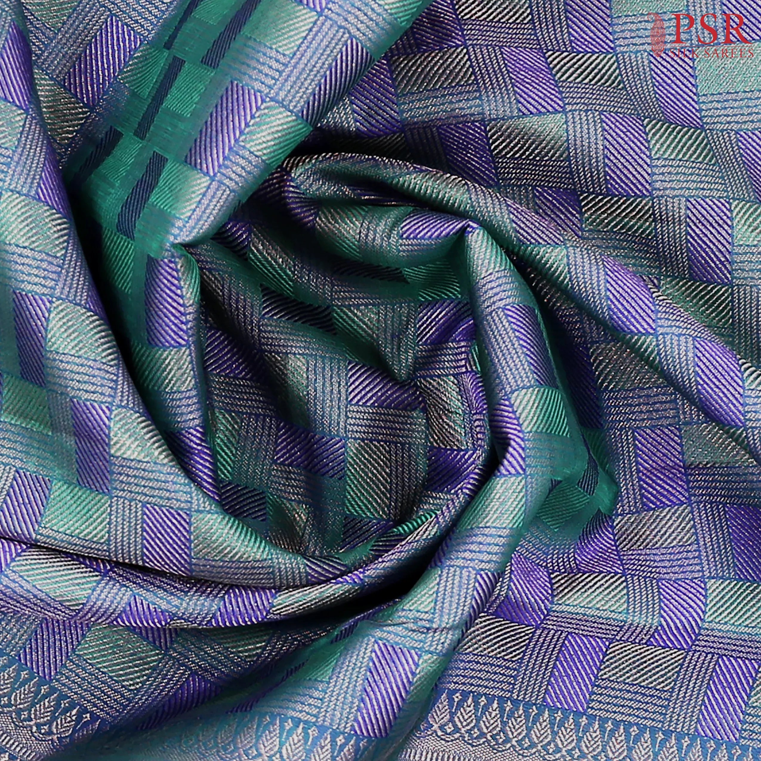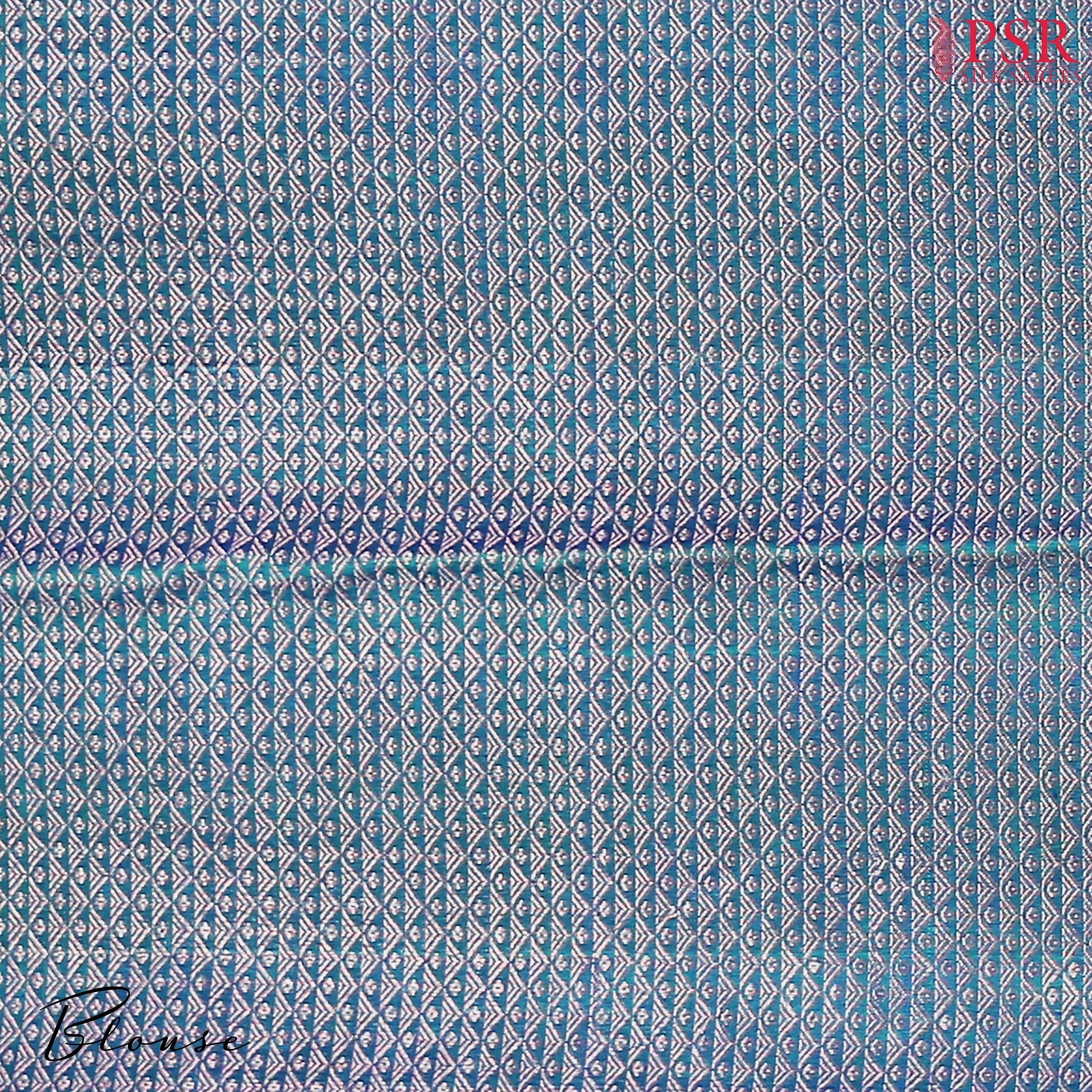 PSR Silk Sarees presents a sophisticated Peacock Teal Kanchipuram Jacquard Silk Saree, crafted to reflect elegance with timeless craftsmanship.