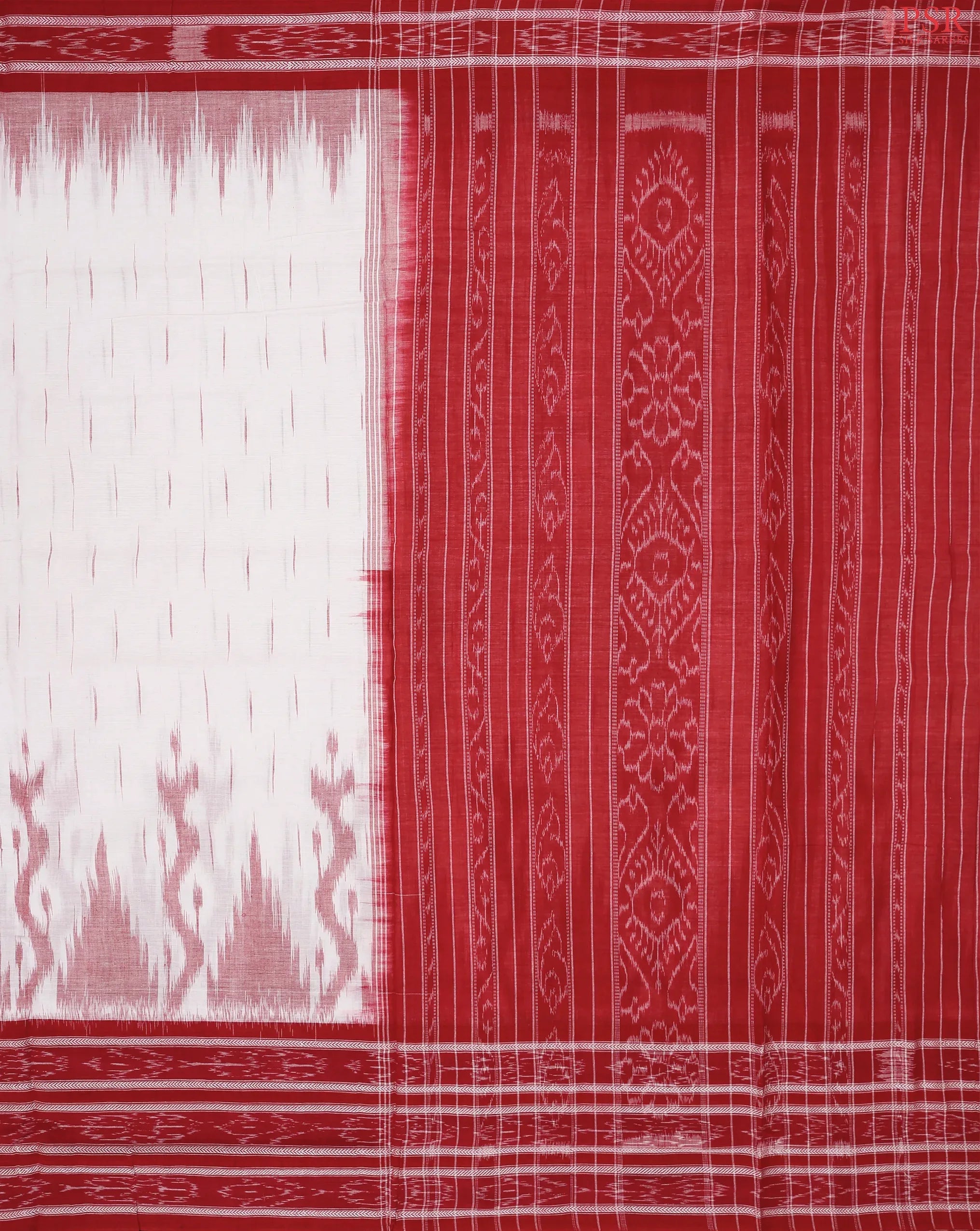 PSR Silk Sarees presents a Pearl White colored Ikkat cotton saree with combination of Red color.