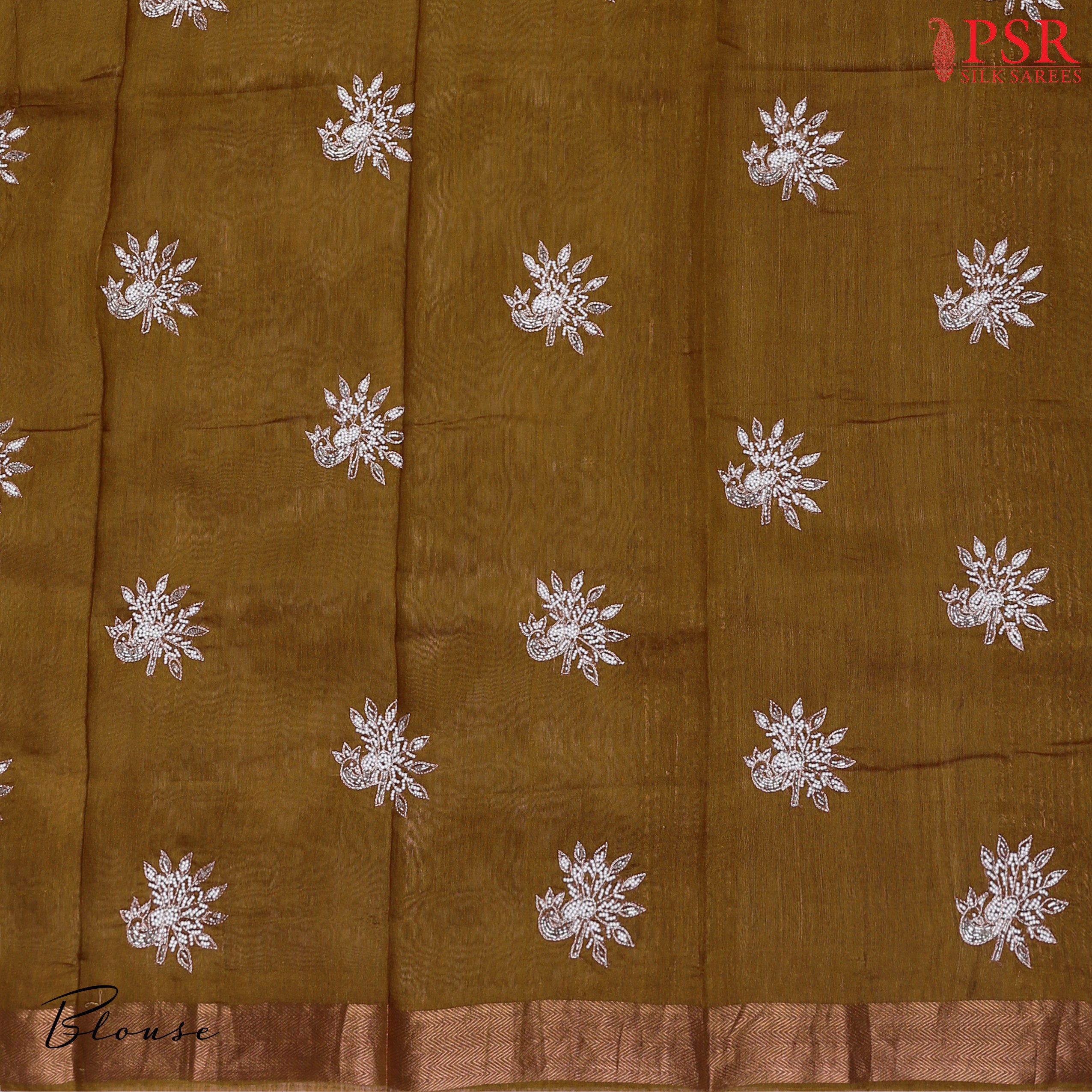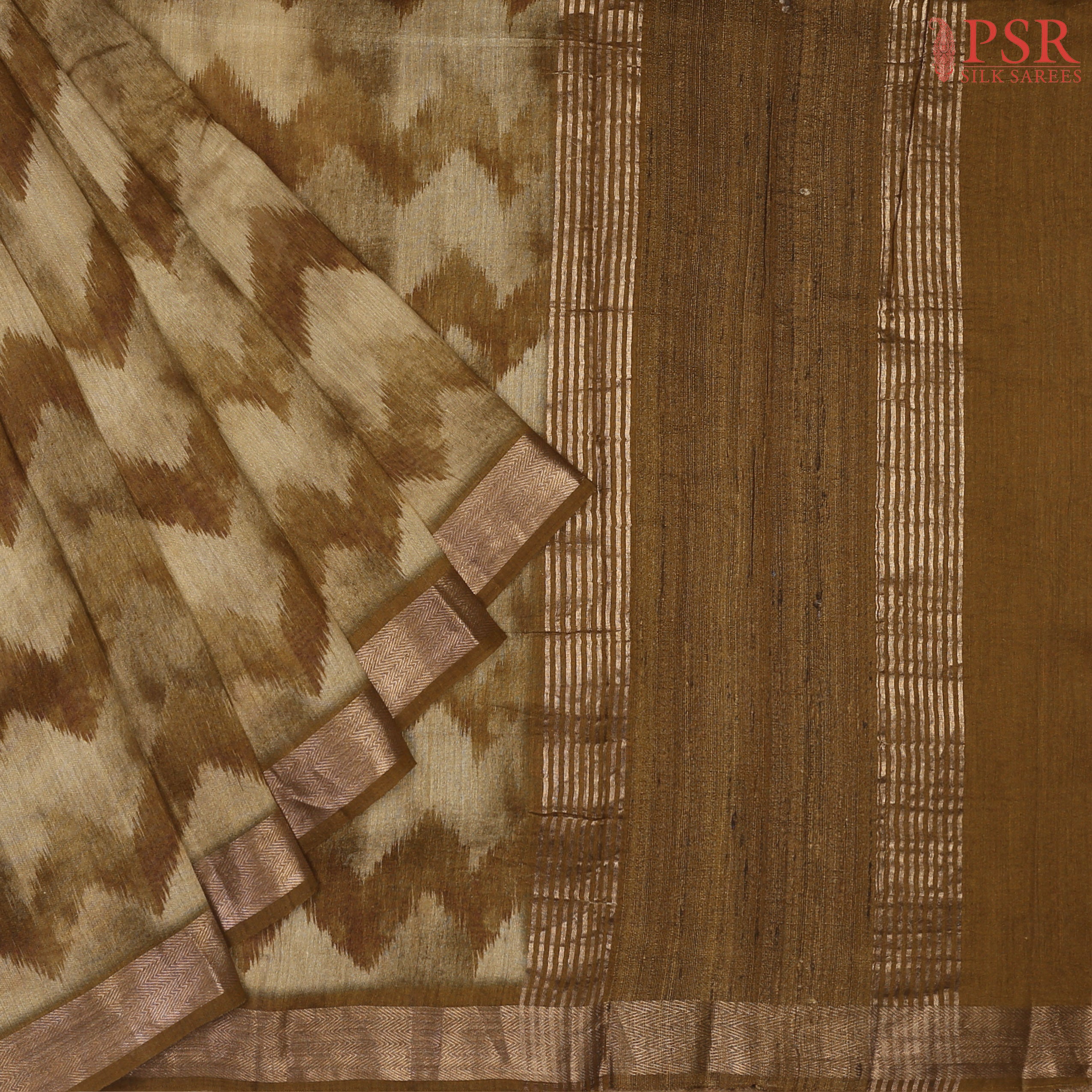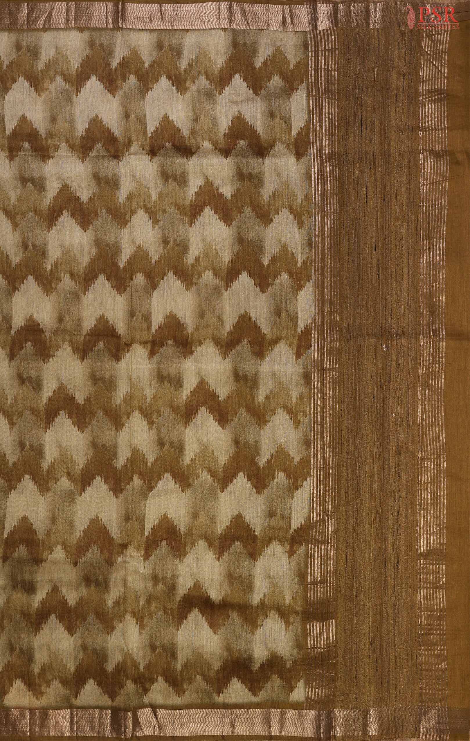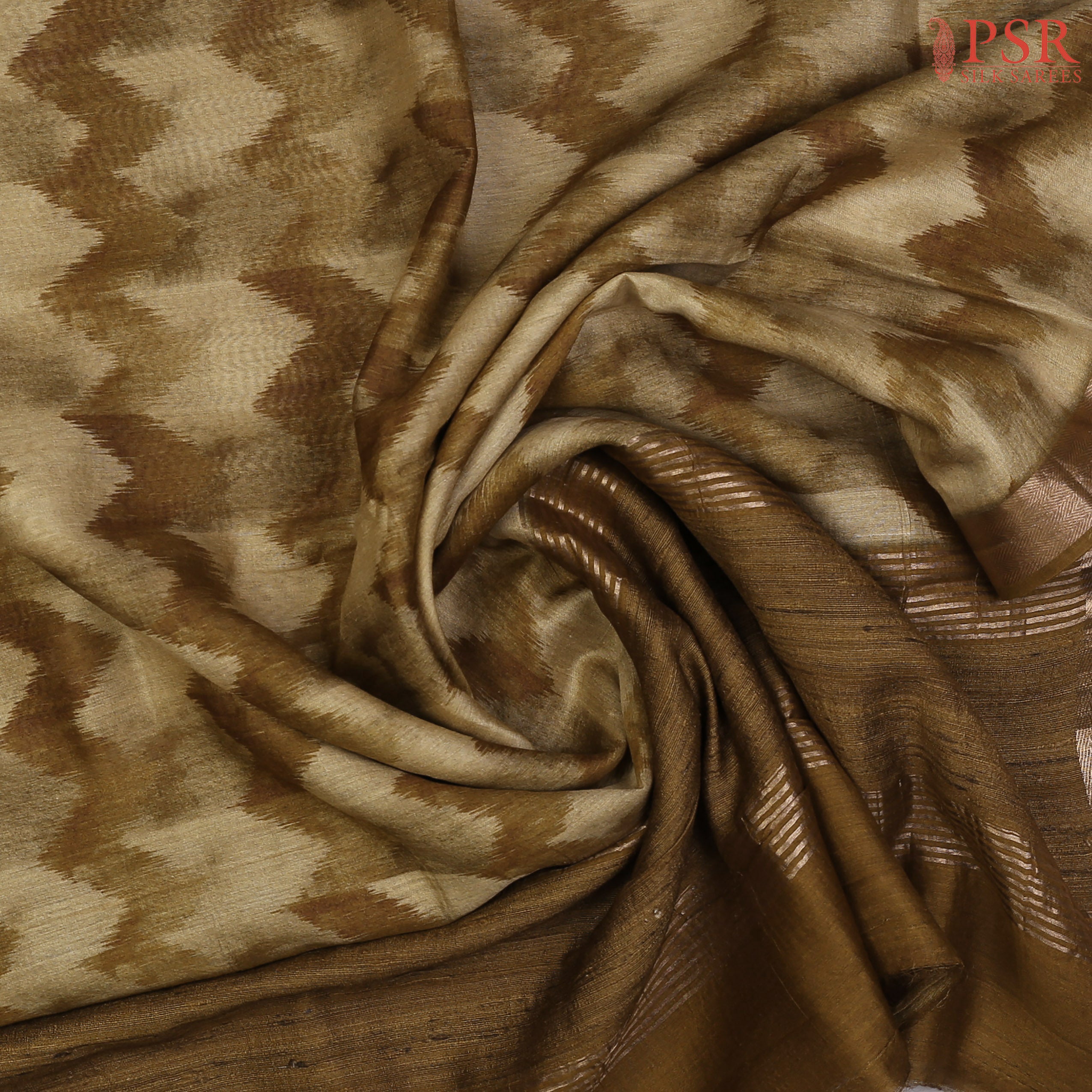 PSR Silks proudly introduces the Exquisite Brown & Tan Kadhi Tussar Silk Saree, a perfect blend of tradition and contemporary elegance. This luxurious saree showcases bold abstract prints and seamless chevron strips that add a modern touch to its timeless charm. The elegant pallu, adorned with a delicate zari border, enhances the sophistication of the ensemble. Paired with a matching blouse featuring intricate floral embroidery embellished with beads, this saree is ideal for special occasions, weddings, and festive celebrations. Step into style and make a statement with this beautifully handcrafted silk saree from PSR Silks.