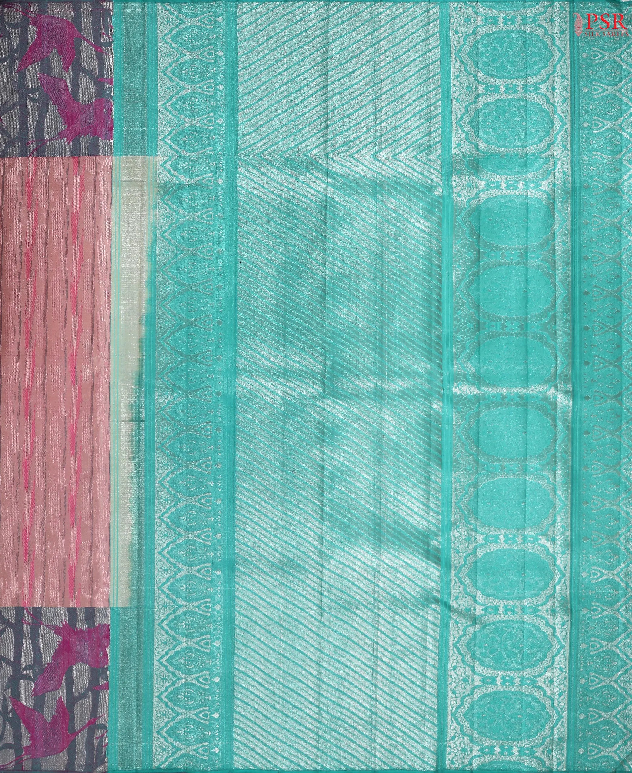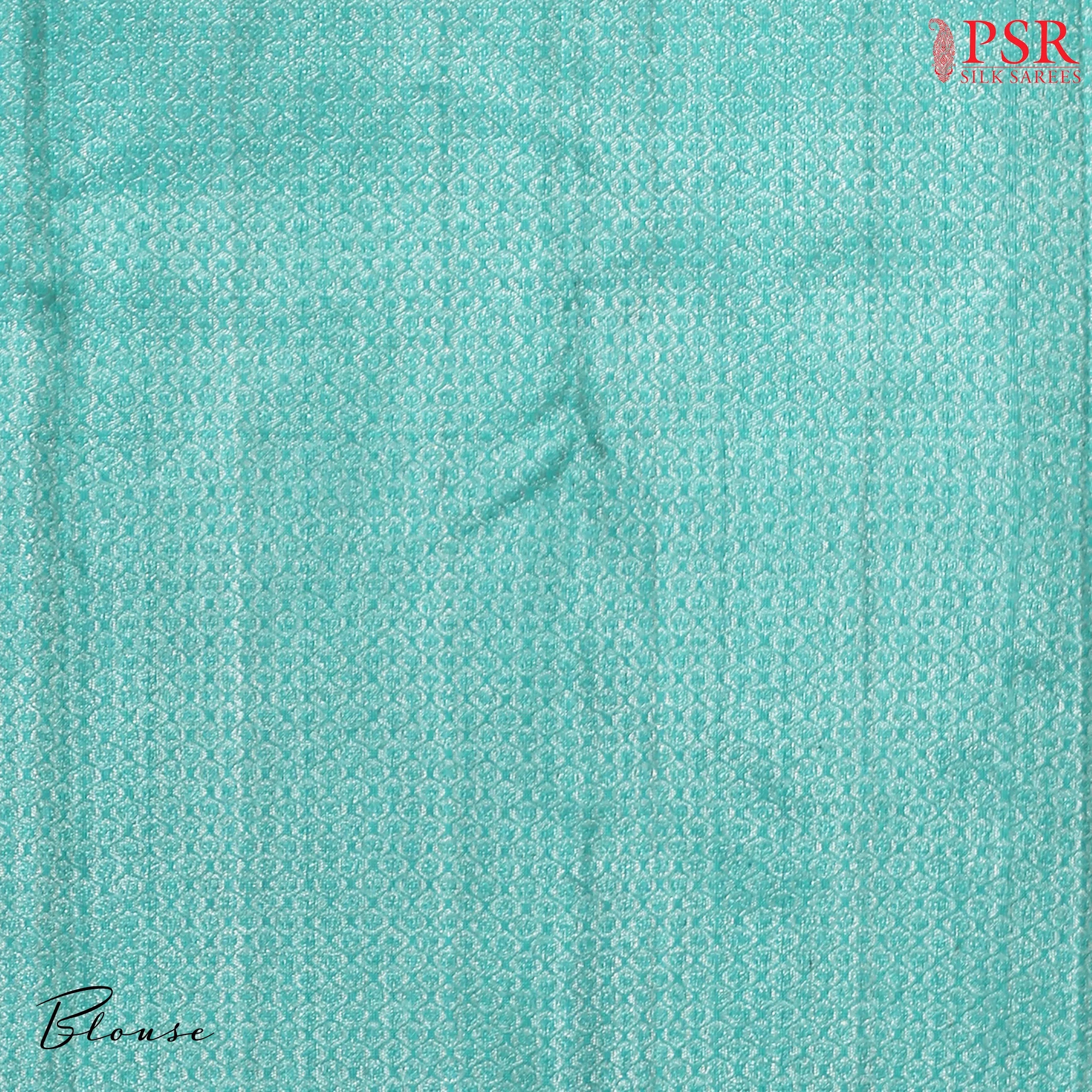 It is paired wth a Turquoise Blue traditional pallu adorned with rich zari work, and a stylish border that adds grandeur and finesse. The ensemble is completed with a unique Turquoise Blue designer zari work blouse, making this saree truly one of a kind.