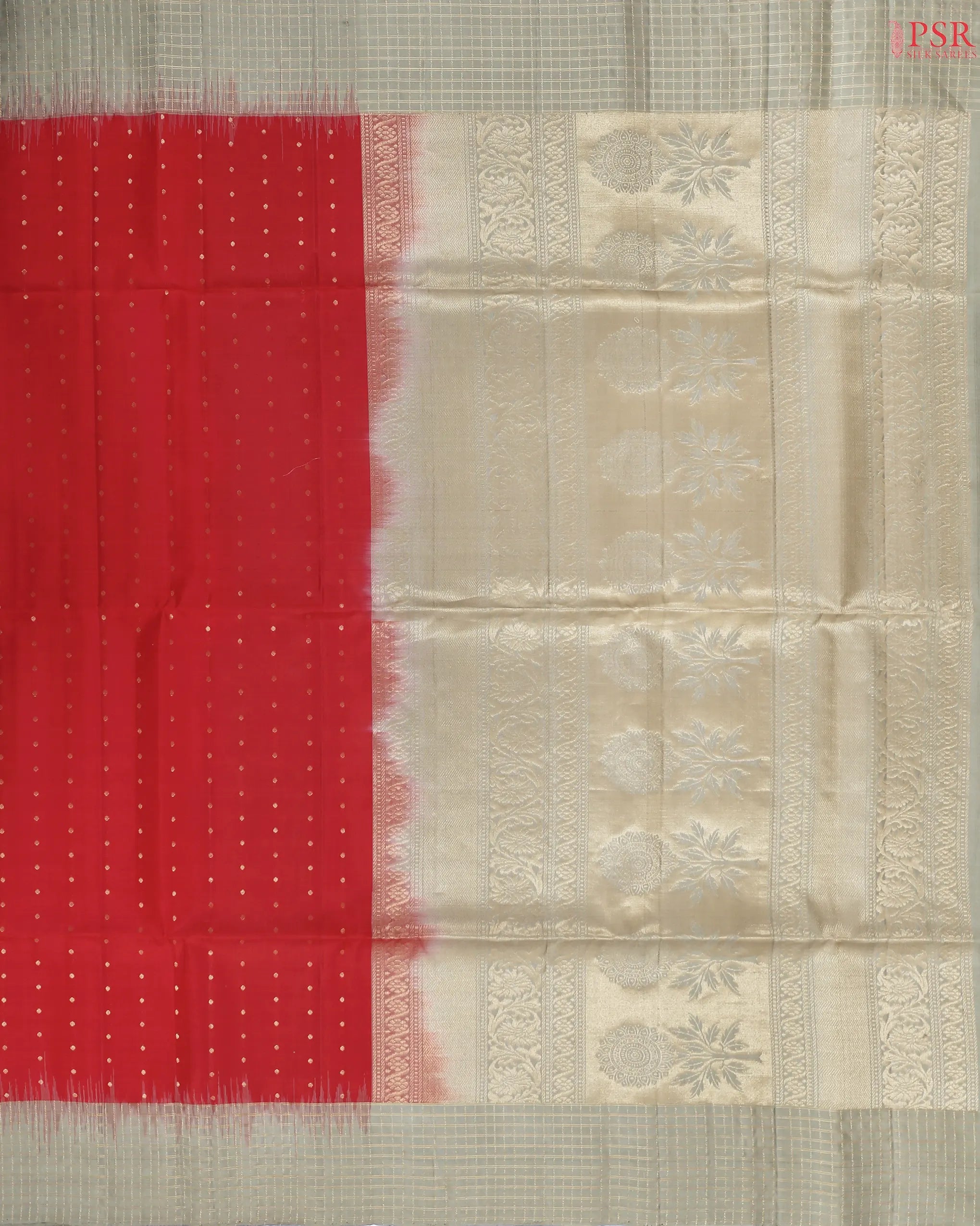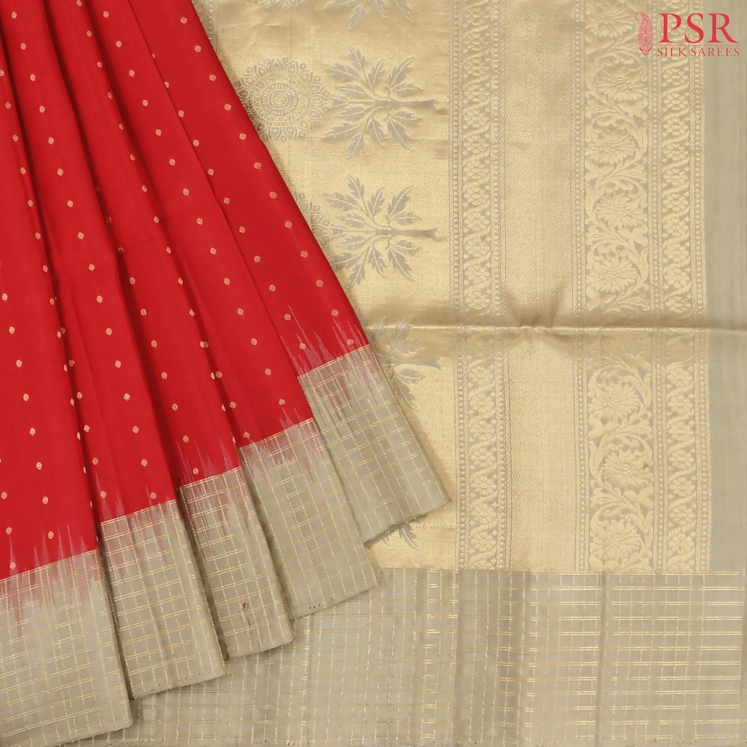 PSR Silk Sarees presents an elegant Red Soft Silk Saree paired with a rich Taupewood contrast, radiating timeless sophistication and traditional grace.