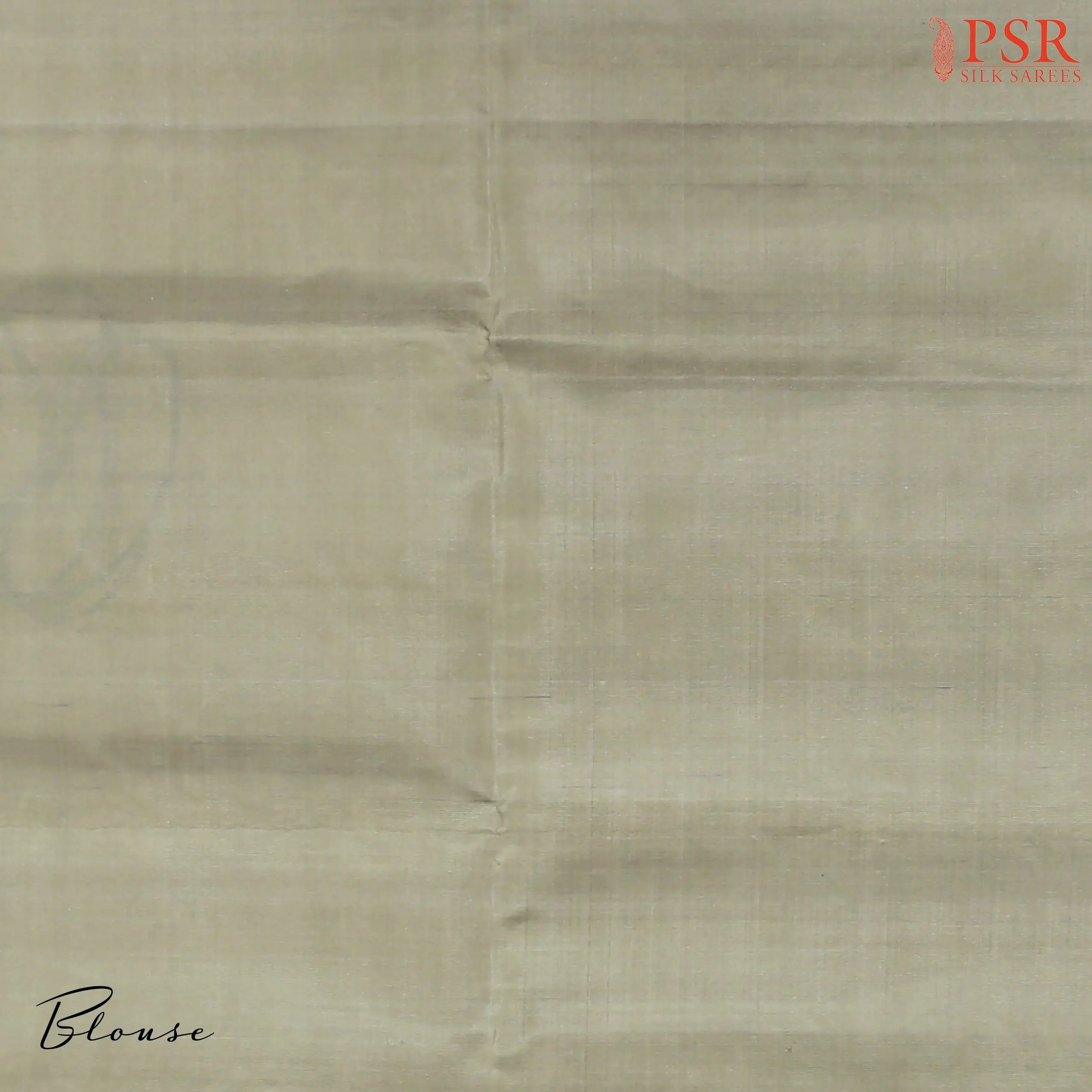 The saree features delicate polka-style zari motifs woven intricately across the body, exuding understated charm. It is beautifully complemented by a Taupewood-colored pallu and border adorned with traditional zari work and elegant zari checks, enhancing its classic appeal. Completing the ensemble is a plain Taupewood blouse, perfectly balancing the saree’s vibrant beauty.