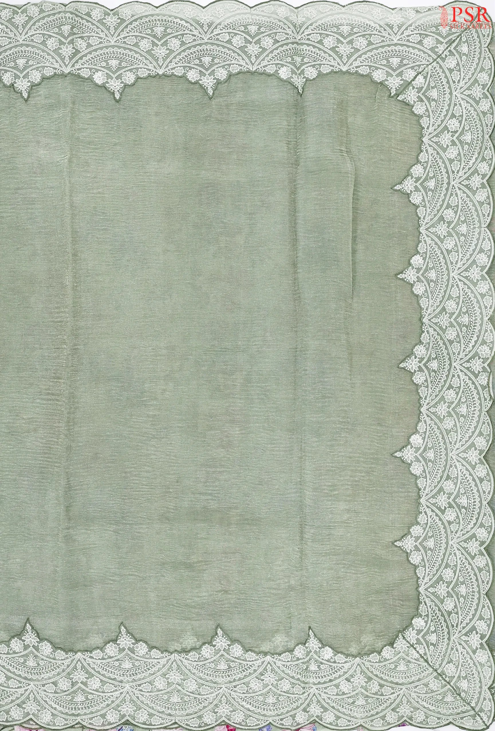 PSR Silk Sarees presents a stunning Sage Green Semi Crushed Tissue Saree, designed to showcase contemporary elegance with artistic detailing.