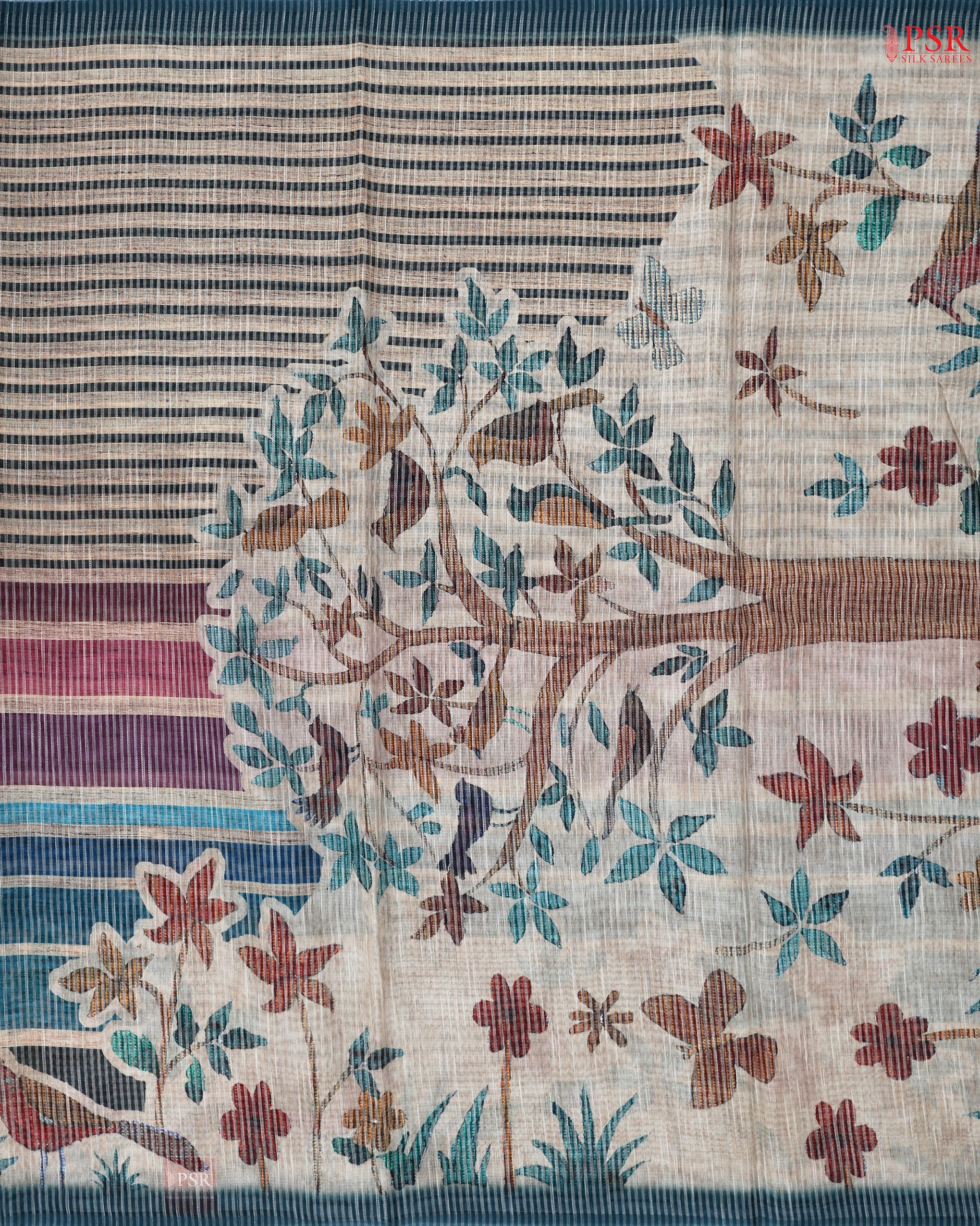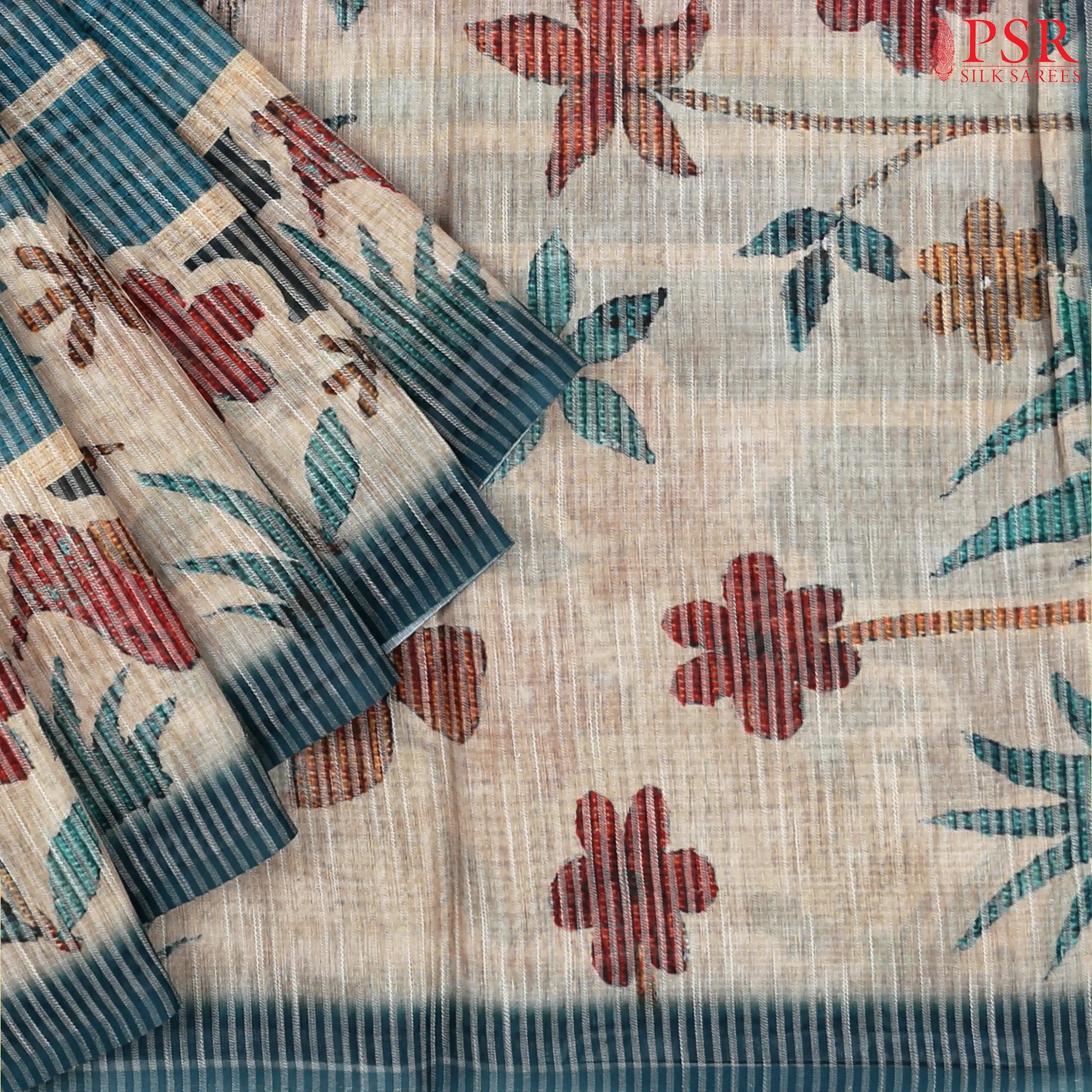 PSR Silk Sarees presents a Tussar Beige colored Semi Dupion saree with combination of Teal Blue color.