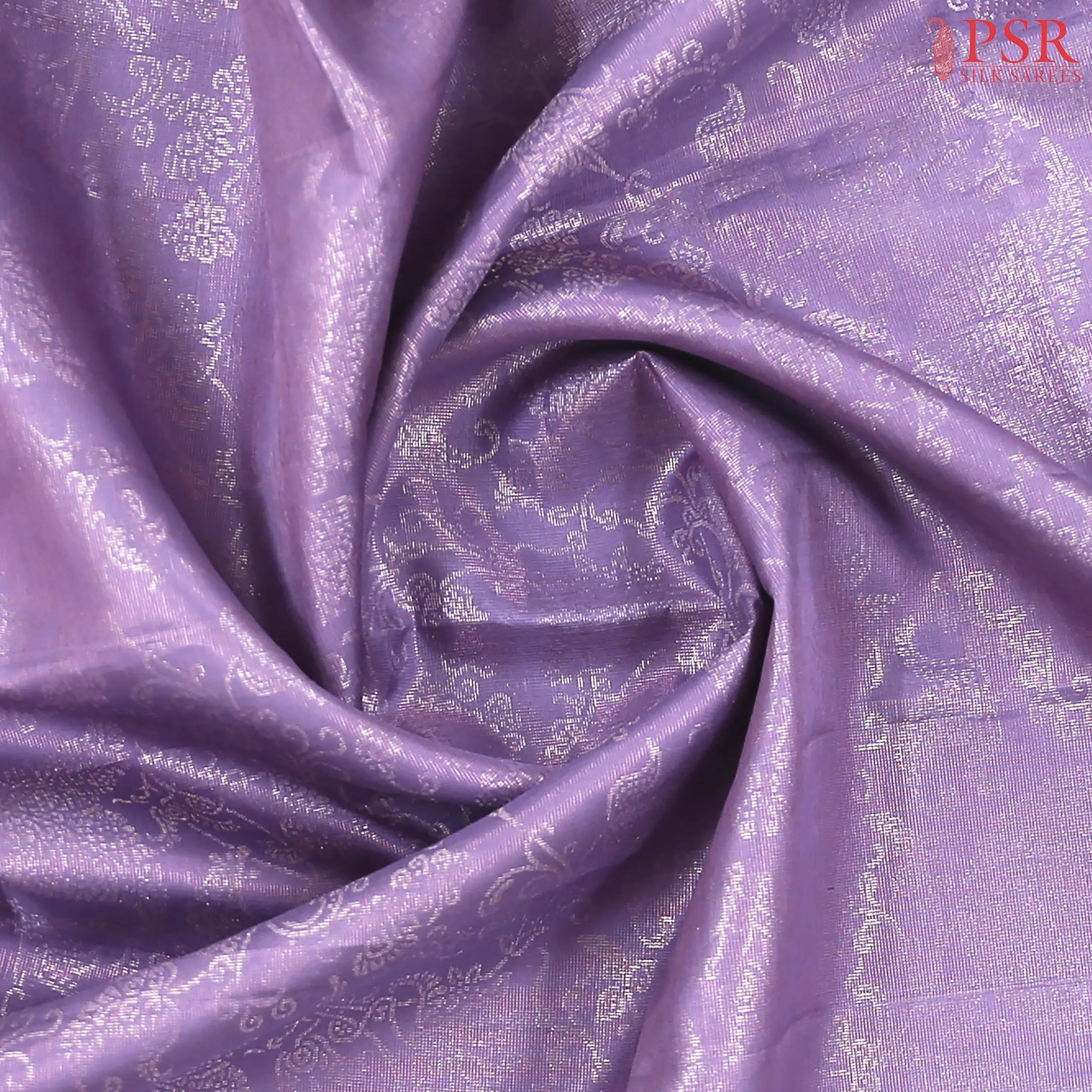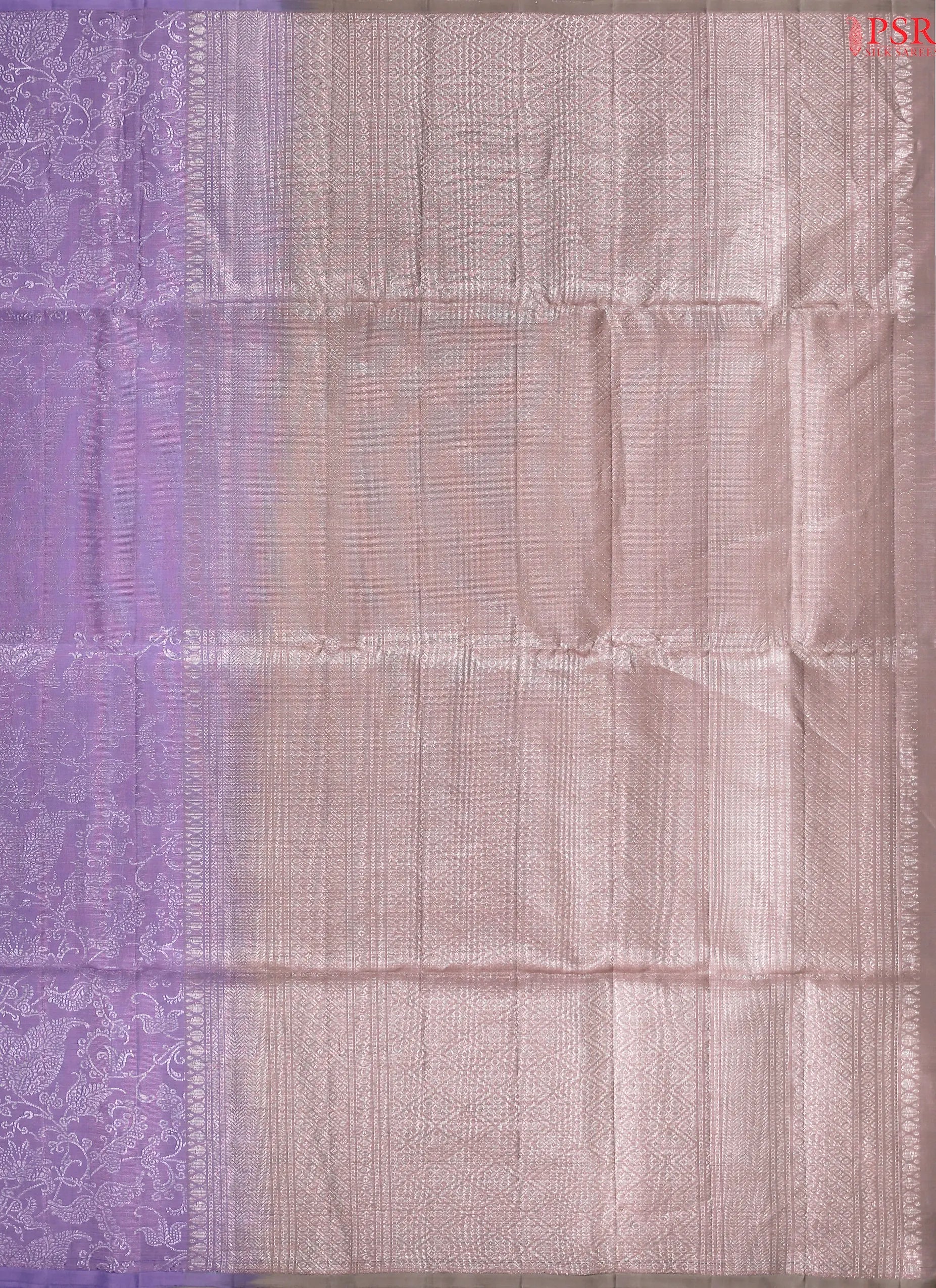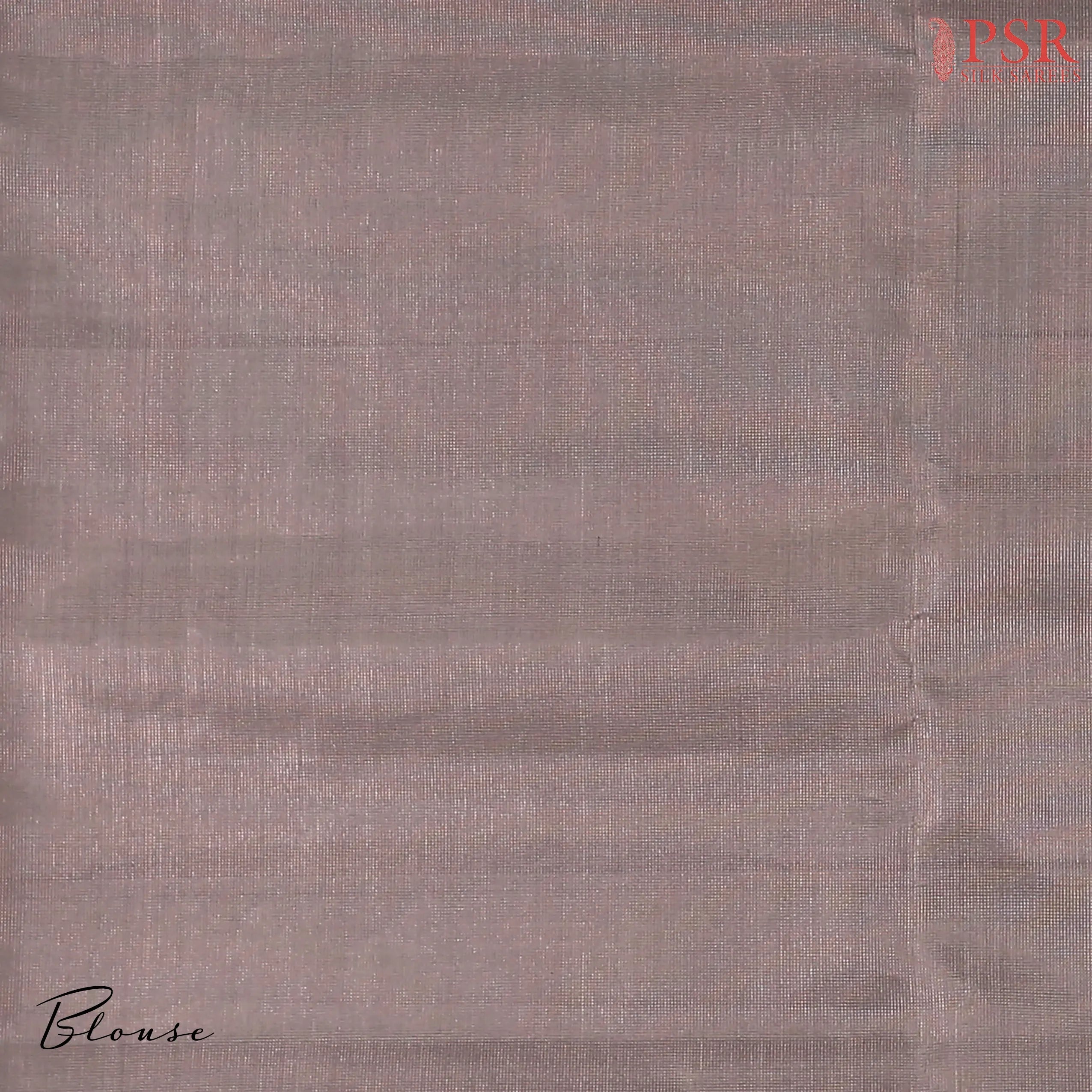 Make a striking statement with this luxurious WisteriaSoft Tissue Silk Saree from PSR Silks, beautifully paired with a vibrant Warm Taupe pallu. This elegant borderless saree features an intricate copper scroll floral jacquard pattern, offering a contemporary twist to traditional design. The contrasting tissue pallu, adorned with rich copper zari work, adds an extra layer of sophistication. Complete the look with the sleek plain Warm Taupe blouse, perfect for special occasions and festivities.