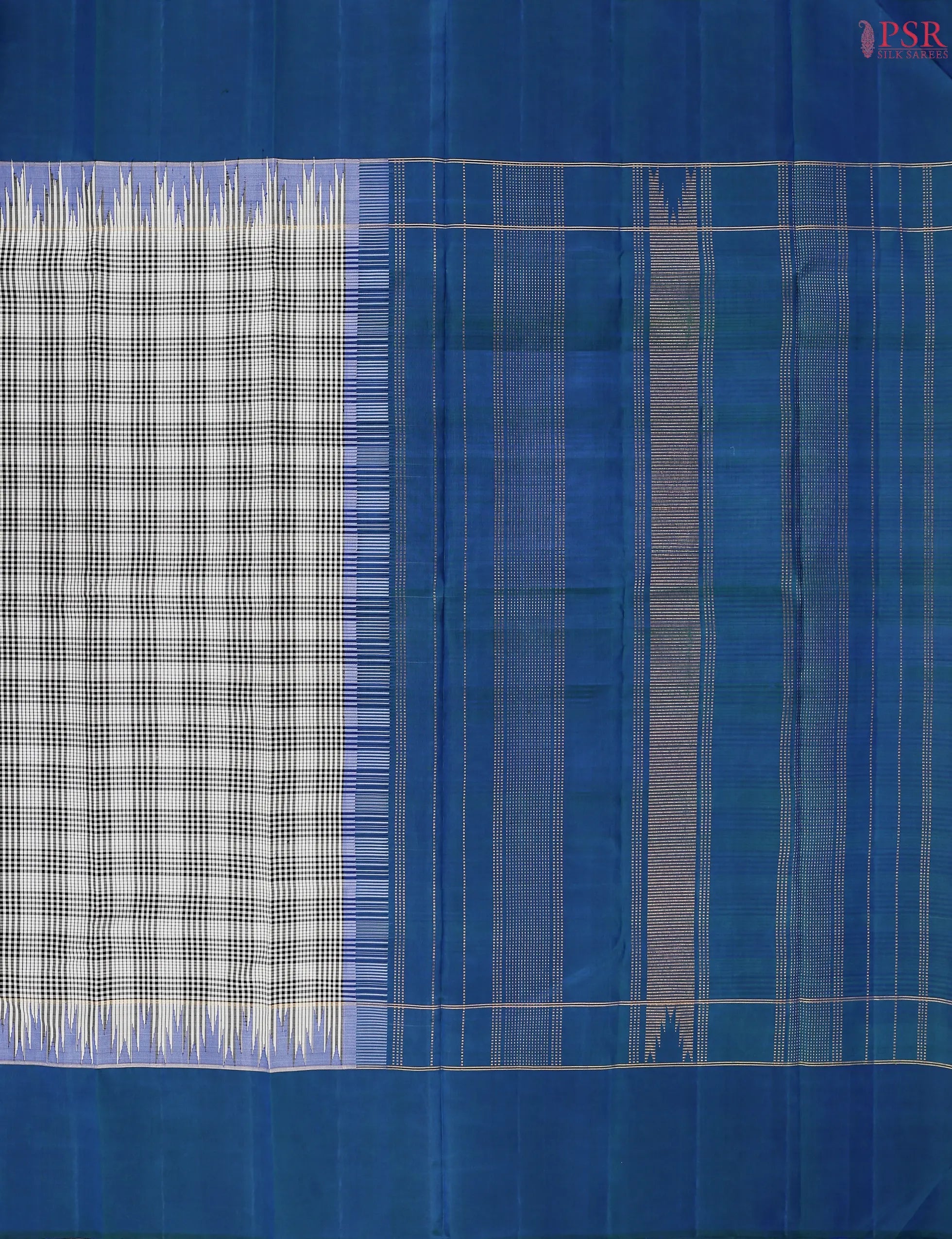 The saree showcases a classic black mini checkered pattern, lending it a chic and timeless appeal. The highlight is its contrasting Yale Blue zari chit pallu, exquisitely woven to add a touch of tradition and grandeur. Completing the look is a plain Yale Blue blouse and matching border, creating the perfect balance of subtlety and sophistication.