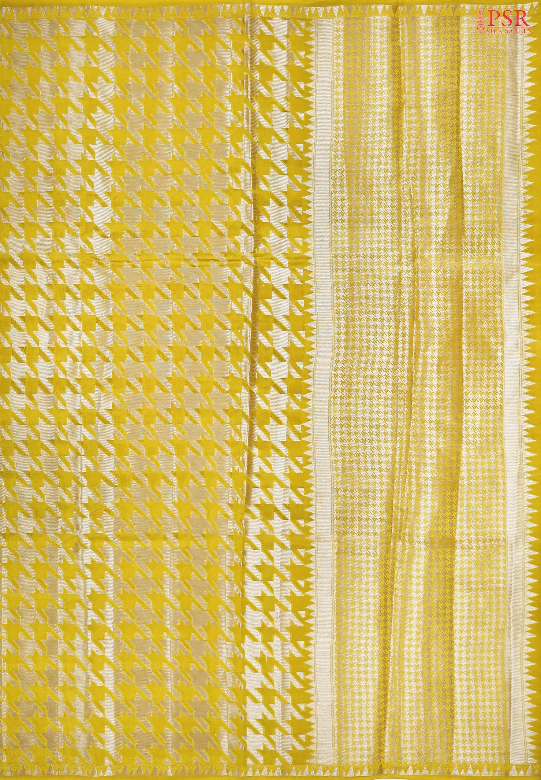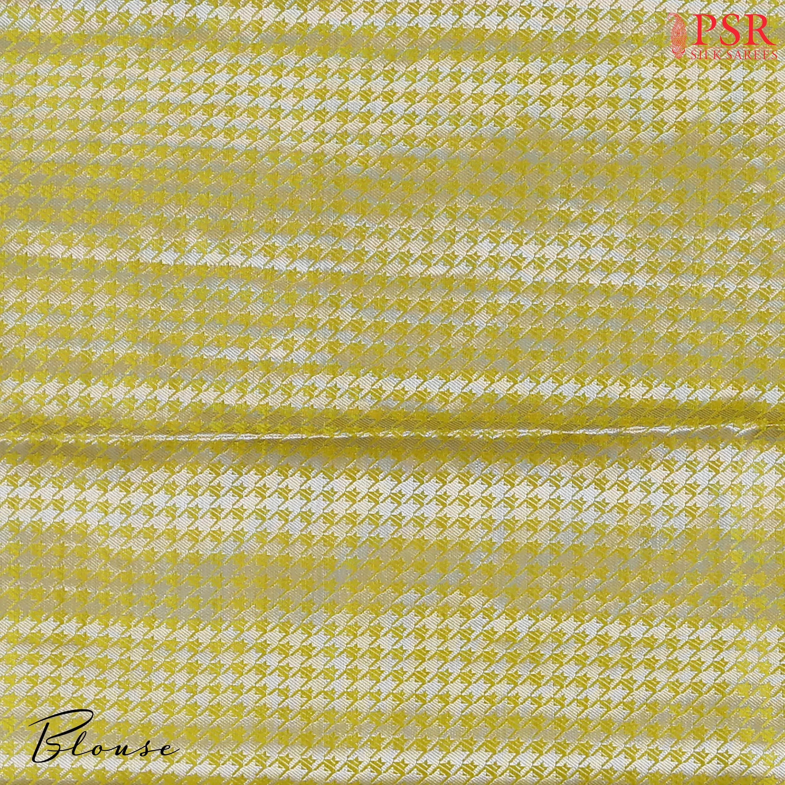 PSR Silk Sarees presents a radiant Corn Yellow Banaras Silk Saree, crafted to reflect timeless elegance and festive grandeur.