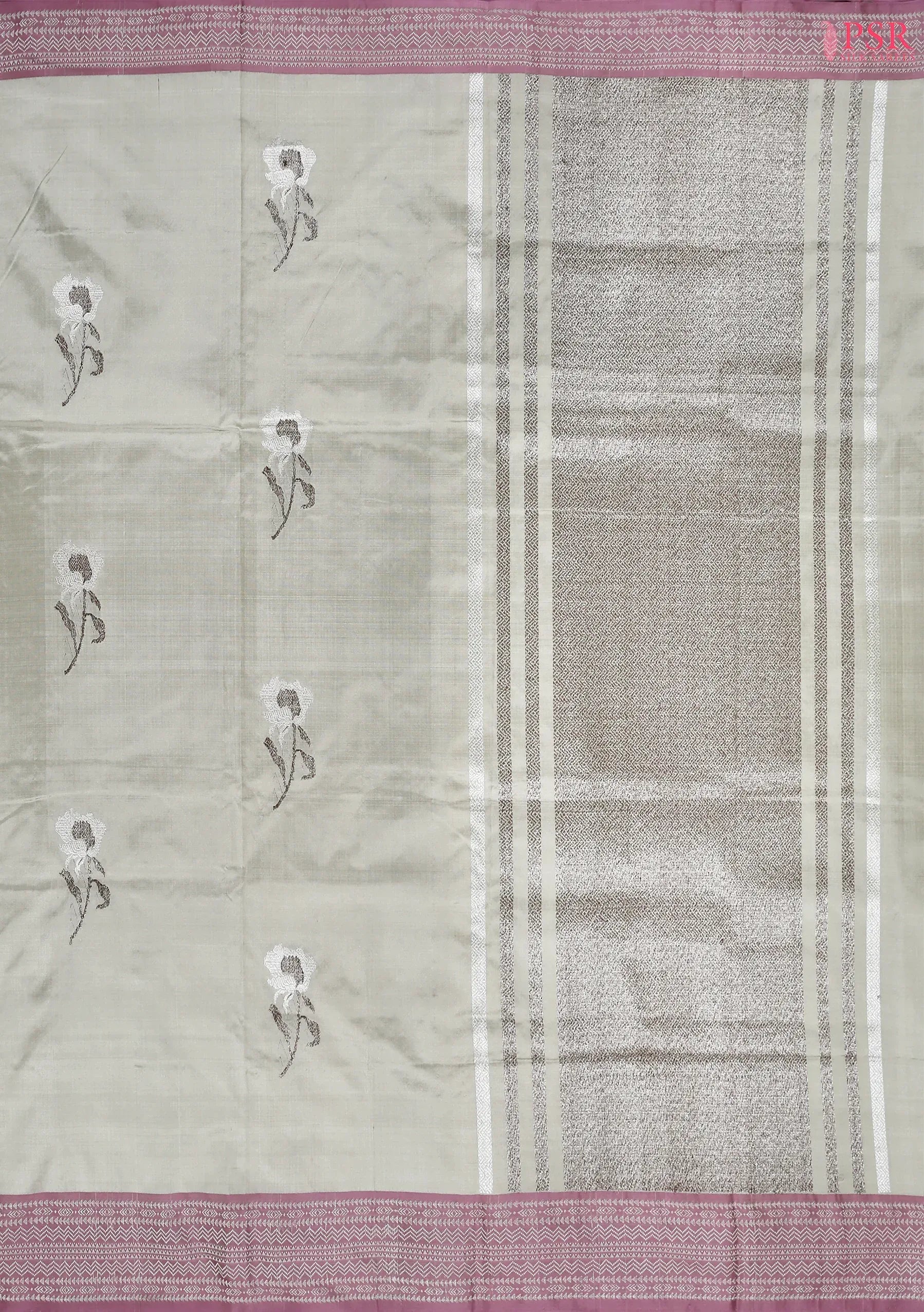 PSR Silk Sarees presents a refined Fossil Grey Banaras Katan Silk Saree, designed to exude understated luxury and timeless tradition.