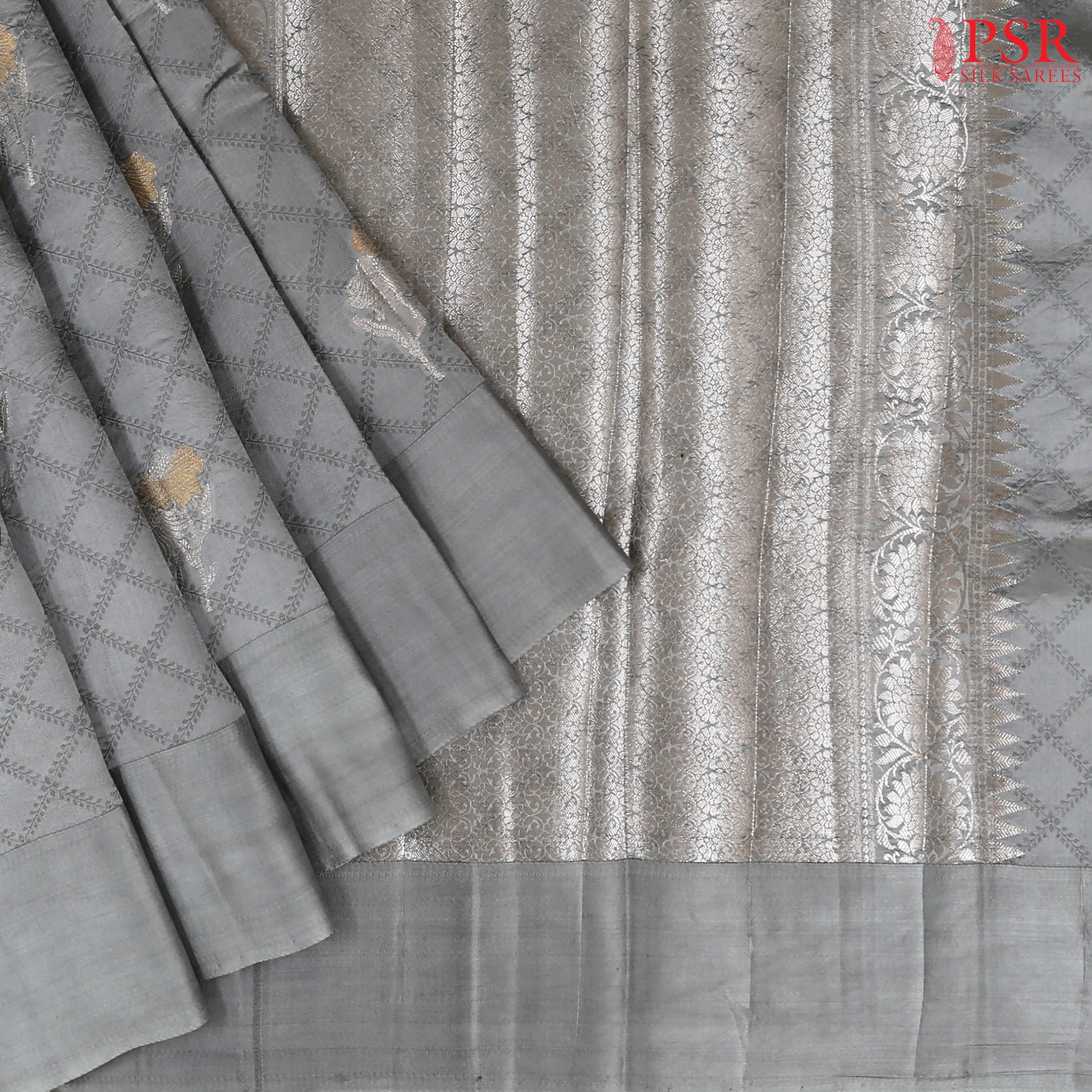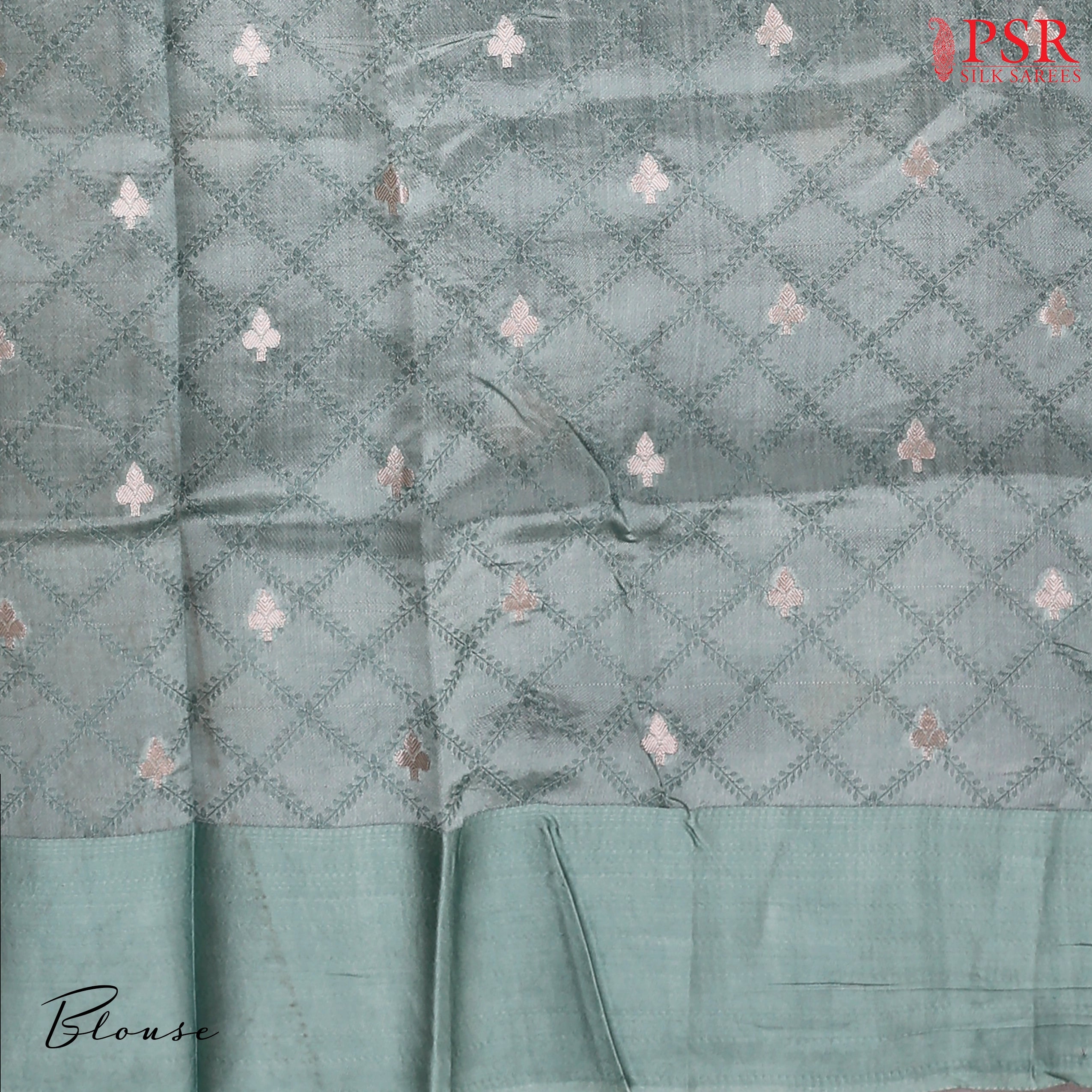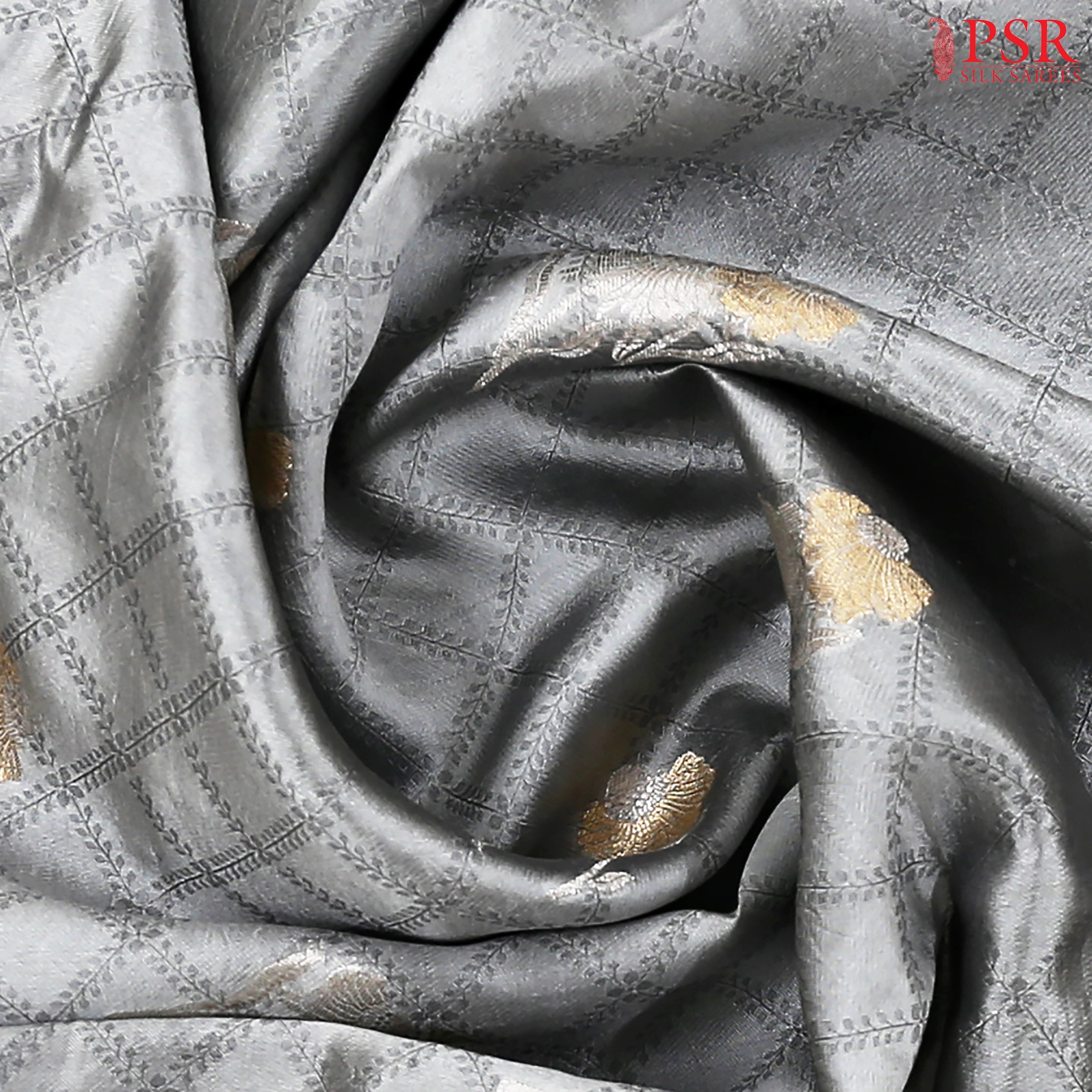 PSR Silk Sarees presents an elegant Grey Chiniya Silk Saree adorned with a charming lattice pattern enriched by delicate floral zari motifs. The saree is complemented by a traditional zari-woven pallu and a classic plain border that exudes timeless grace. Paired with a Turquoise Blue designer blouse, this ensemble beautifully blends heritage craftsmanship with contemporary appeal.