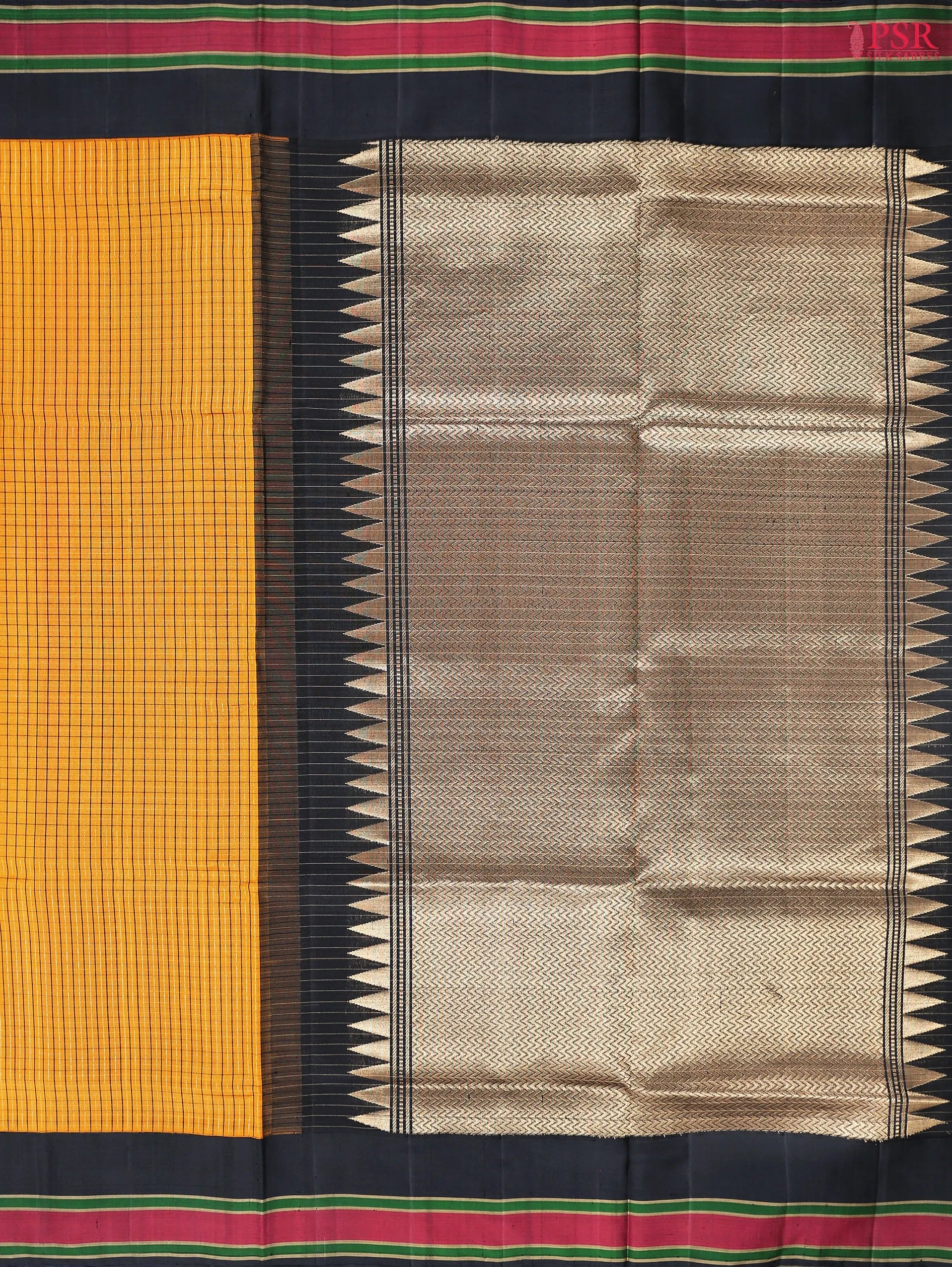 PSR Silk Sarees presents a stunning Mustard Yellow Soft Silk Saree, beautifully paired with a bold Black contrast. The saree features an elegant black and zari checks pattern, reflecting the perfect blend of tradition and sophistication. Its Black pallu is adorned with rich traditional zari work, while the classic Black Korvai border adds grandeur to the drape. Completing the ensemble is a matching Black blouse with zari stripes, making it an ideal choice for festive occasions, weddings, and cultural gatherings.