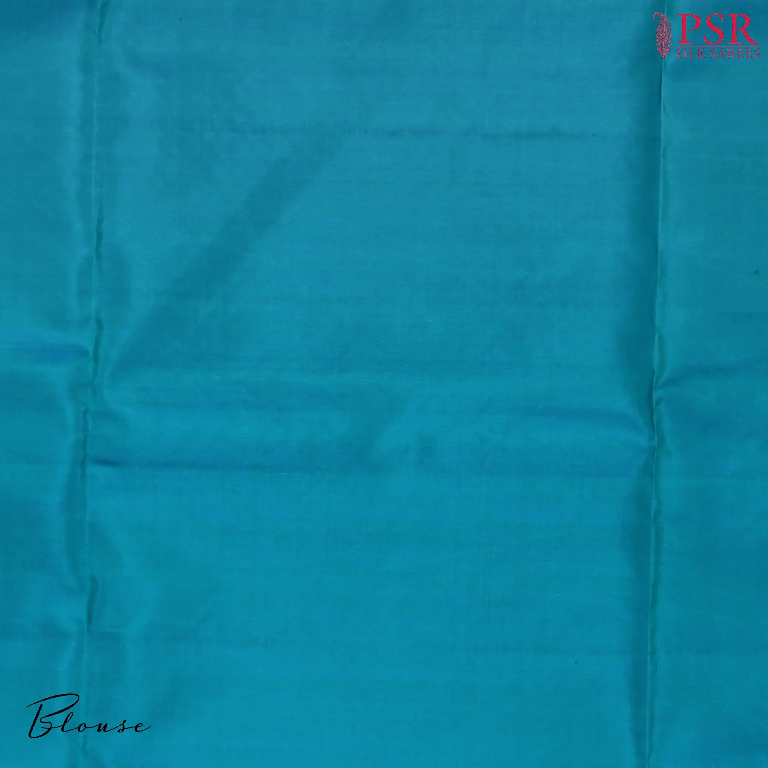The saree features a beautiful thread checkered pattern, lending it a refined and elegant texture. It is accentuated with a contrasting Peacock Blue pallu and a broad traditional zari border, adding richness to the overall appeal. The ensemble is completed with a plain Peacock Blue blouse, perfectly complementing the saree’s vibrant hues.