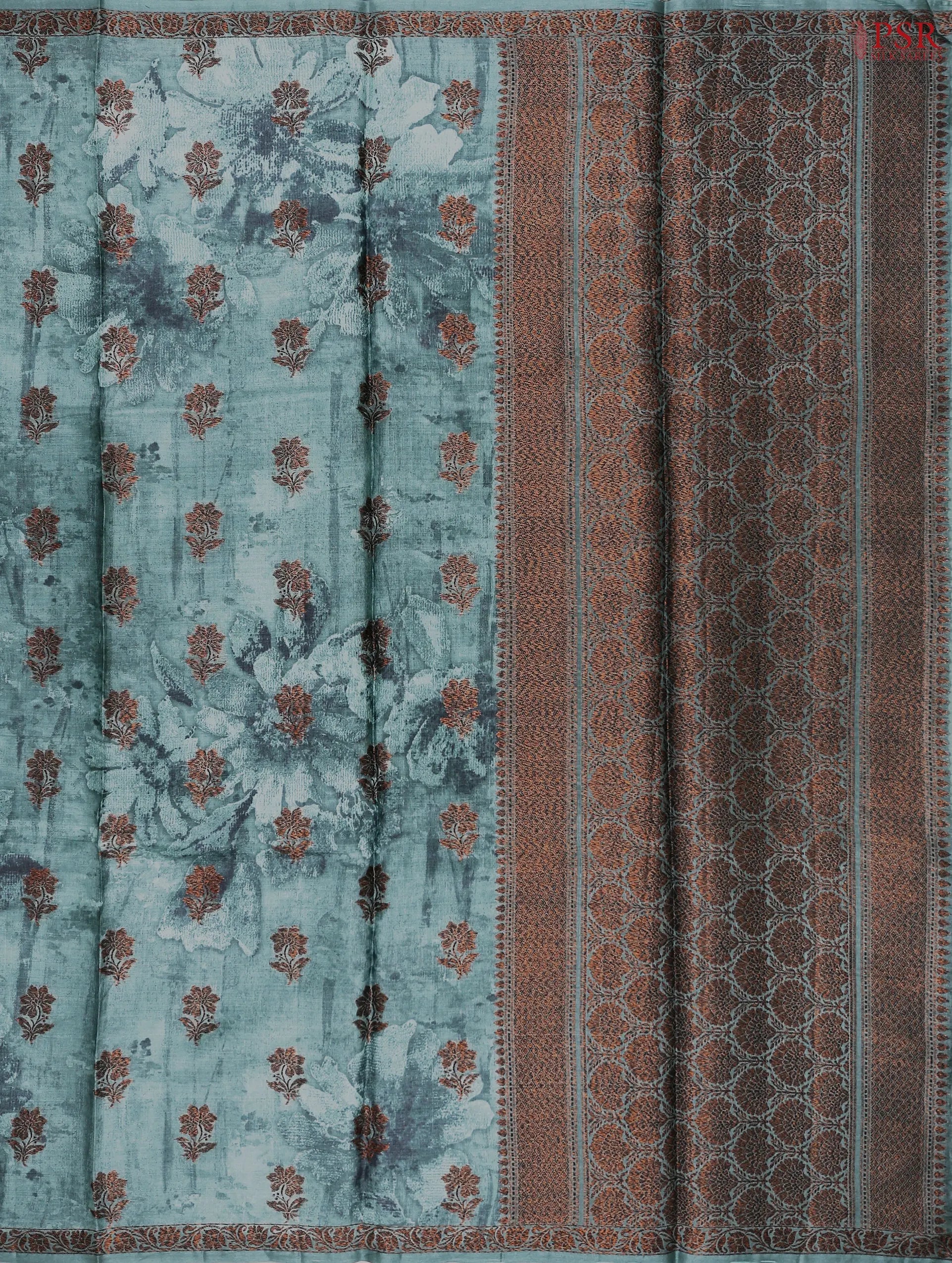 PSR Silk Sarees presents an elegant Steel Teal Banaras Tussar Cut Work Saree, a perfect blend of contemporary artistry and timeless tradition.