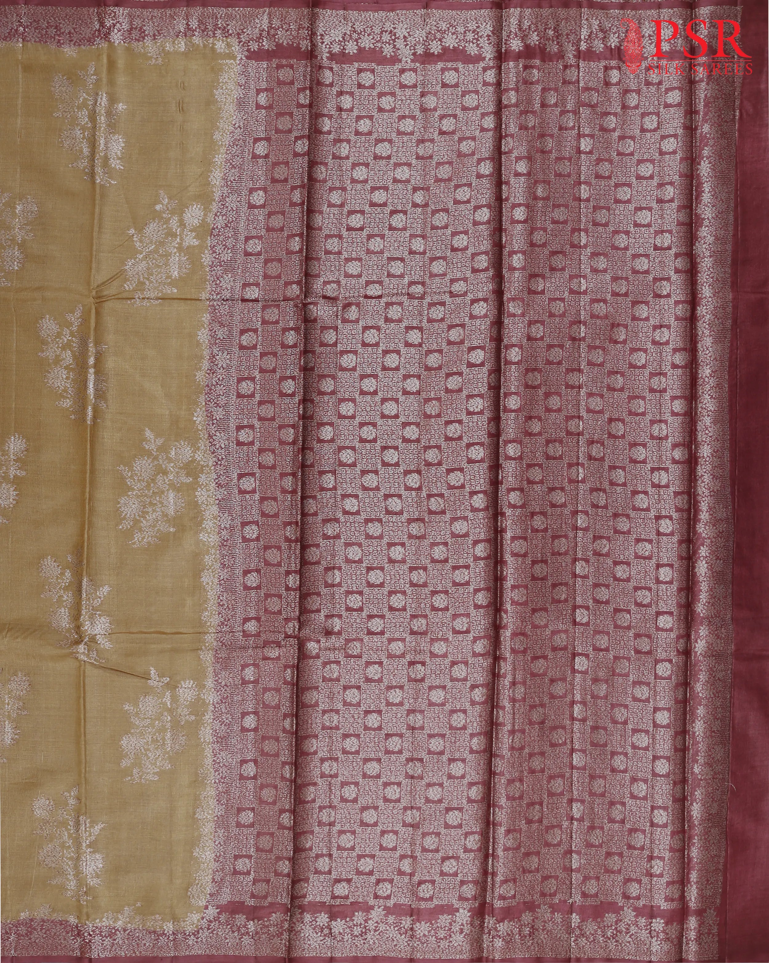 PSR Silk Sarees presents a Tortilla Brown delicate Banaras Tussar Silk saree, beautifully paired with an elegant Rosewood Brown combination.