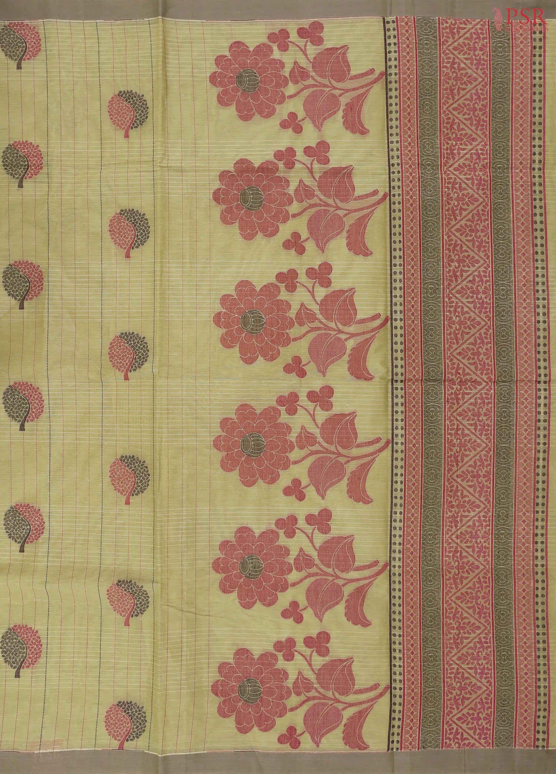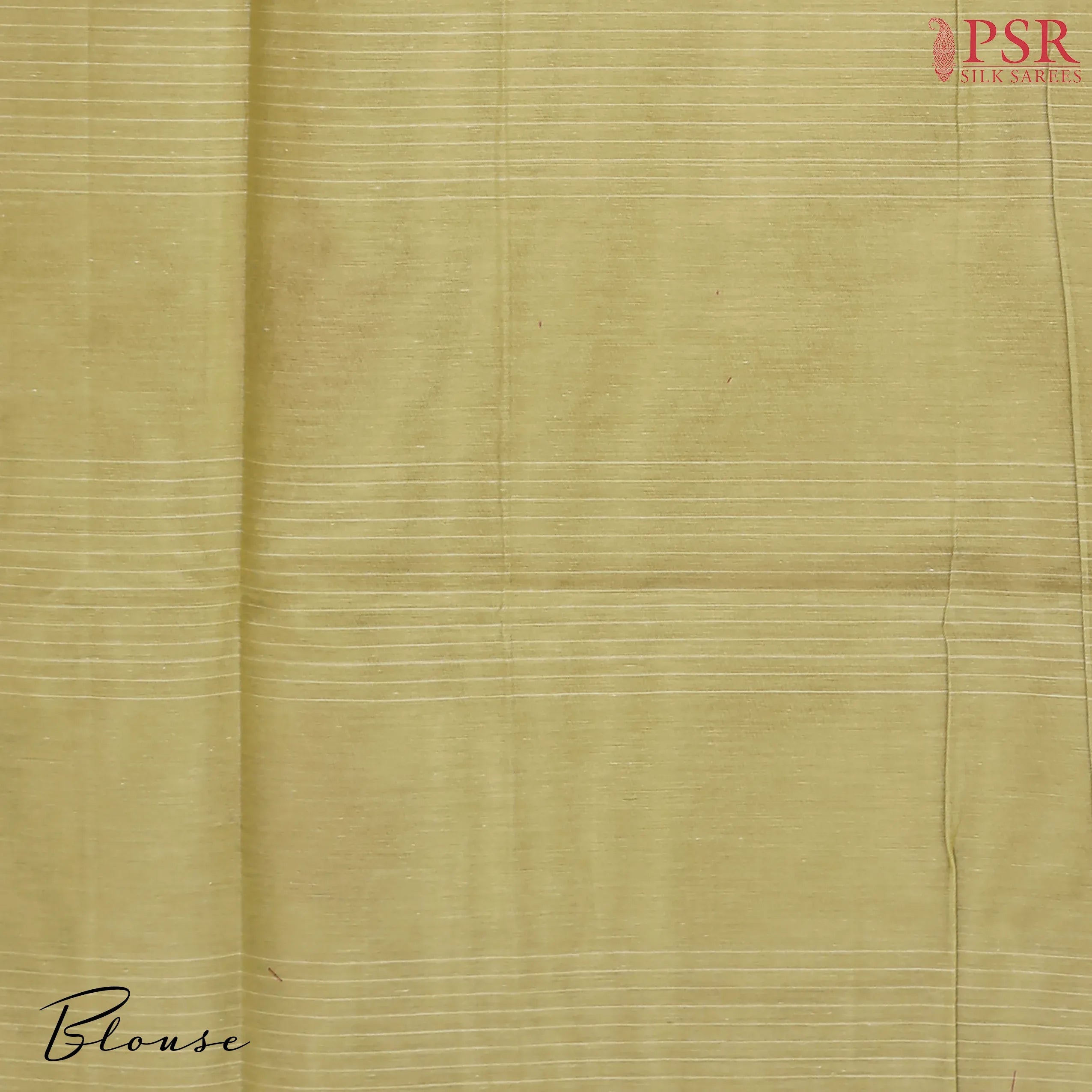 PSR Silks presents a traditional Kovai Cotton saree in a captivating Warm Olive, beautifully weaved with red & brown thread work.