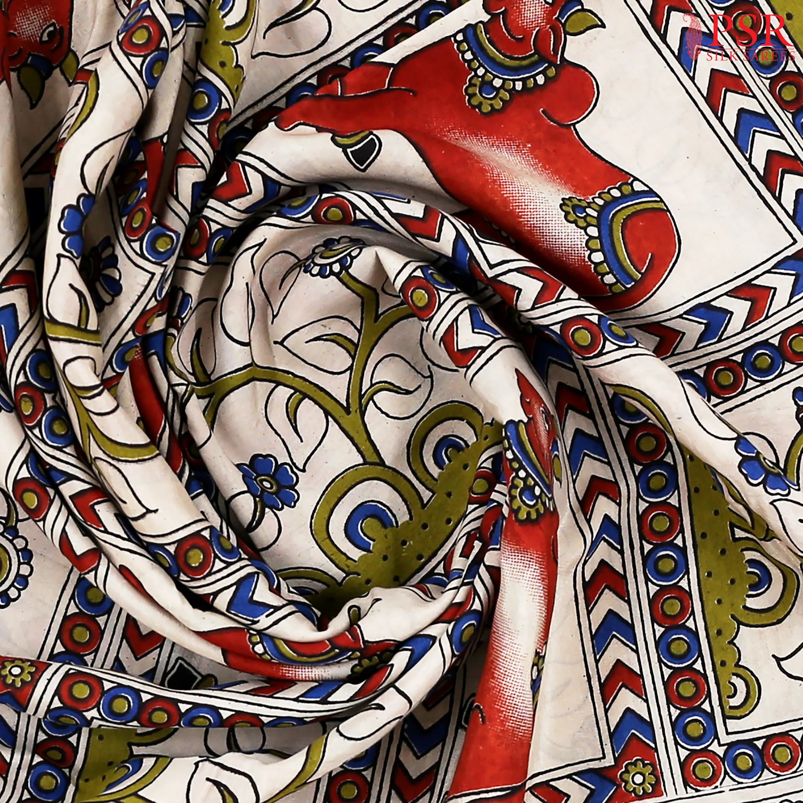 PSR Silk Sarees presents a Antique Red & Beige Kalamkari Silk printed saree.