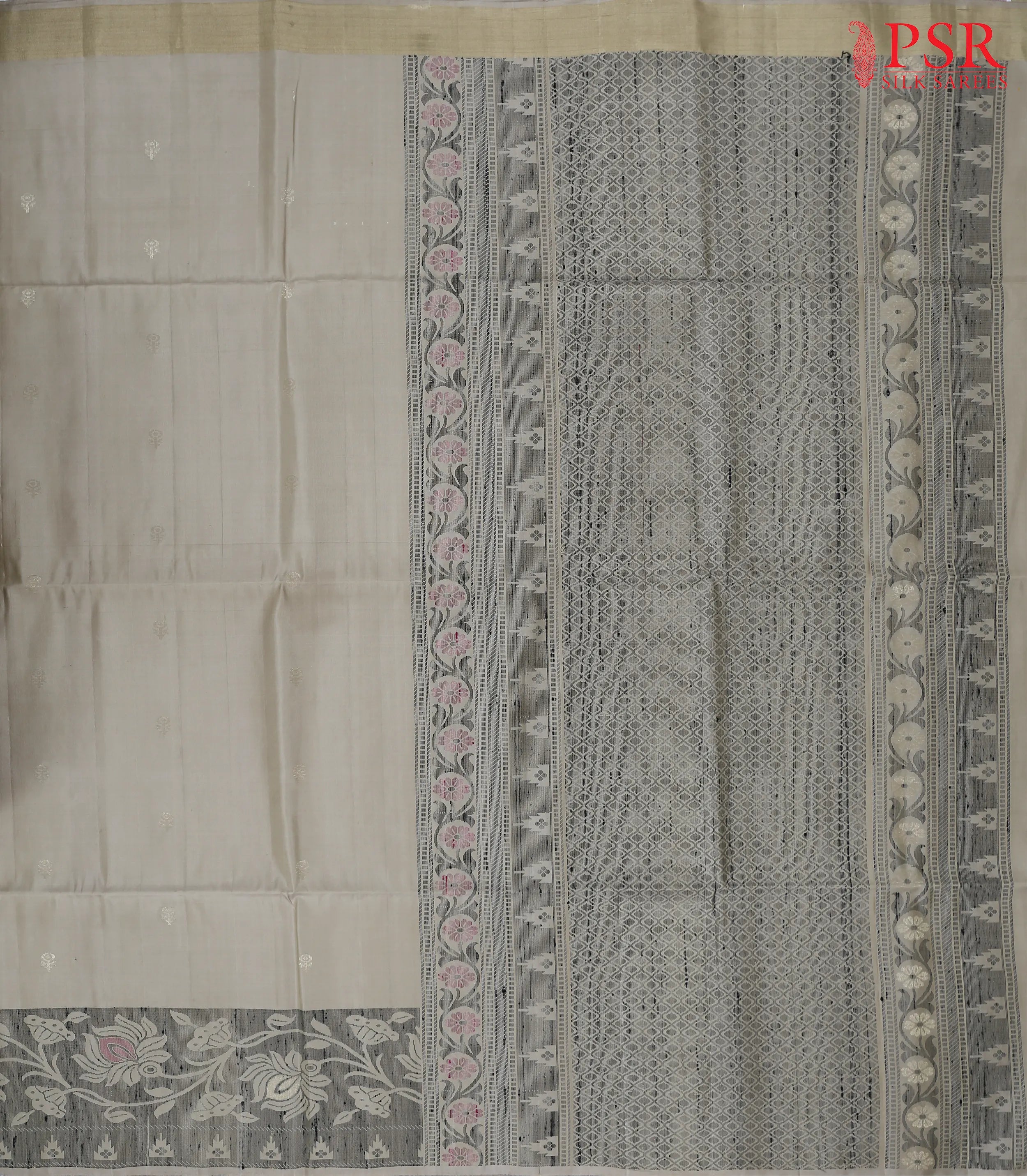 This beautiful saree features simple and small floral zari motifs that add a touch of refined sophistication to its body. It is paired with a Black pallu enriched with intricate thread work and golden zari detailing, perfectly complemented by a matching Black zari border. The saree is attached with a plain matching blouse to complete the ensemble.