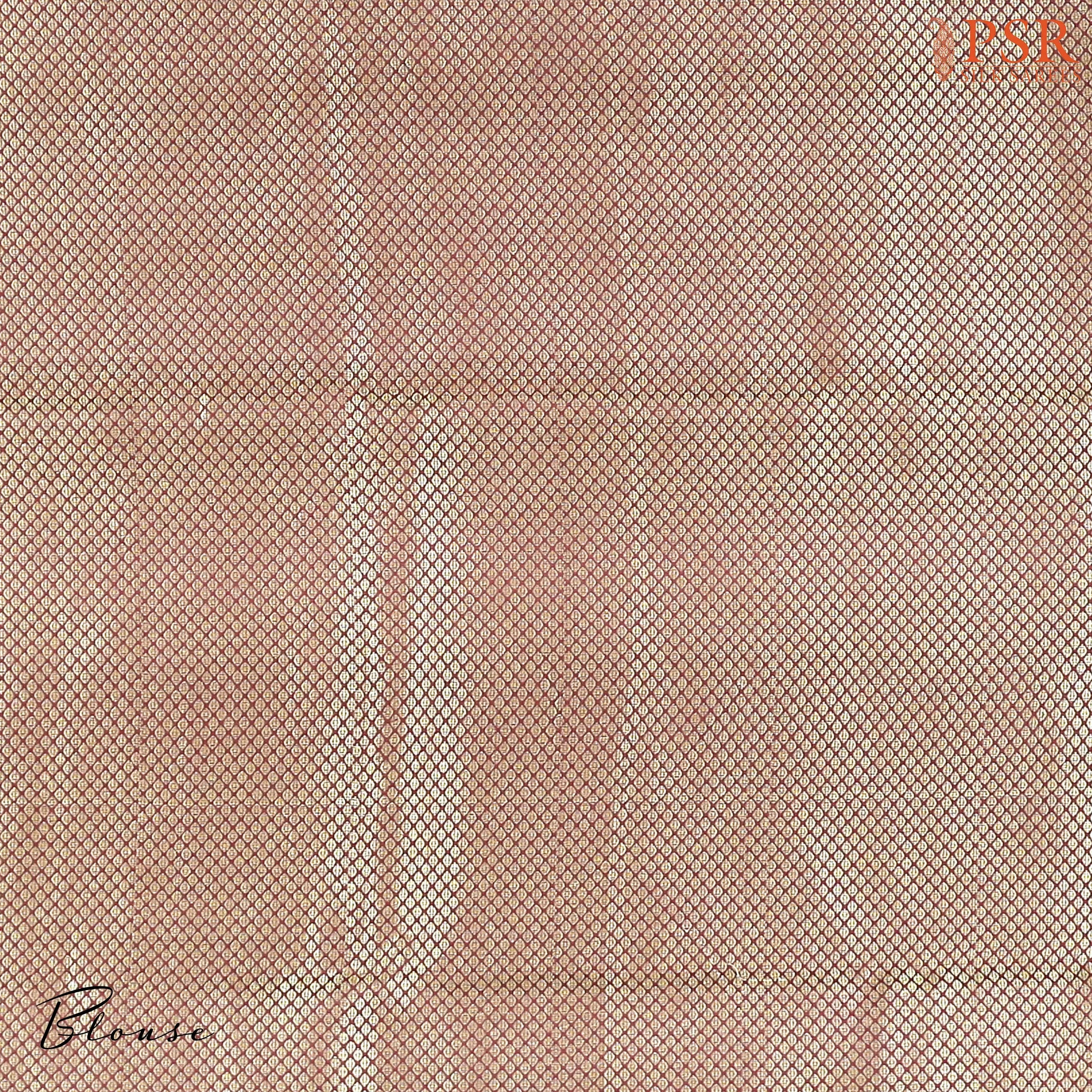 The saree features a delicate zari checks pattern, adding subtle texture and charm. It is complemented by a traditional zari work pallu and matching border, enhancing its timeless appeal. Completing the ensemble is a plain matching blouse, making it a versatile choice for festive and formal occasions.