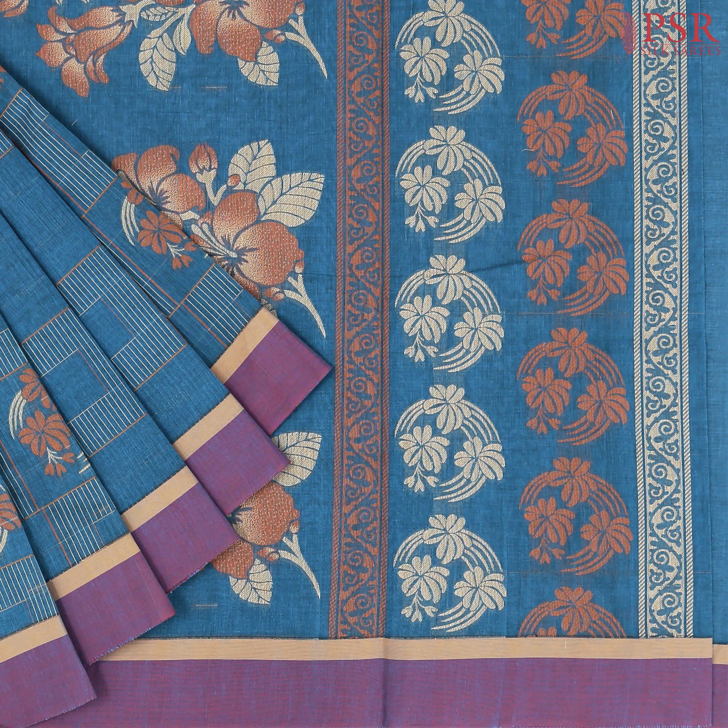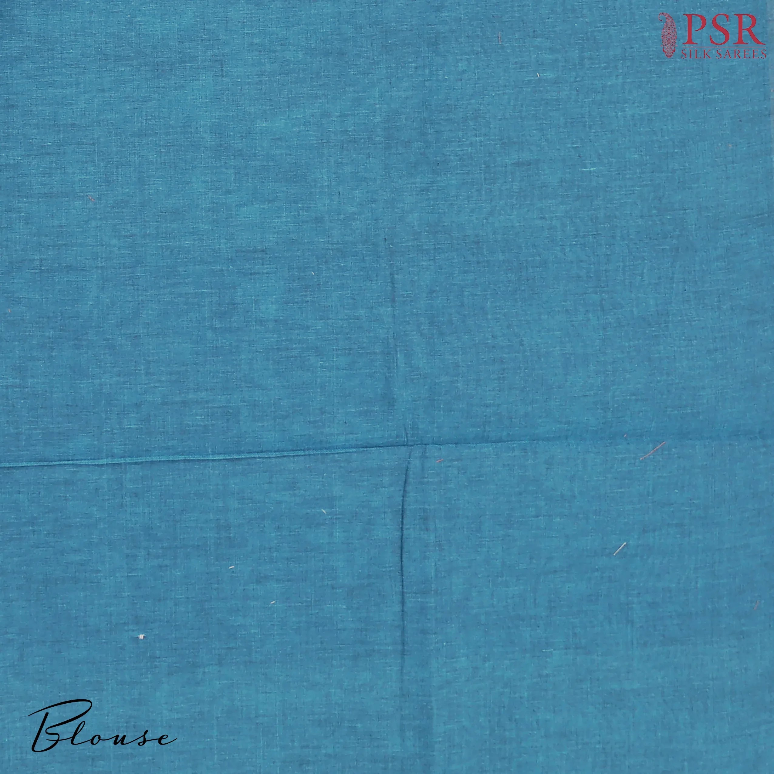 PSR Silks presents a traditional Kovai Cotton saree in a captivating Cerulean Blue, beautifully weaved with beige & orange thread work.