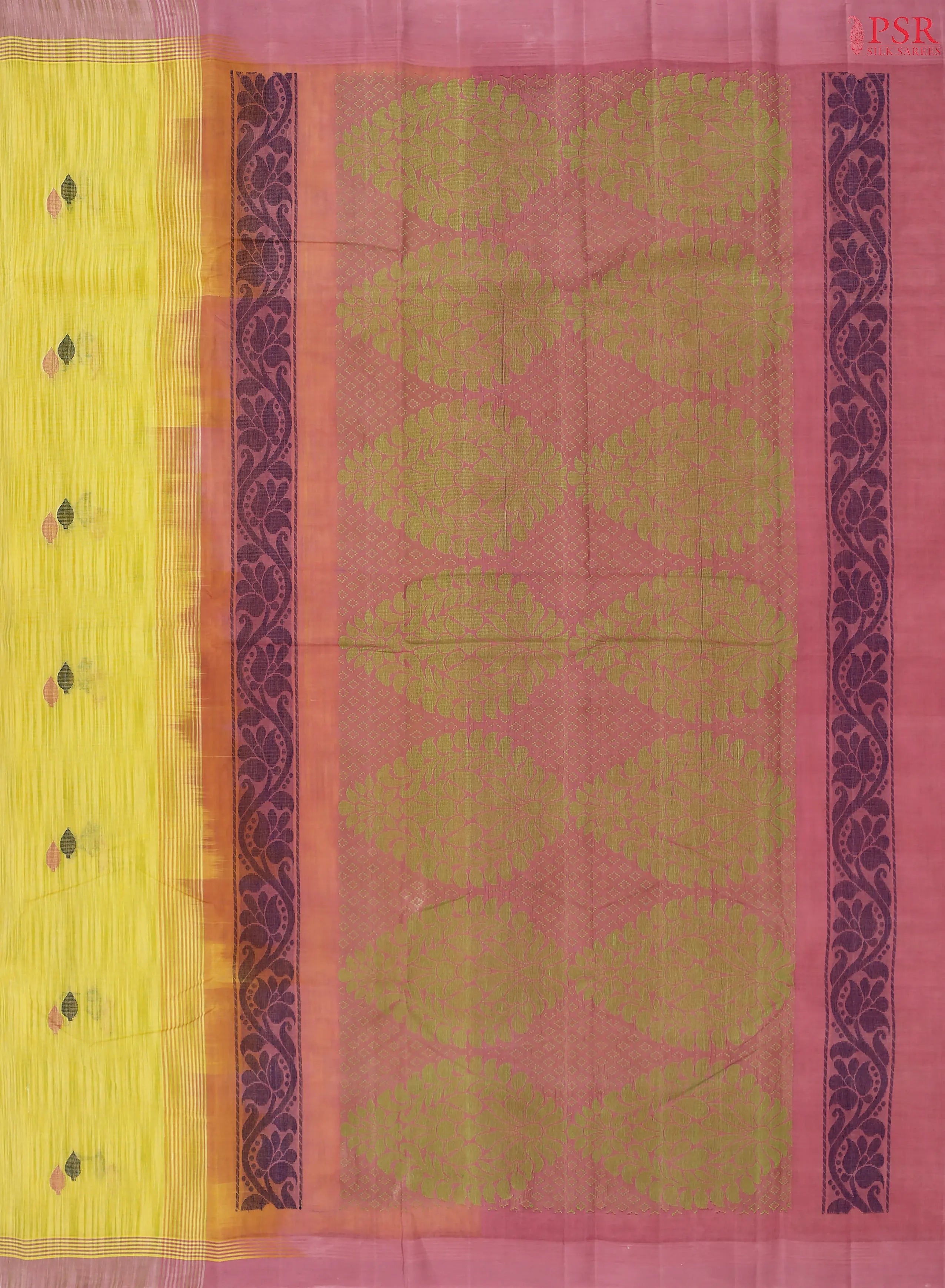 PSR Silks presents a traditional handloom Kanchi Cotton saree in a captivating Corn Yellow, beautifully weaved with Pink combination.