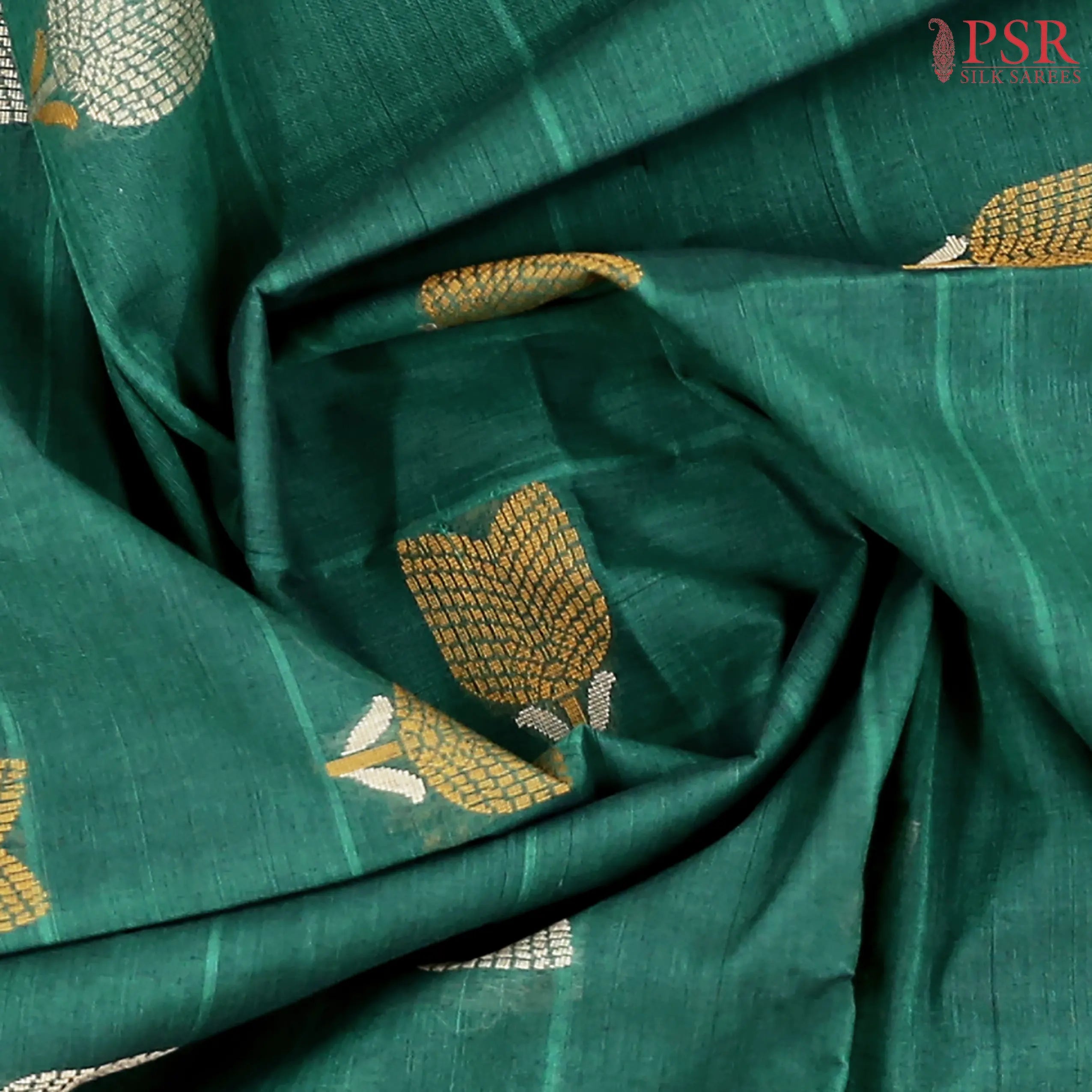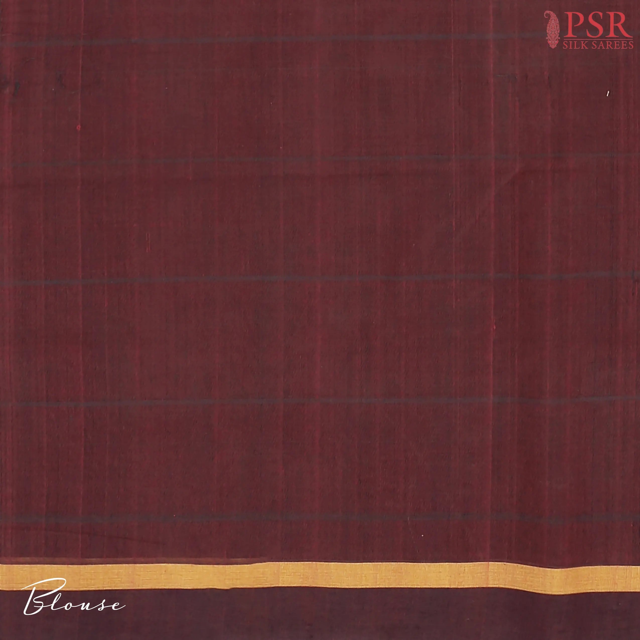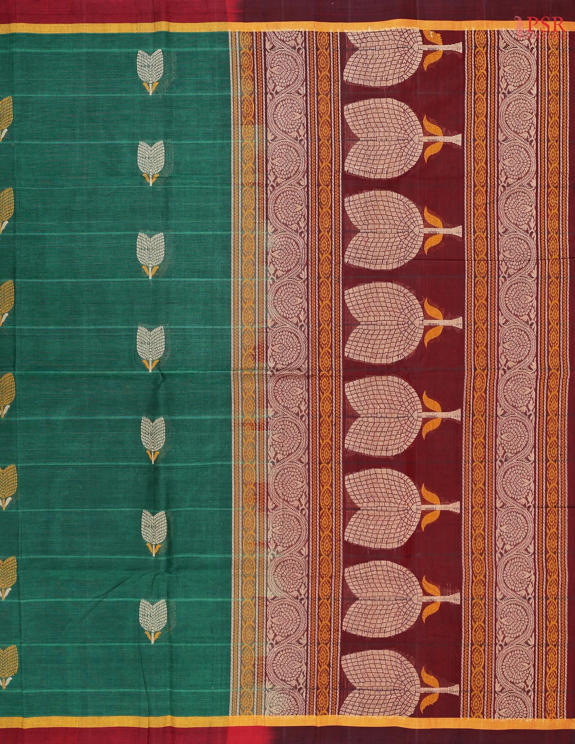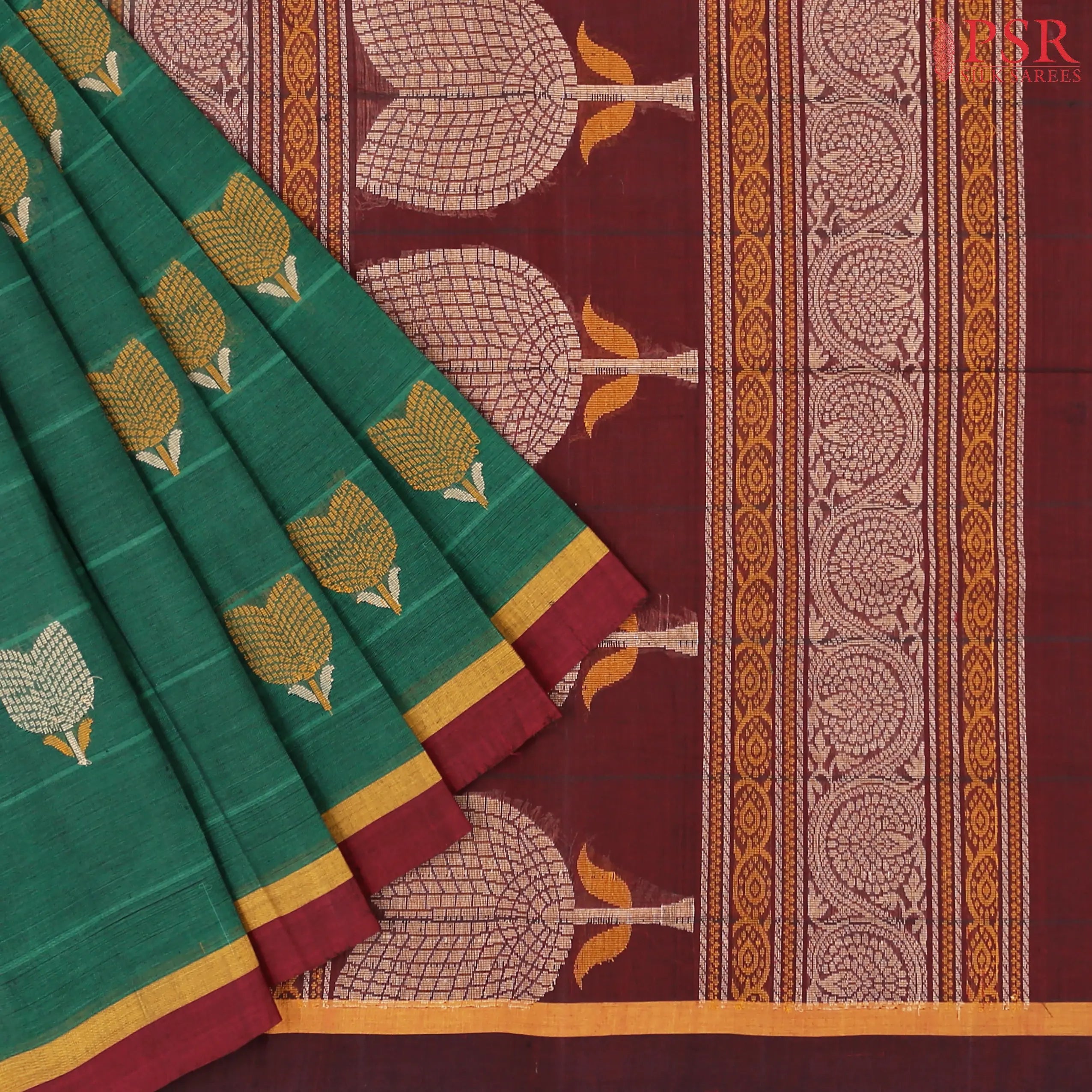 PSR Silks presents a traditional handloom Kovai Cotton saree in a captivating Dark Green, beautifully weaved with Dark Maroon combination.