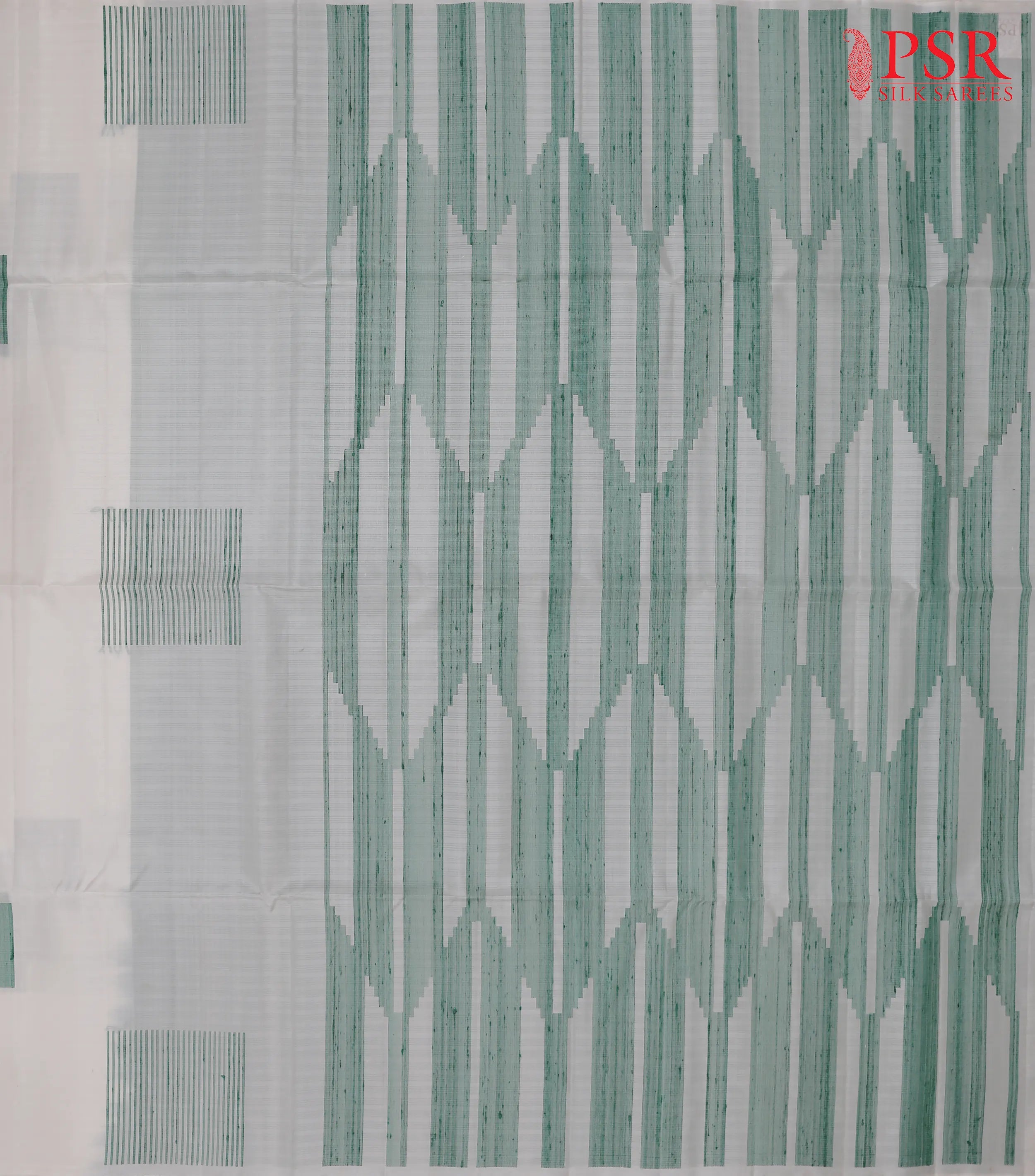 PSR Silk Sarees presents a Dove White Soft Silk saree paired with a refreshing Viridian Green combination, radiating modern elegance with traditional charm.