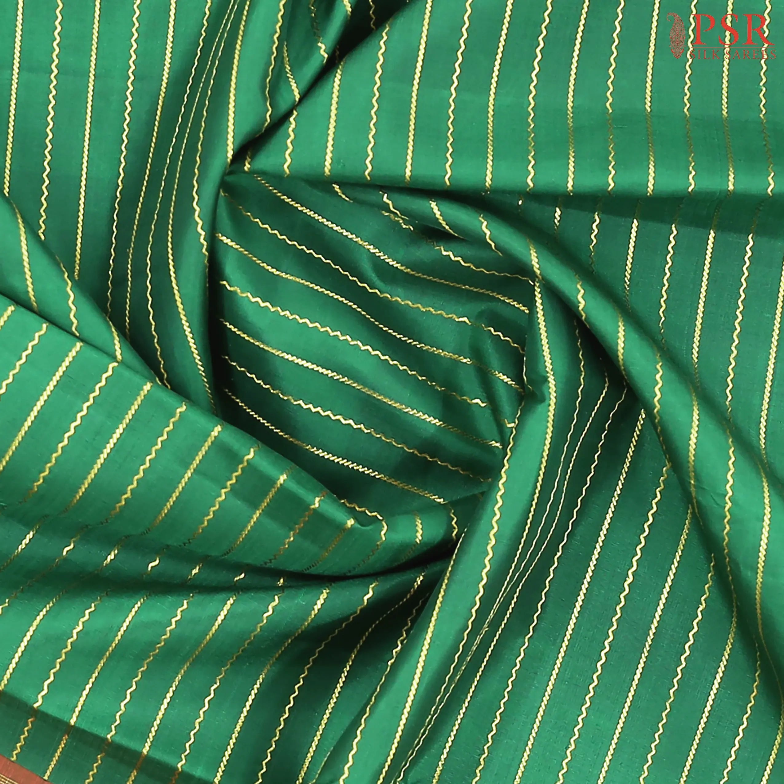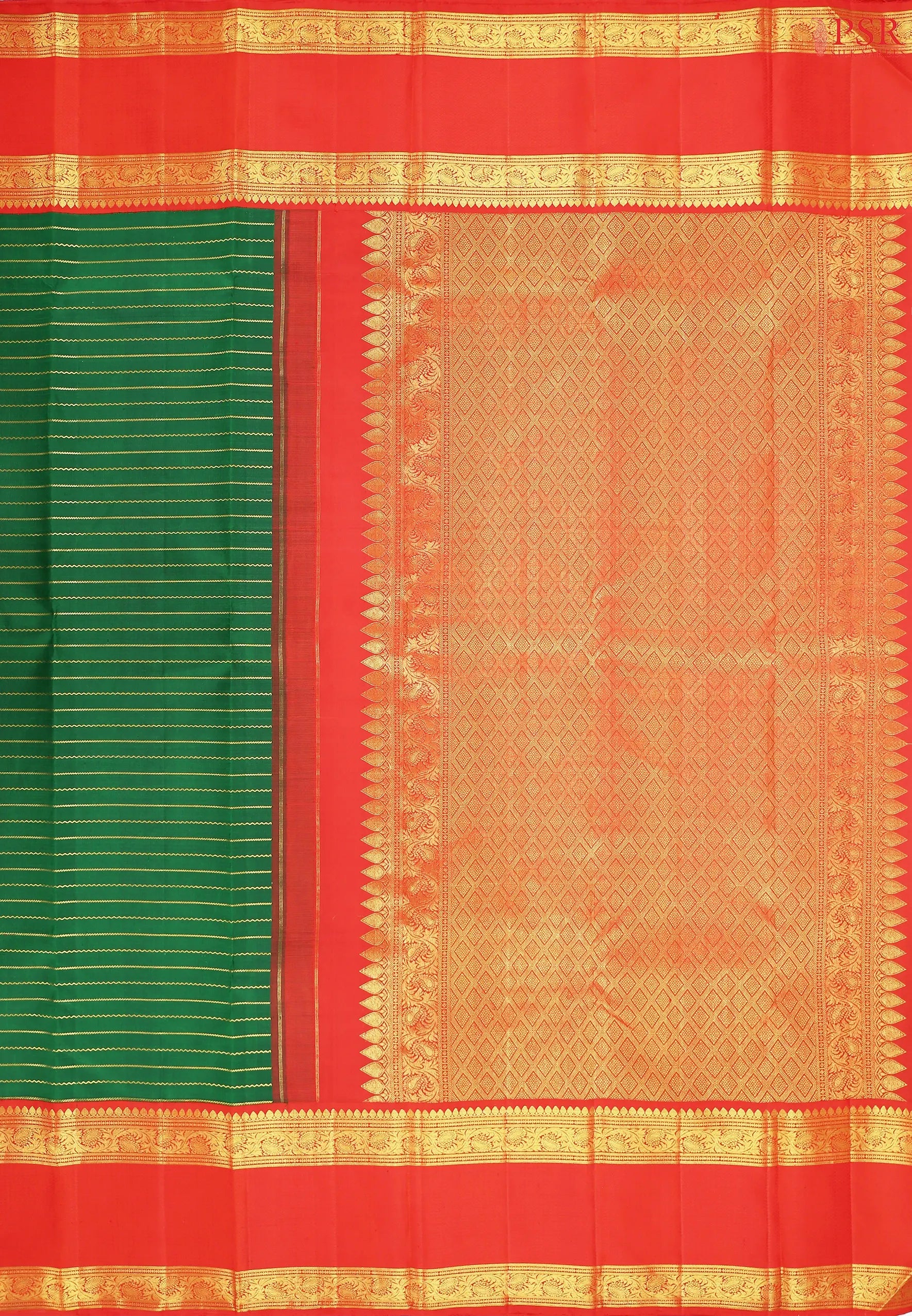 PSR Silk Sarees presents a charming Emerald Green Kanchipuram Silk Saree paired with a delightful Saffron combination, radiating youthful elegance and festive grace.