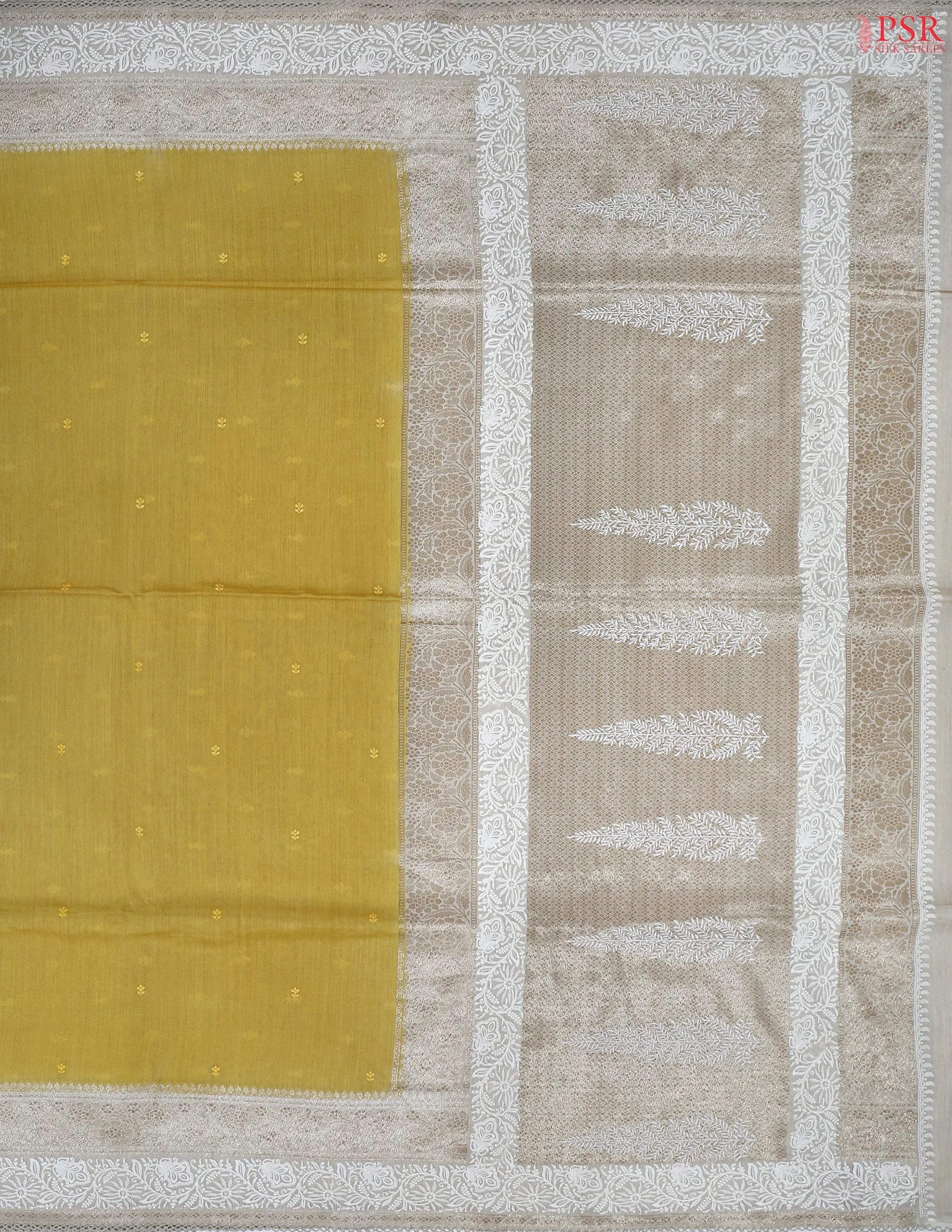 PSR Silk Sarees presents a graceful Flaxen Yellow Munga Silk Saree, beautifully complemented by a Floral Beige combination for a refined and elegant appeal.
