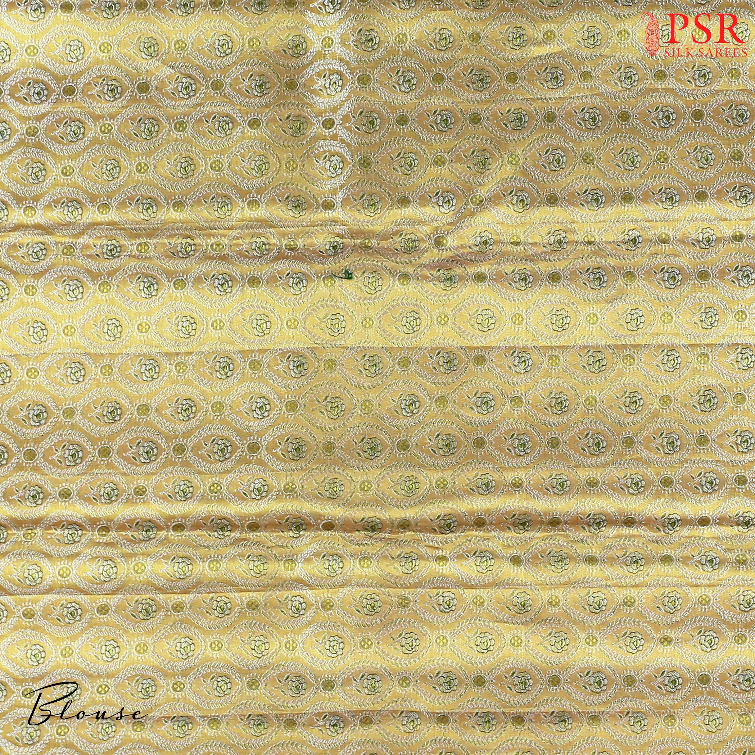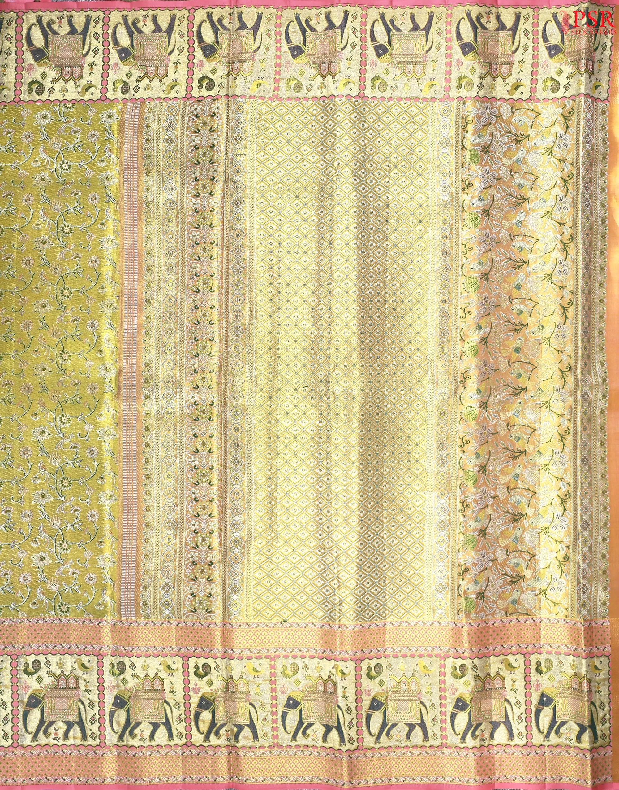 PSR Silk Sarees unveils a radiant symbol of grandeur – the Golden Olive Kanchipuram Tissue Jacquard Silk Saree, elegantly paired with a regal Pink. Exuding royal sophistication and timeless charm, this masterpiece features a luminous tissue body, adorned with intricate scroll floral jacquard work.