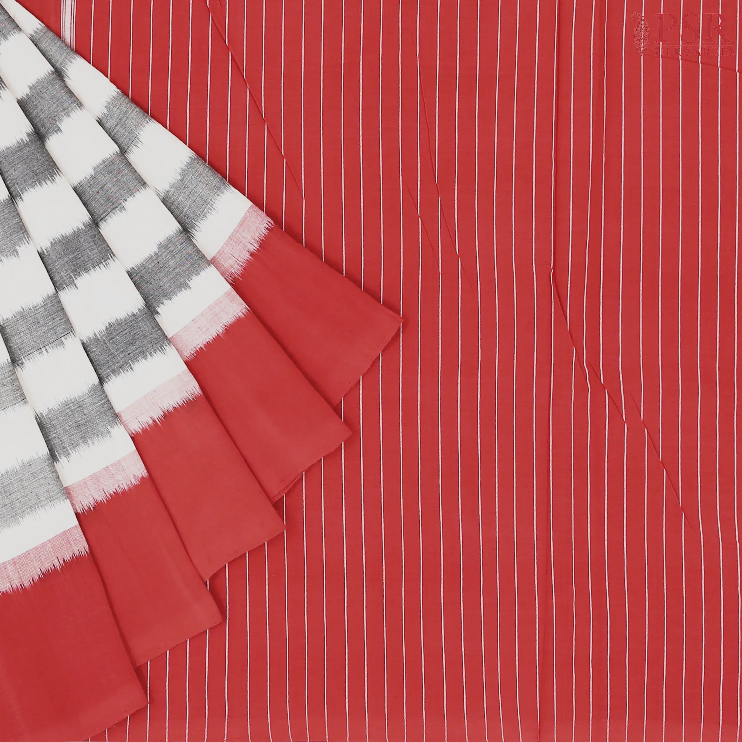 PSR Silk Sarees presents a Grey & Floral White colored Ikkat cotton saree with combination of Red color.