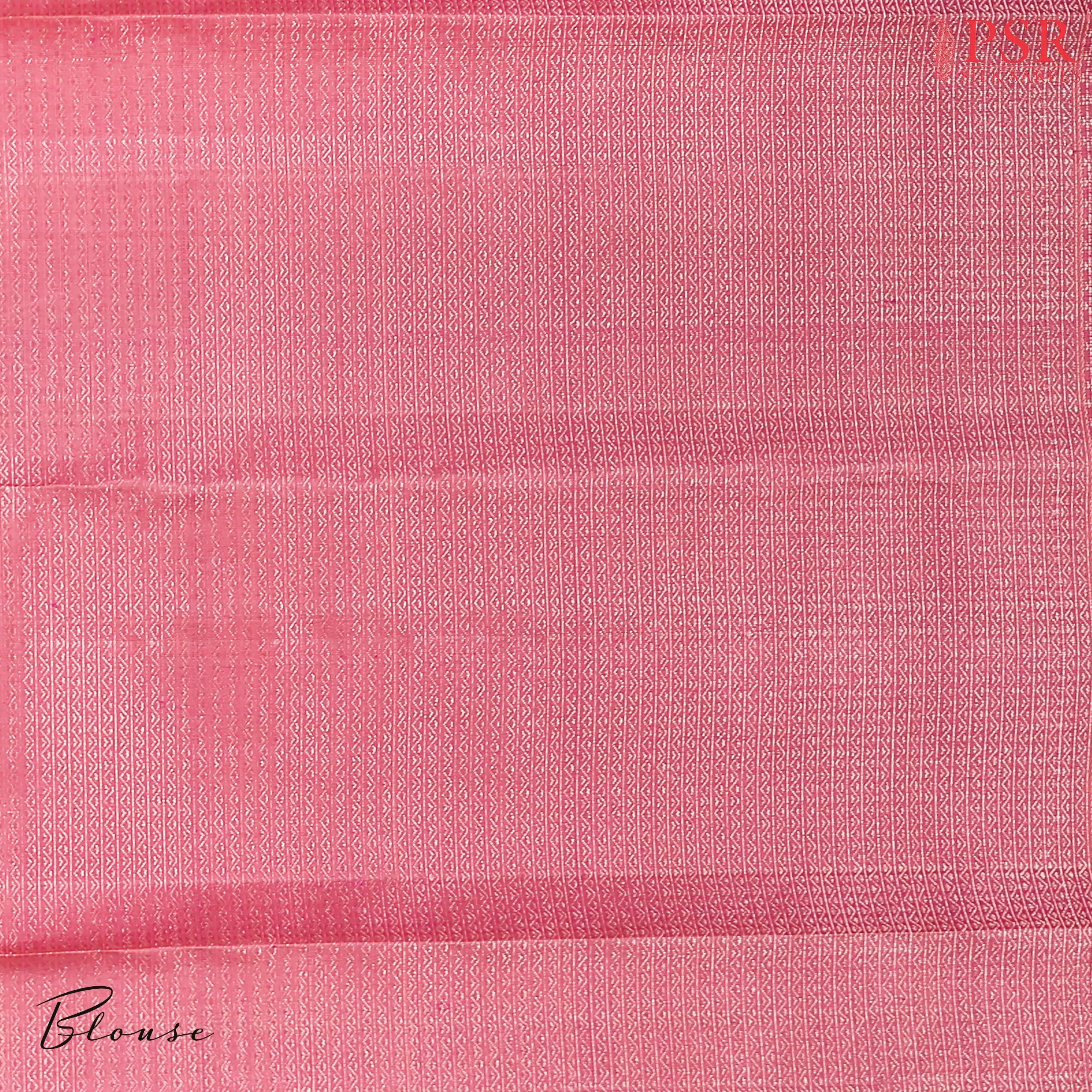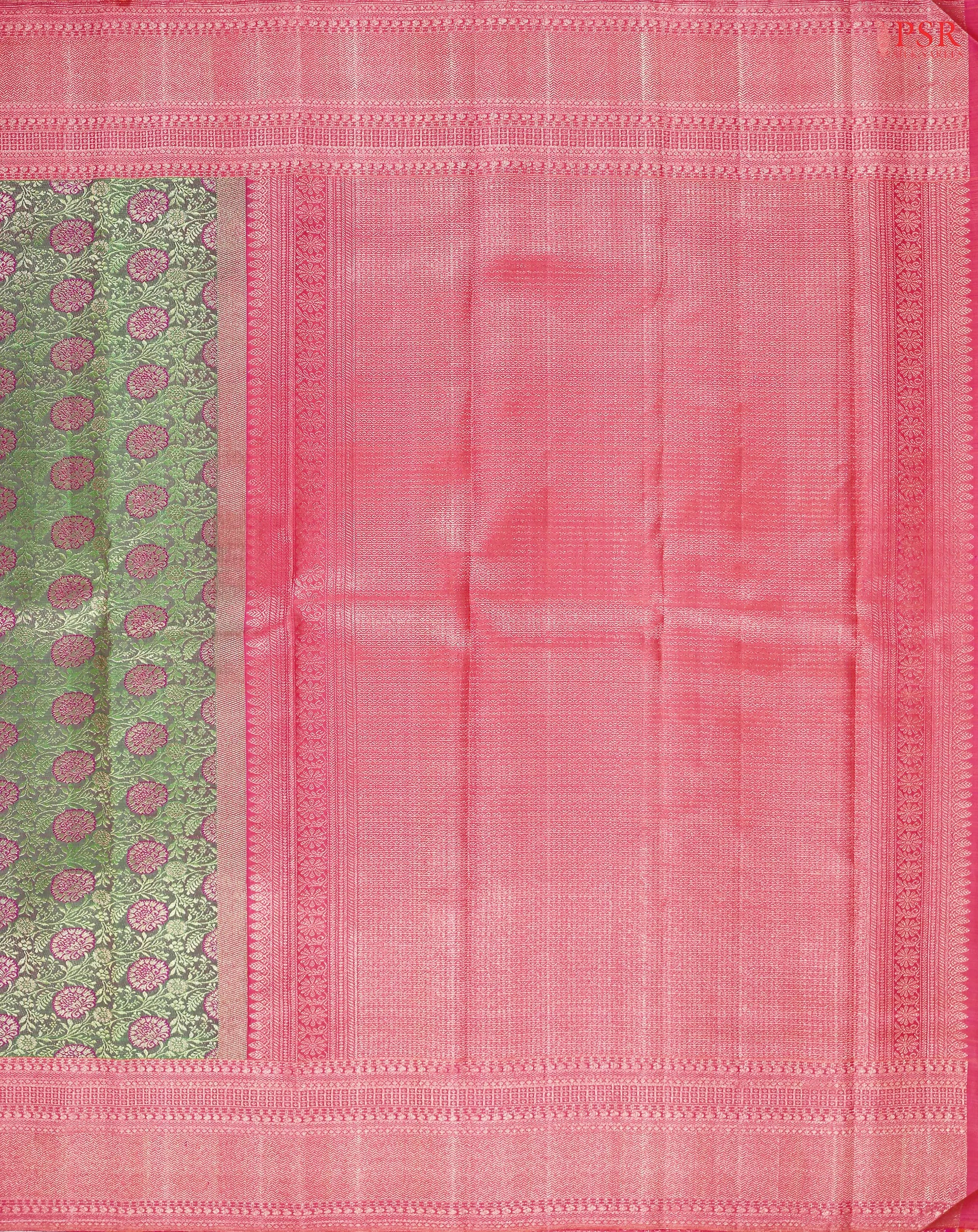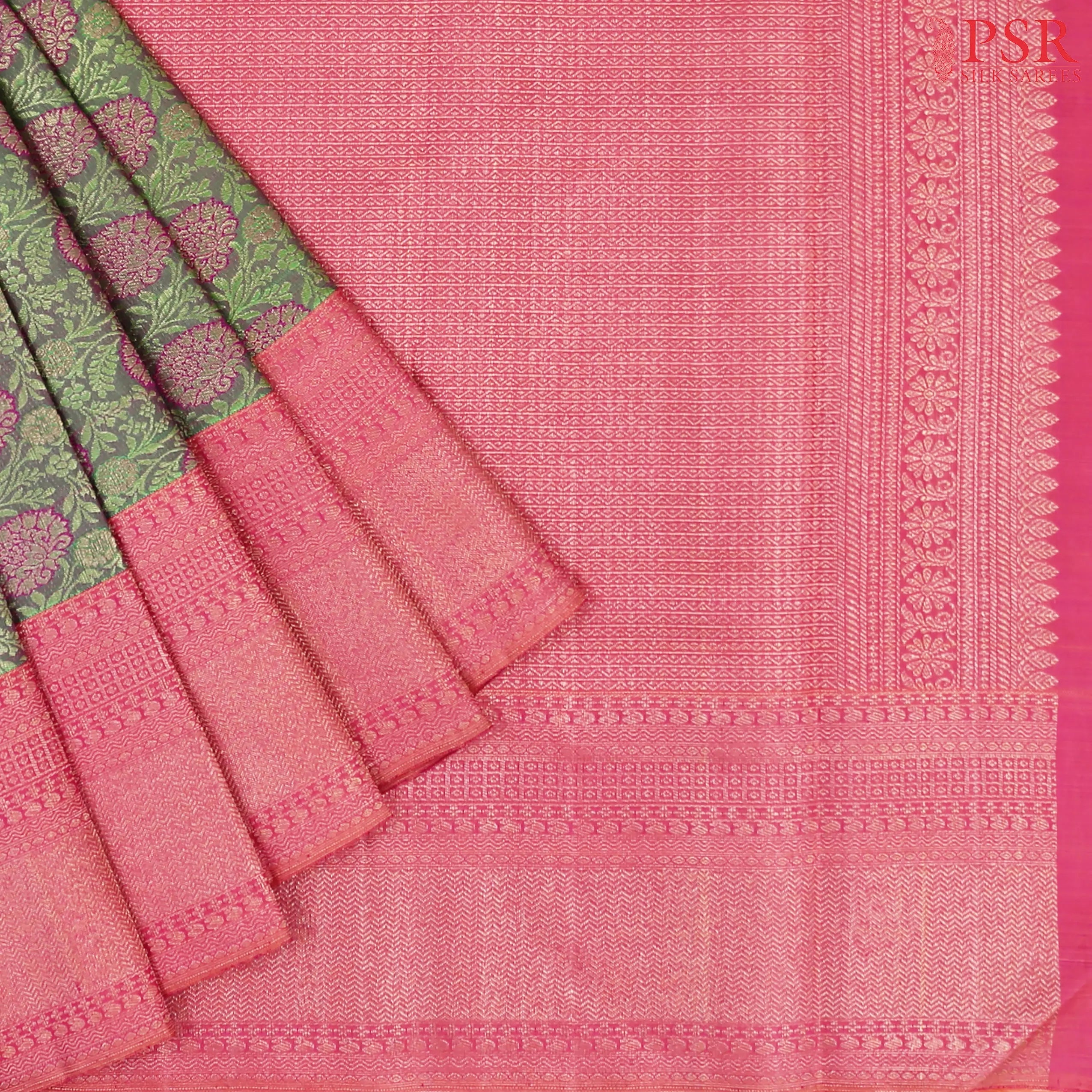 PSR Silk Sarees presents a radiant Greyish Green Kanchipuram Jacquard Silk Saree, paired with a graceful Persian Pink contrast.