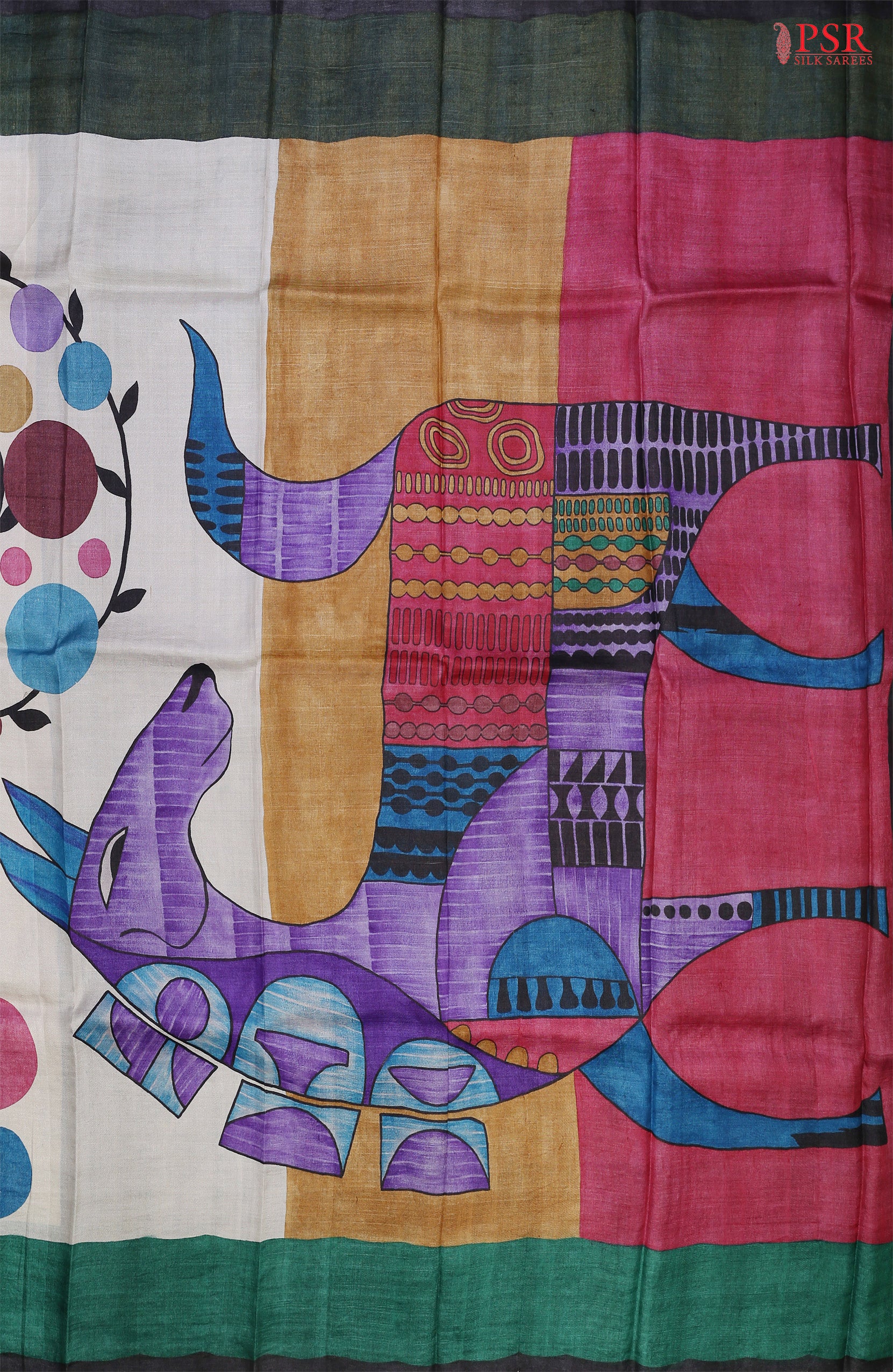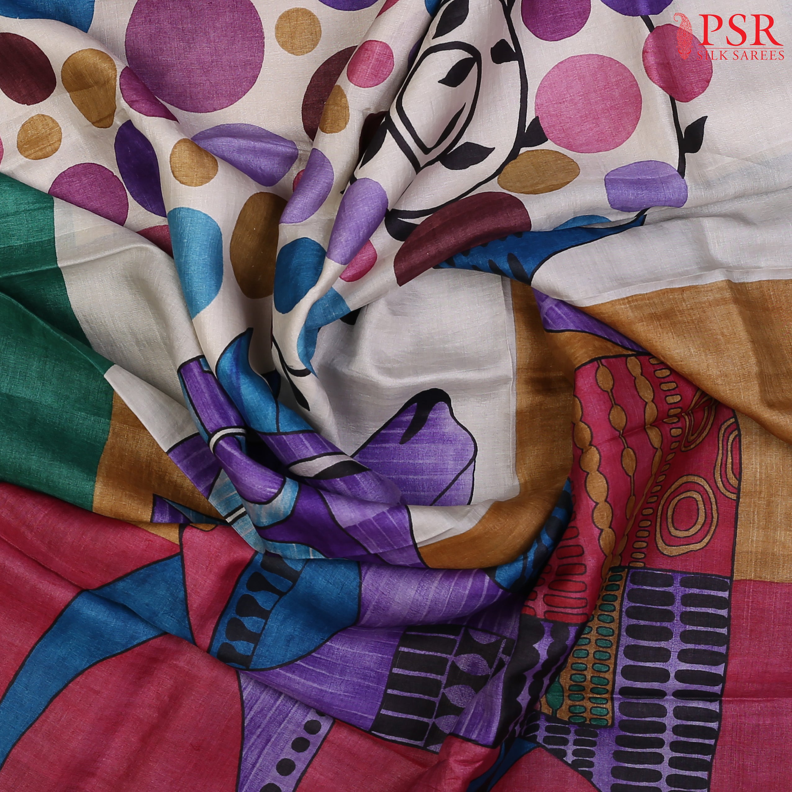 PSR Silks presents an elegant Off-White Khadi Tussar Silk Saree, beautifully complemented with a striking Dark Green combination. This saree features playful multicolor polka prints throughout, enhanced by contemporary designer prints on the pallu.